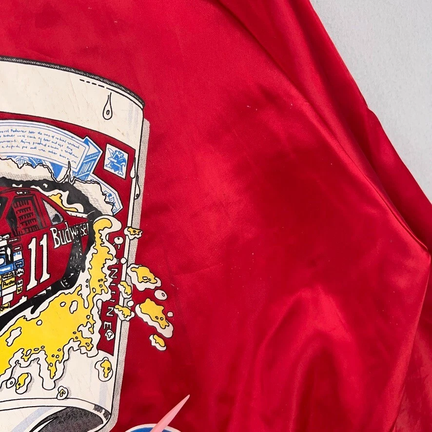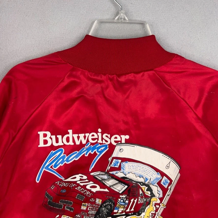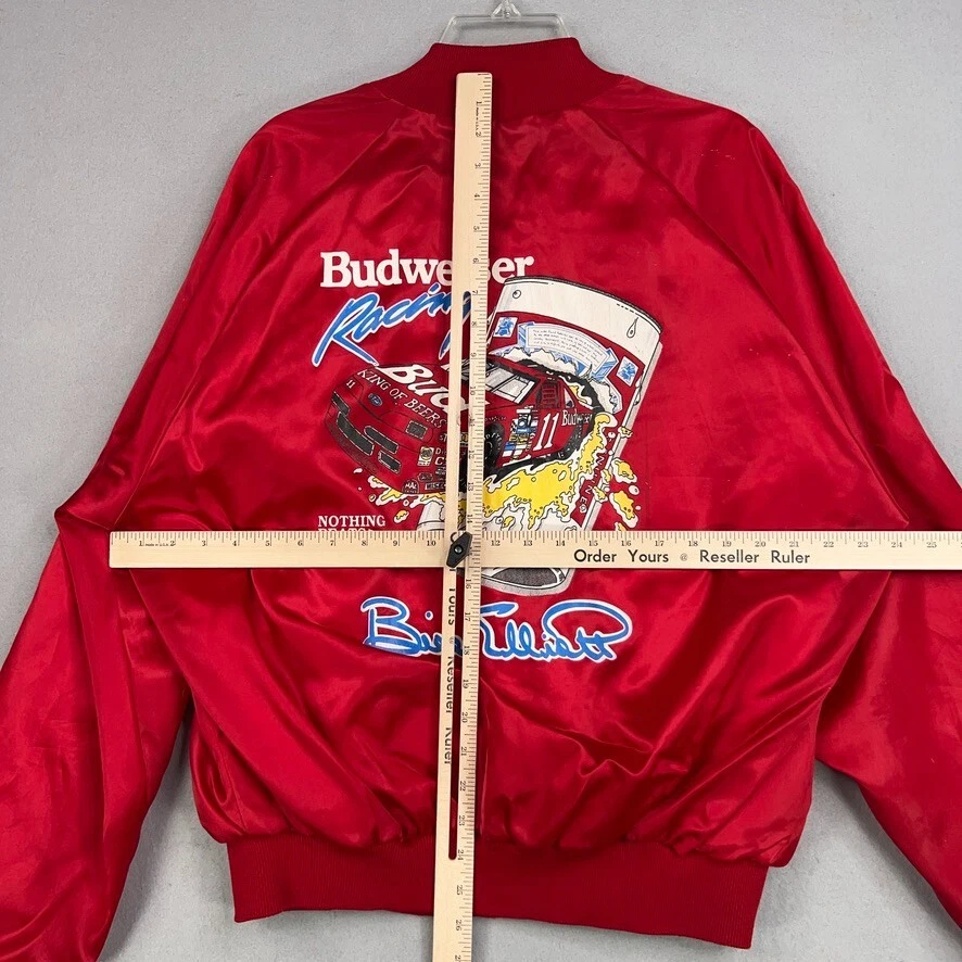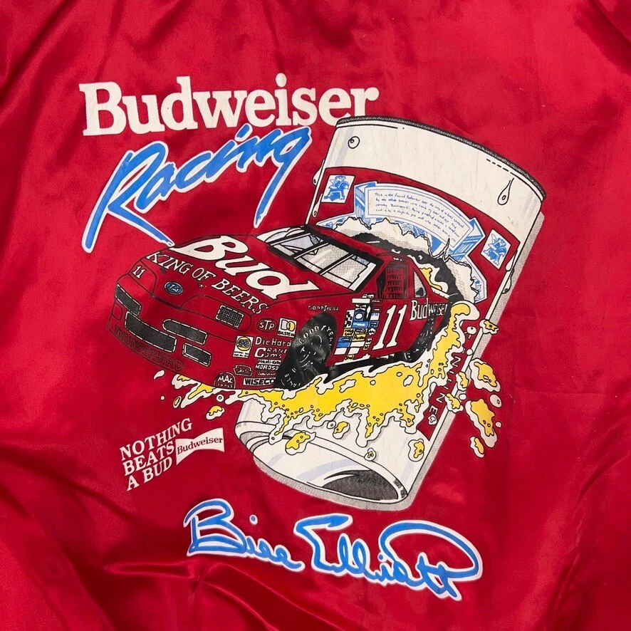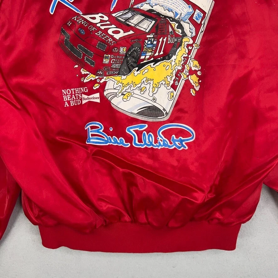 Vintage Bill Elliott Red Budweiser NASCAR Satin Bomber Jacket Mens XL