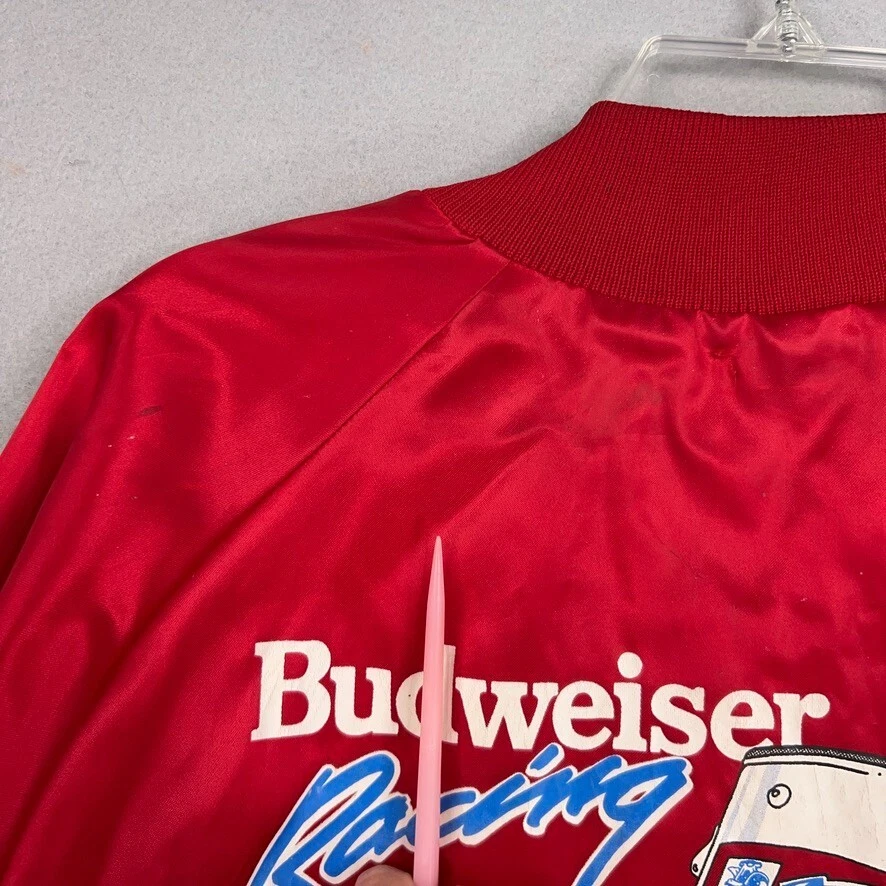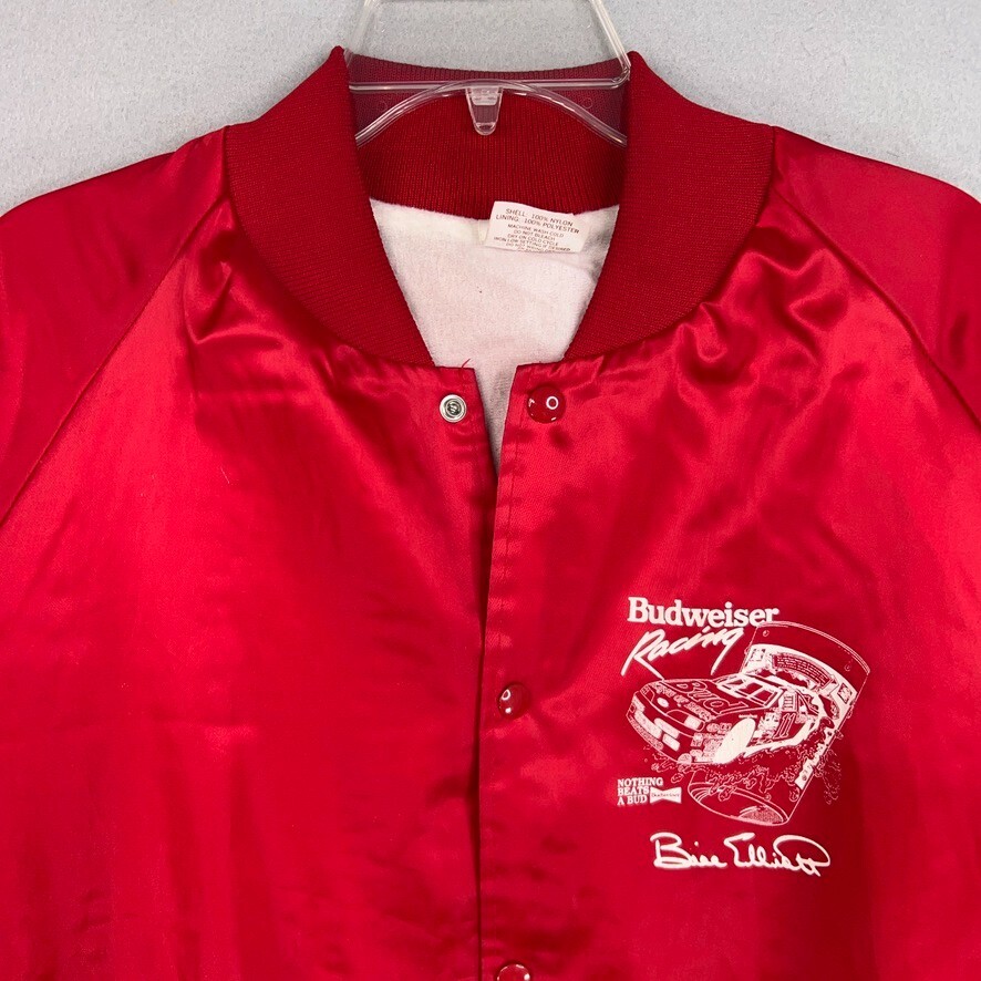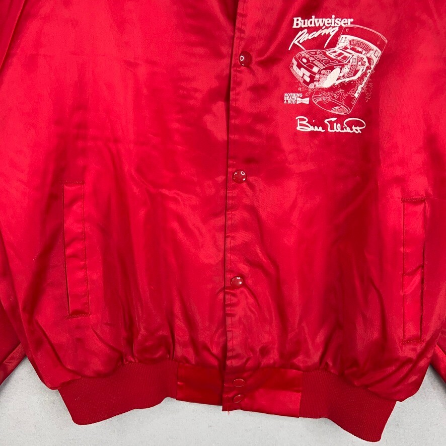 Vintage Bill Elliott Jacket Mens XL Red Satin Bomber Budweiser Racing NASCAR Condition: - Spots on back. - Some wear and scratches to the satin. - Good used condition. - No rips or holes. - Made in USA. - Nice double sided graphics. Size: - Mens XL. Measurements: - Previous washings may change the sizing written on the tag. - Please refer to the photos above for all measurements. - Please compare our measurements to that of one of your favorite garments. - Please note, item measurements are approximate . All items are bagged and sealed after being photographed, then stored in a smoke free environment to ensure the item is exactly the same as when photographed. I carefully package and ship daily. Feel free to contact me with any questions. All items have been washed per eBay standards & policies.