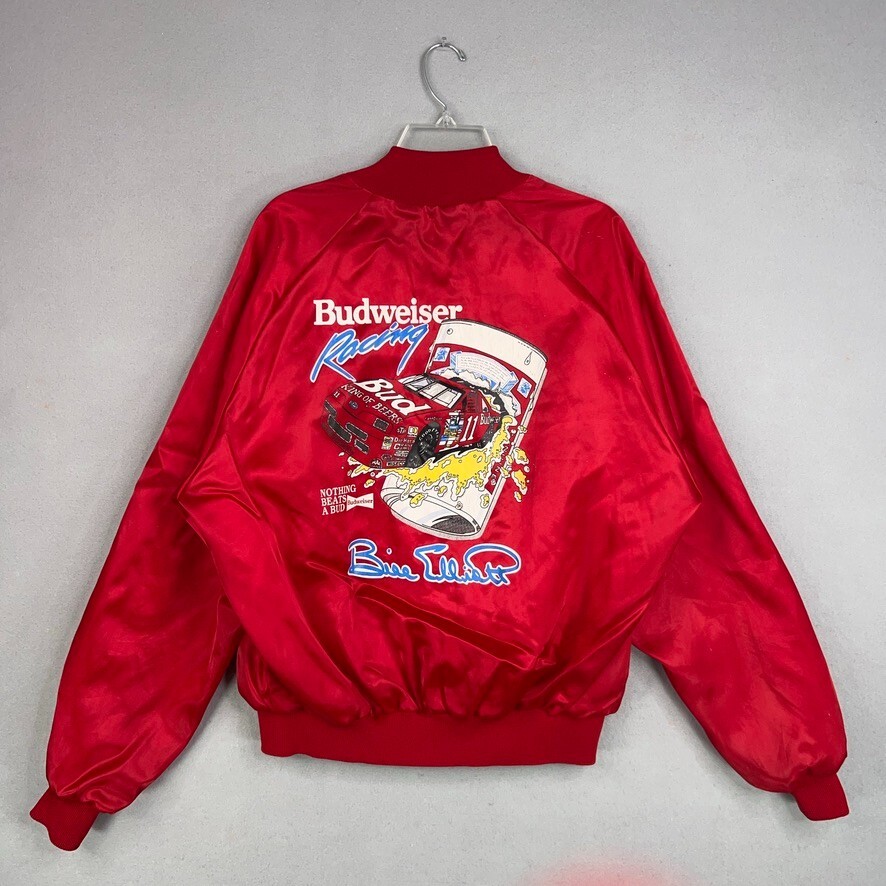 1. This vintage Bill Elliott jacket is a must-have for NASCAR fans! The bold red satin bomber features awesome double-sided Budweiser racing graphics and still holds up well despite some minor wear and spots. No rips or holes—just classic racing vibes in a solid XL fit. Made in the USA with that retro charm, it’s perfect for collectors or anyone who loves throwback racing gear. Check the measurements to ensure the best fit, but this piece is a total score for fans of Elliott’s legacy!