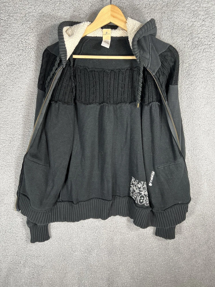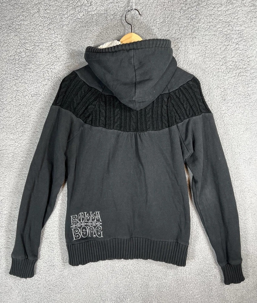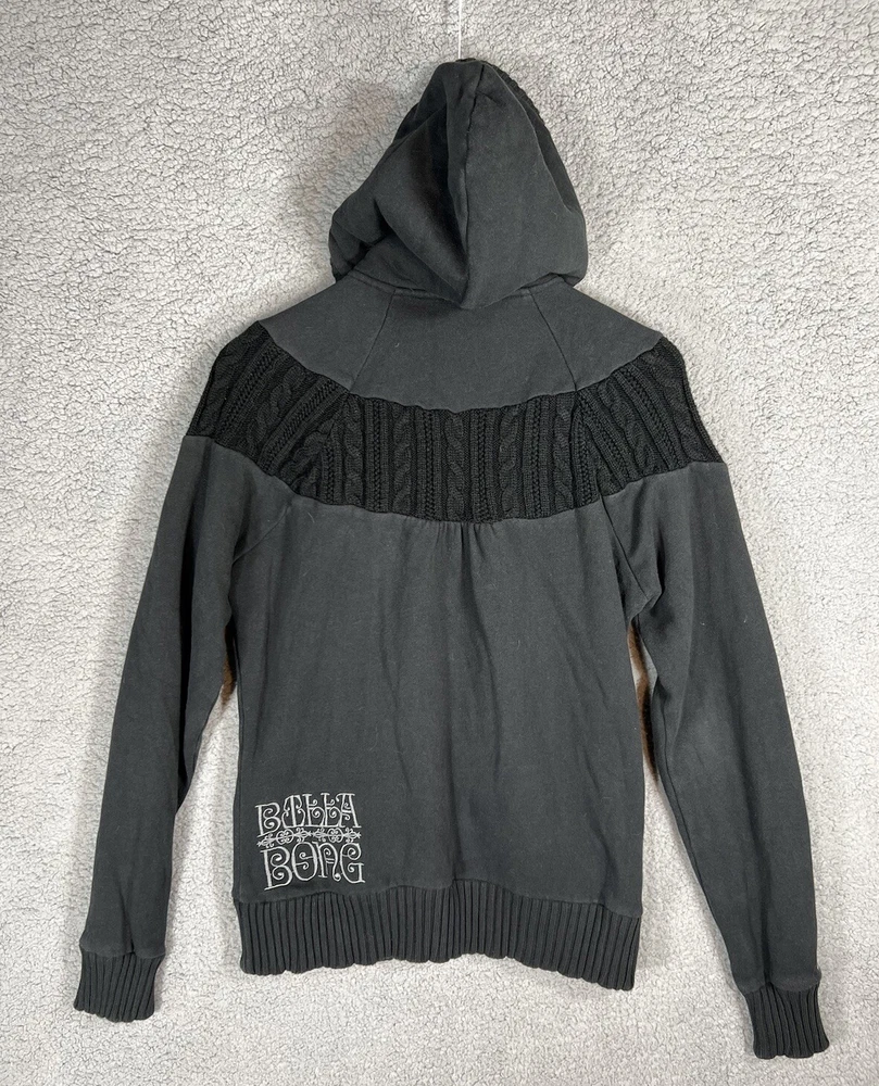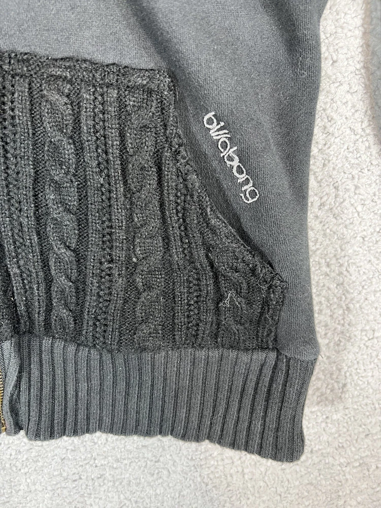 Vintage Y2K Billabong Black Embroidered Full Zip Surf Skate Knit Hoodie Sweatshirt Jacket. Women's Size Large. Sweatshirt material with cable knit details. Embroidered logo on front and back. Hood is lined with fleece. Drawstring on hood. Great pre-owned condition. Mild wash wear present. Approximate Measurements: Chest (pit to pit): 19.5 inches flat Length (shoulder to hem): 25 inches Please see measurements as all brands can vary in size.