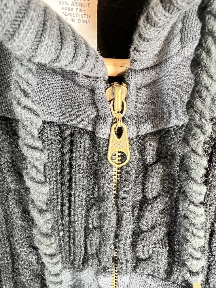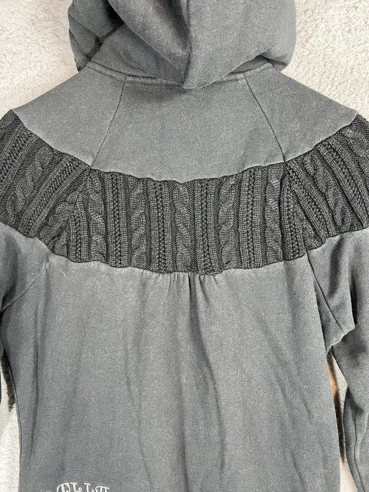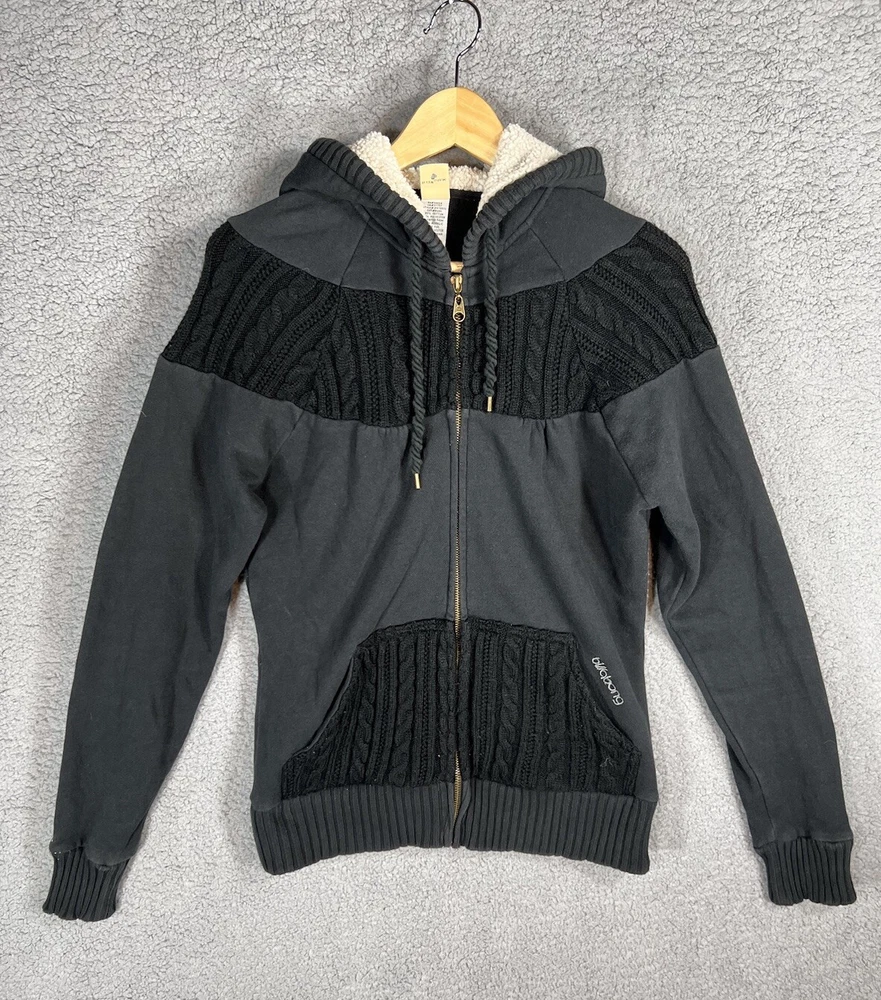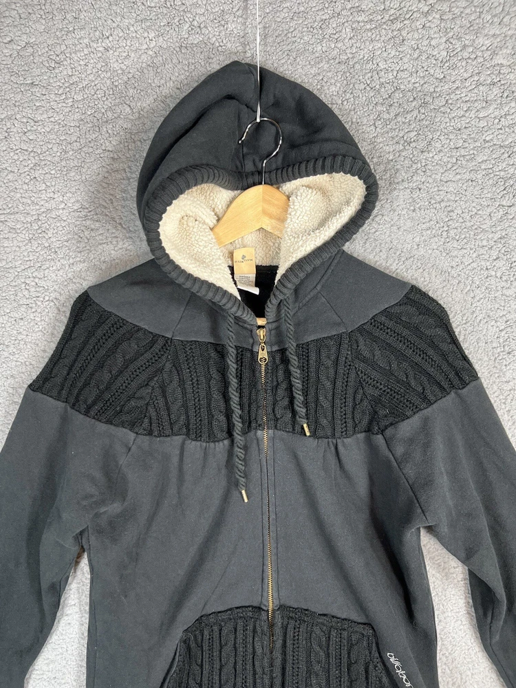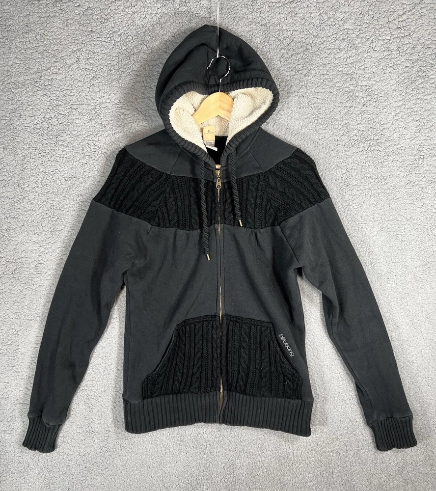 Vintage Y2K Billabong Black Embroidered Full Zip Surf Skate Knit Hoodie Sweatshirt Jacket. Women's Size Large. Sweatshirt material with cable knit details. Embroidered logo on front and back. Hood is lined with fleece. Drawstring on hood. Great pre-owned condition. Mild wash wear present. Approximate Measurements: Chest (pit to pit): 19.5 inches flat Length (shoulder to hem): 25 inches Please see measurements as all brands can vary in size.