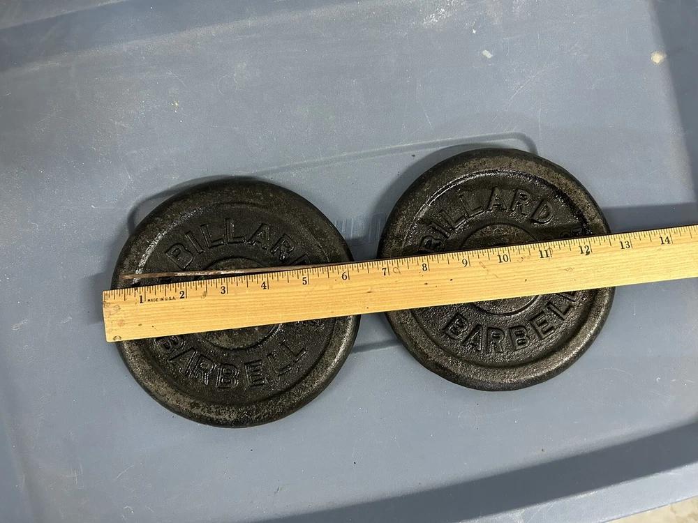 This vintage Billard barbell set includes two 5lb weight plates, perfect for weight lifting and gym training. The plates are made of cast iron and are designed with a standard weight plate pattern. The set is made in the USA and is perfect for both men and women. The plates are black in color and are part of the Weight Plates model. They are not personalized and are suitable for strength training. This set is a great addition to any fitness routine and is sure to provide a challenging workout.