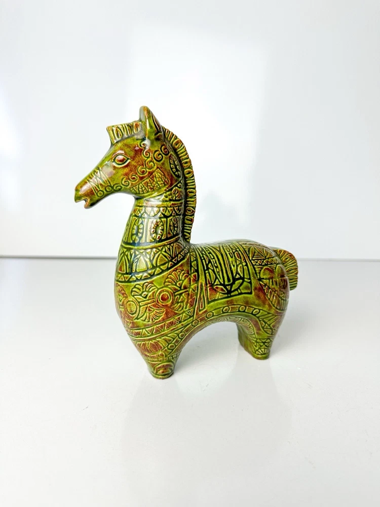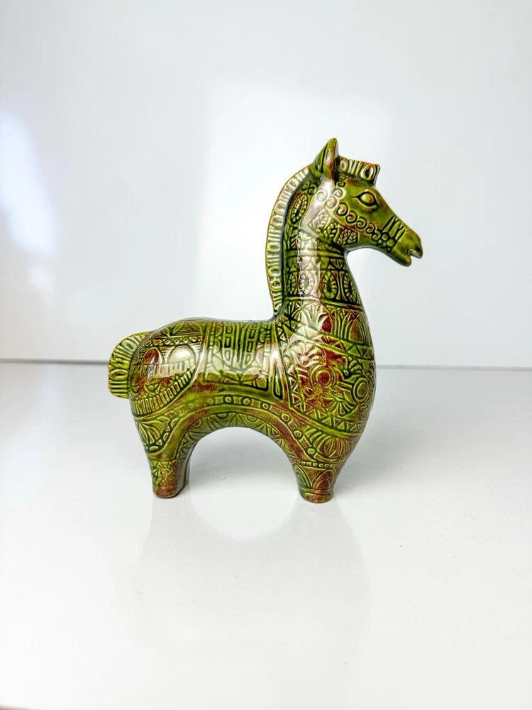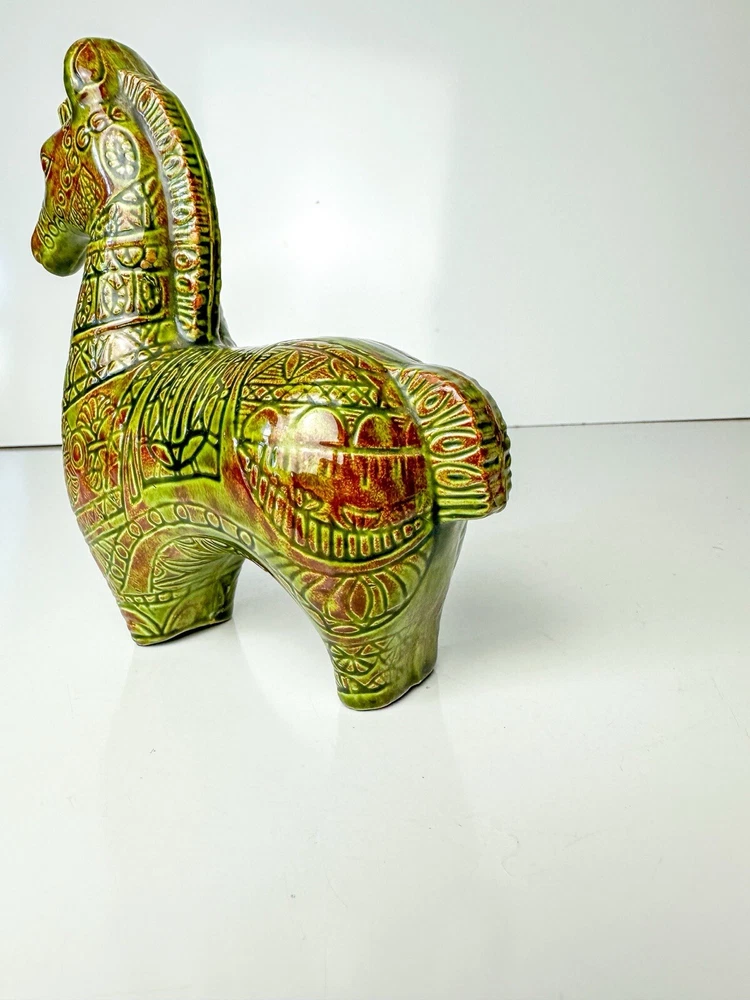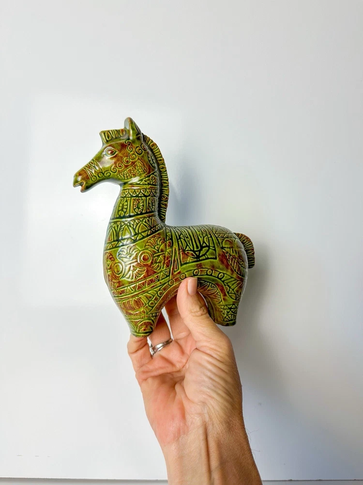 Vintage Bitossi Style Horse Sculpture MCM Ceramic Horse Aldo Londi, Netter Mid century ceramic horse sculpture in the style of Bitossi Ceramiche, Rosenthal Netter, Aldo Londi Beautiful avocado green (ripe) and deep terracotta high gloss glaze 6 3/4”L x 2 3/8”W x 6 5/8”H Initial on bottom JK In excellent condition! This item is cross posted #100043 Please feel free to reach out with any questions you may have Thank you for choosing small business!!