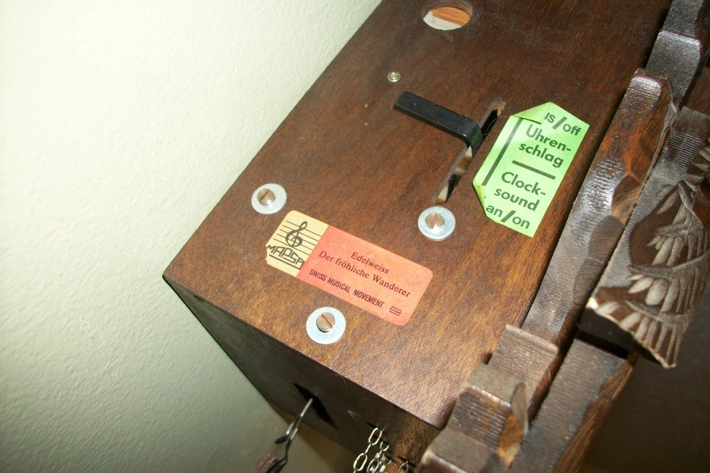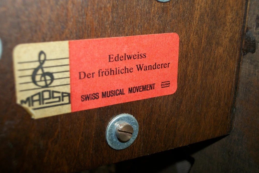 Material:WoodVintage:Yesgtin13:Does not applyTime Period Manufactured:1970-1979Movement:MechanicalBrand:Cuendet Swiss Musical MovementNumber Type:Roman NumeralsSeller Notes:“Has a little chip on the roof, where it cannot be seen. Works very well with mellow tone music.”Finish:woodEra:Late 20th Century (1970-1999)Chime Sequence:musicalTheme:MusicFrame Material:WoodStyle:Black ForestUPC:Does not applyModel:EdelweissCountry/Region of Manufacture:GermanyColor:BrownType:Cuckoo ClockPower Source:weightsOriginal/Reproduction:OriginalDisplay Type:AnalogAntique:NoFeatures:Musical