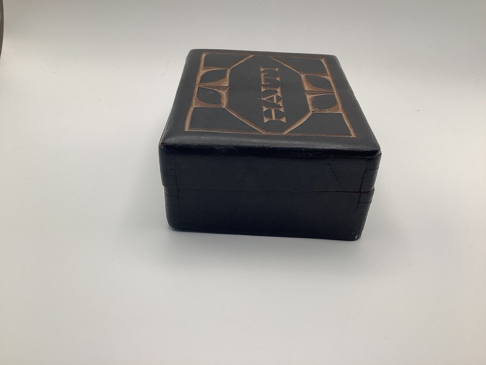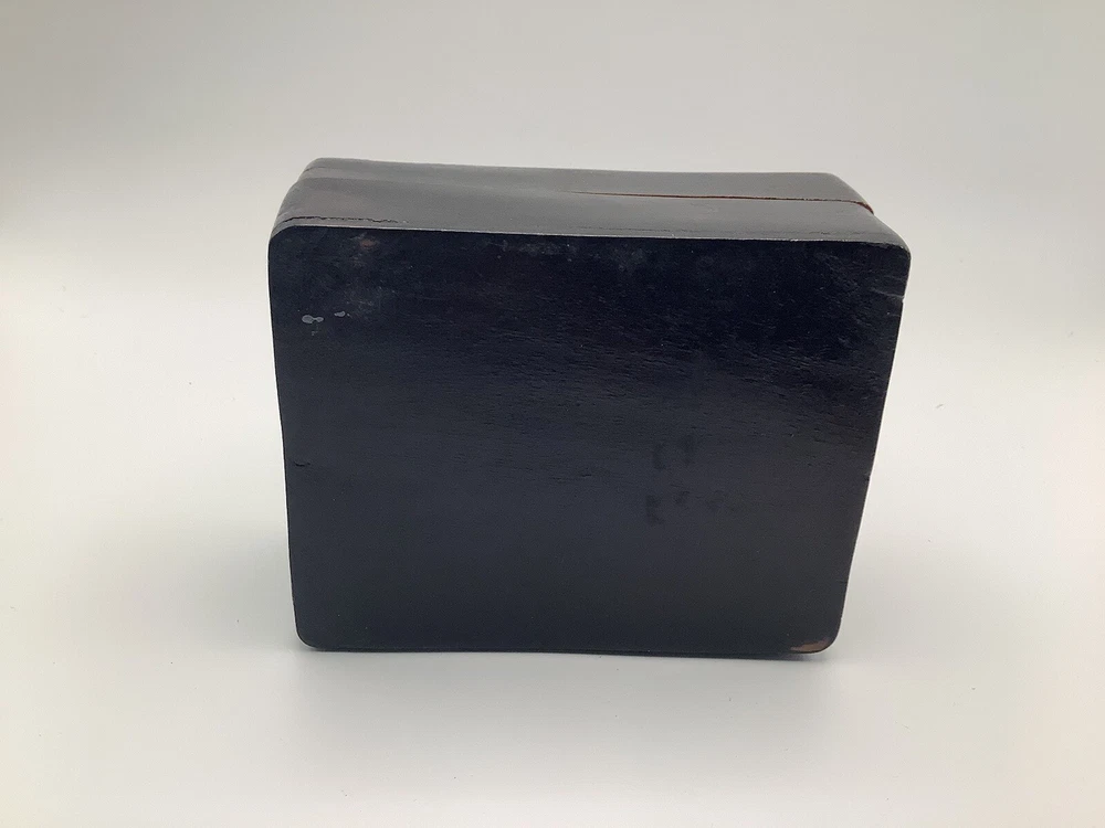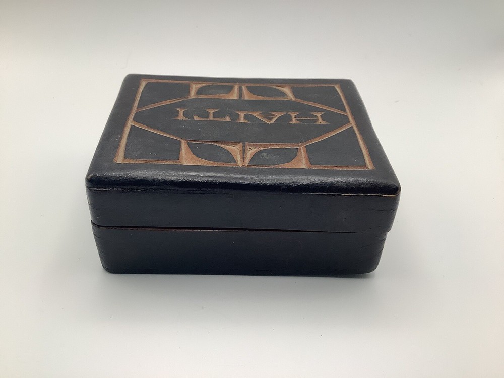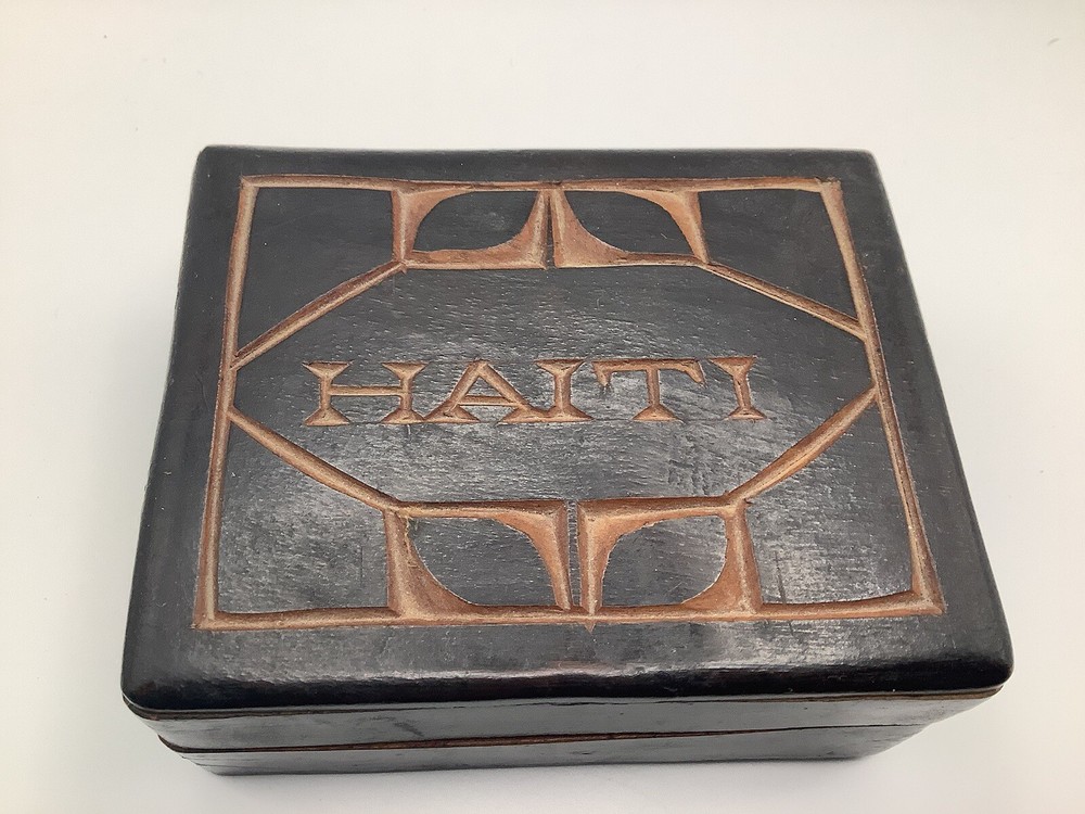 This product is a vintage black wooden trinket box from Haiti. It was handmade in the 1990s and features intricate carvings and a pressed fastening closure. Lid is not flush with box. The box is suitable for storing small items such as trinkets and keepsakes, and it would make a unique addition to any room or collection. The box is originally from Haiti and has a ethnic style with art theme. It is perfect for all occasions and suitable for teens and adults.