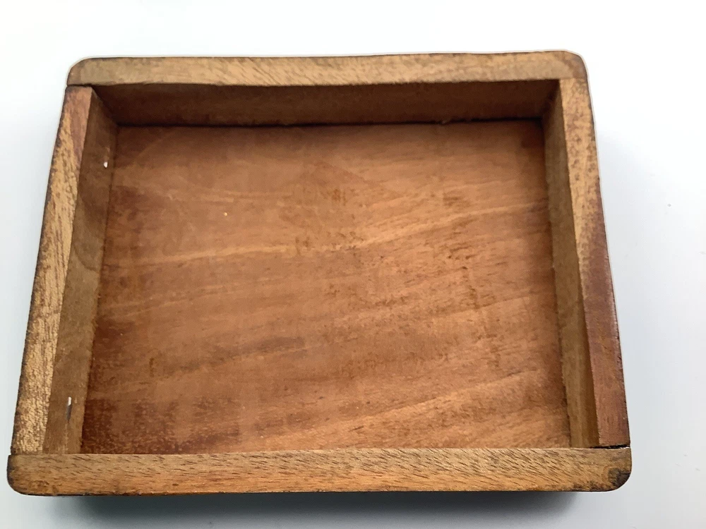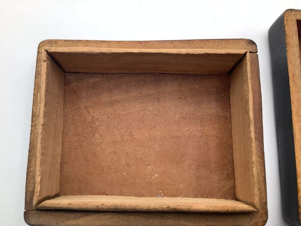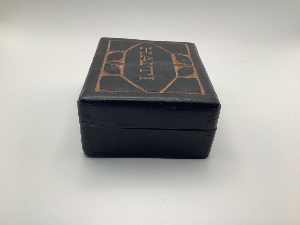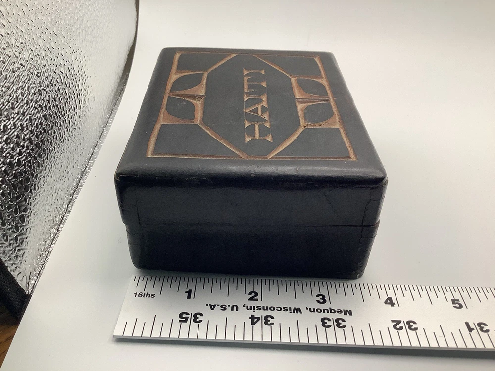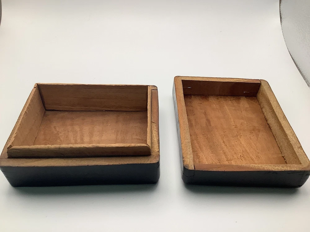 This product is a vintage black wooden trinket box from Haiti. It was handmade in the 1990s and features intricate carvings and a pressed fastening closure. Lid is not flush with box. The box is suitable for storing small items such as trinkets and keepsakes, and it would make a unique addition to any room or collection. The box is originally from Haiti and has a ethnic style with art theme. It is perfect for all occasions and suitable for teens and adults.