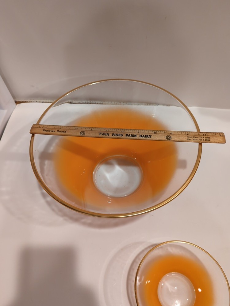 Usually when I happen upon these gorgeous frosted glass Blendo bowls, they've gone through the dishwasher or been so beat up, the color and gold rim are really scratched. Not the case with this orange chip and dip set! Yes, there's a little wear, but the color and rim are in great shape as seen in the pictures. The chip bowl measures about 11 inches across and the dip bowl measures about 5 inches. Sadly, the accompanying bracket could not be located, but your friends will be just as impressed with them sitting side by side!