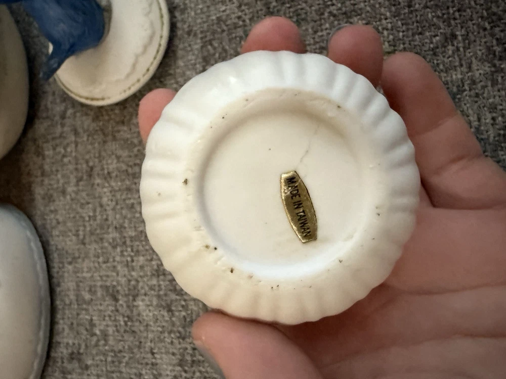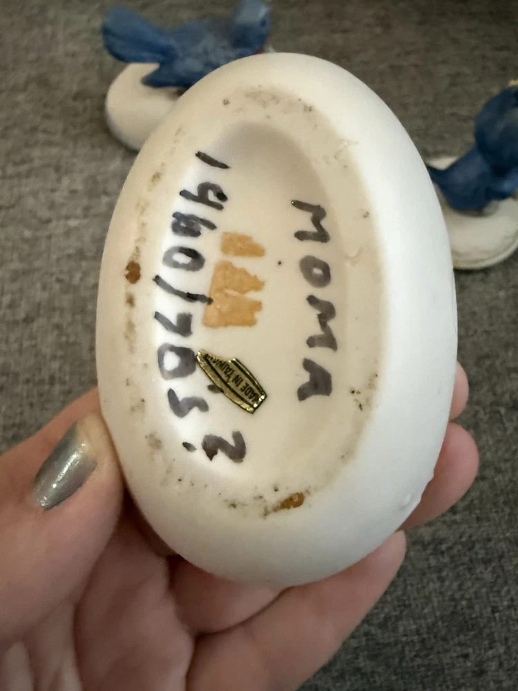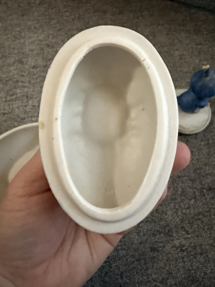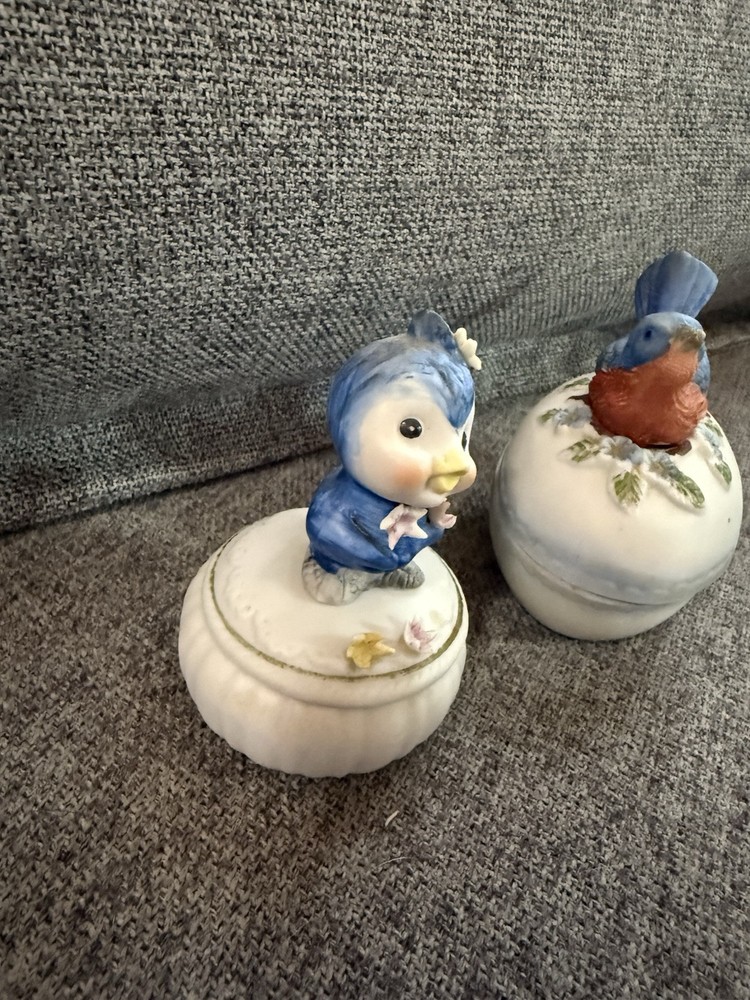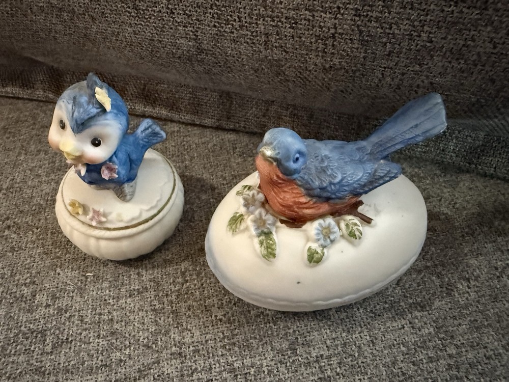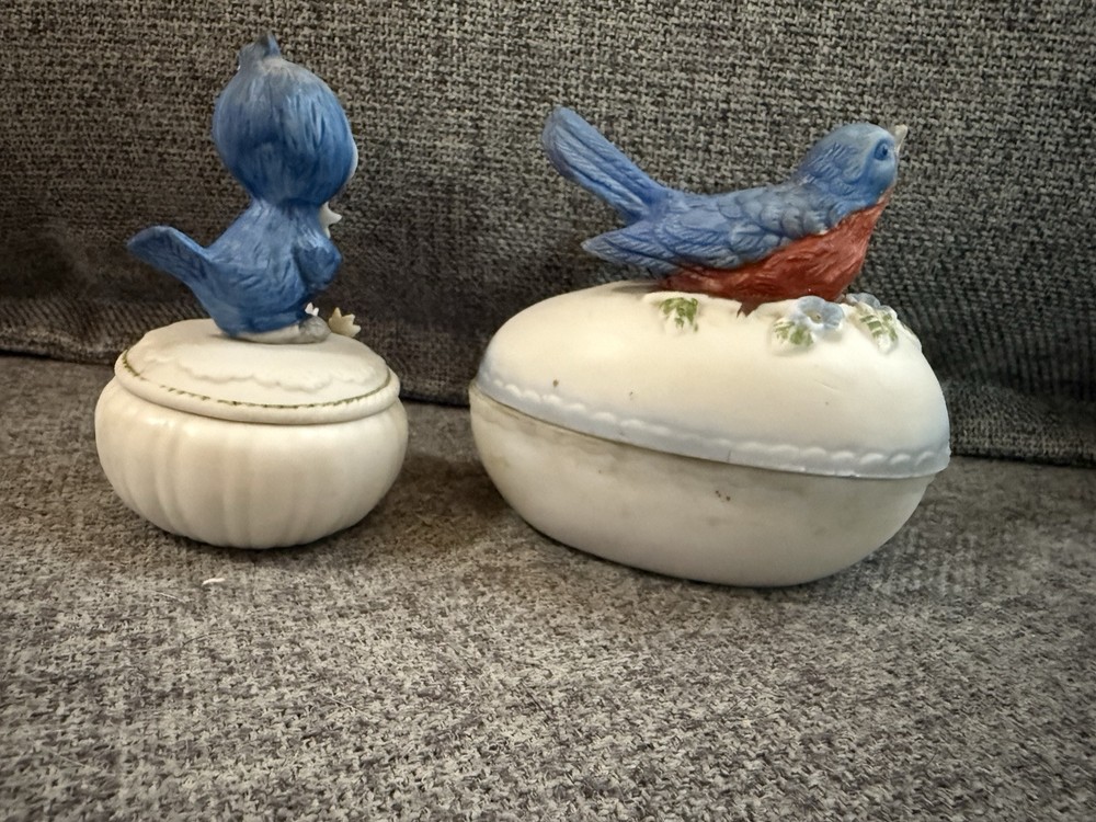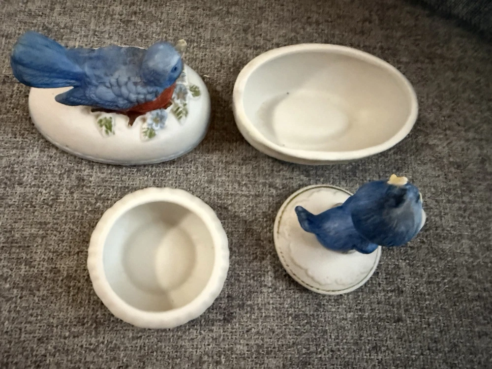 This Vintage Ceramic Blue Bird Trinket Boxes Set of 2 features an oval shape with a retro style, adorned with a floral pattern and a matte finish. Each medium-sized box is designed with a charming blue bird motif, making them perfect for all occasions. Made of ceramic in Taiwan during the late 20th century, these trinket boxes come boxed and are ideal for collectors of decorative items.