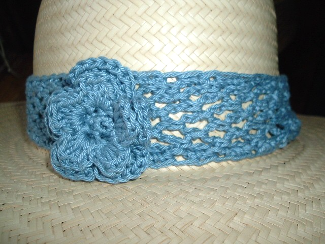 Perfect for a sun hat, beach hat or just something beautiful to keep your hair out of your eyes, a vintage hand crocheted sky blue stretch hat band with a rose to wear in front or on the side. Condition is excellent. May also be worn as a headband.