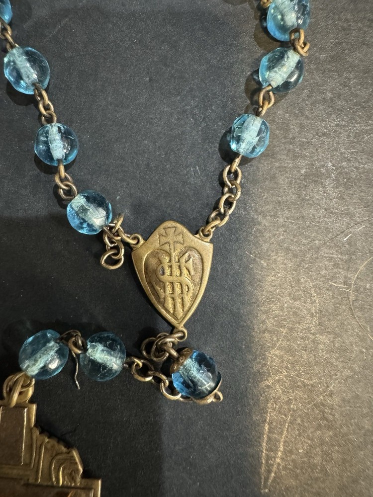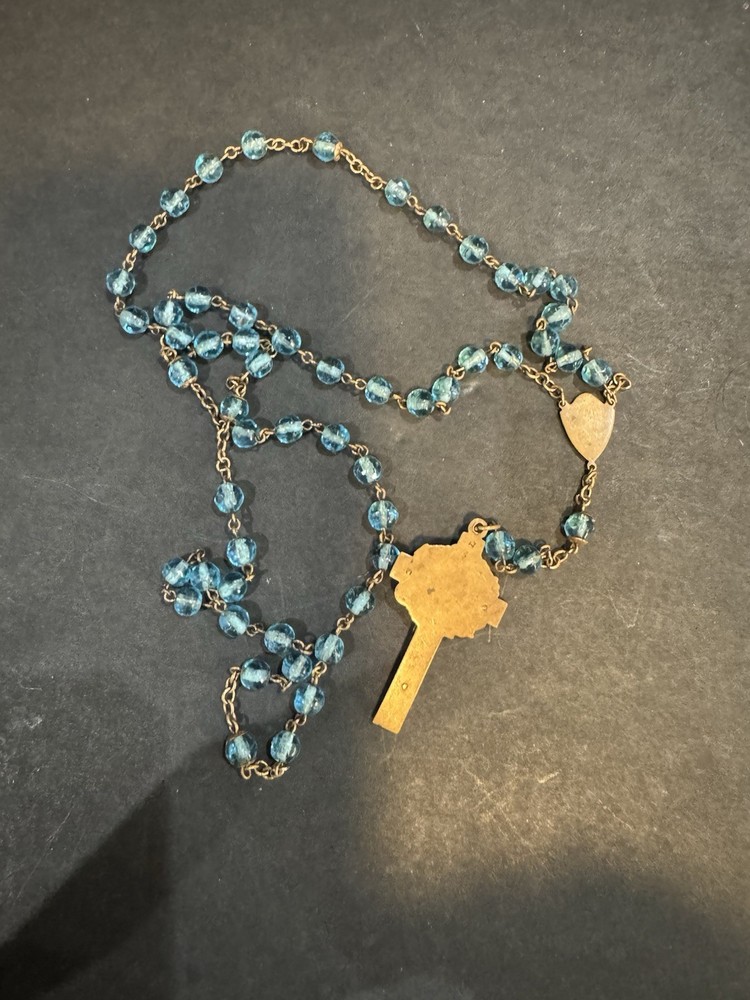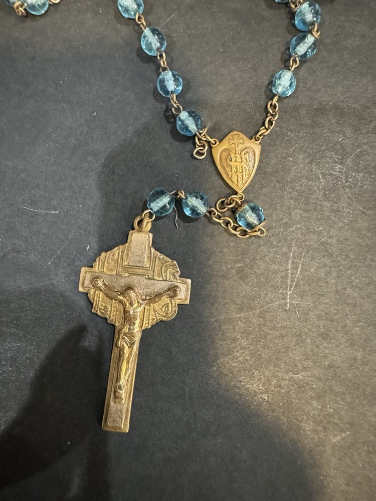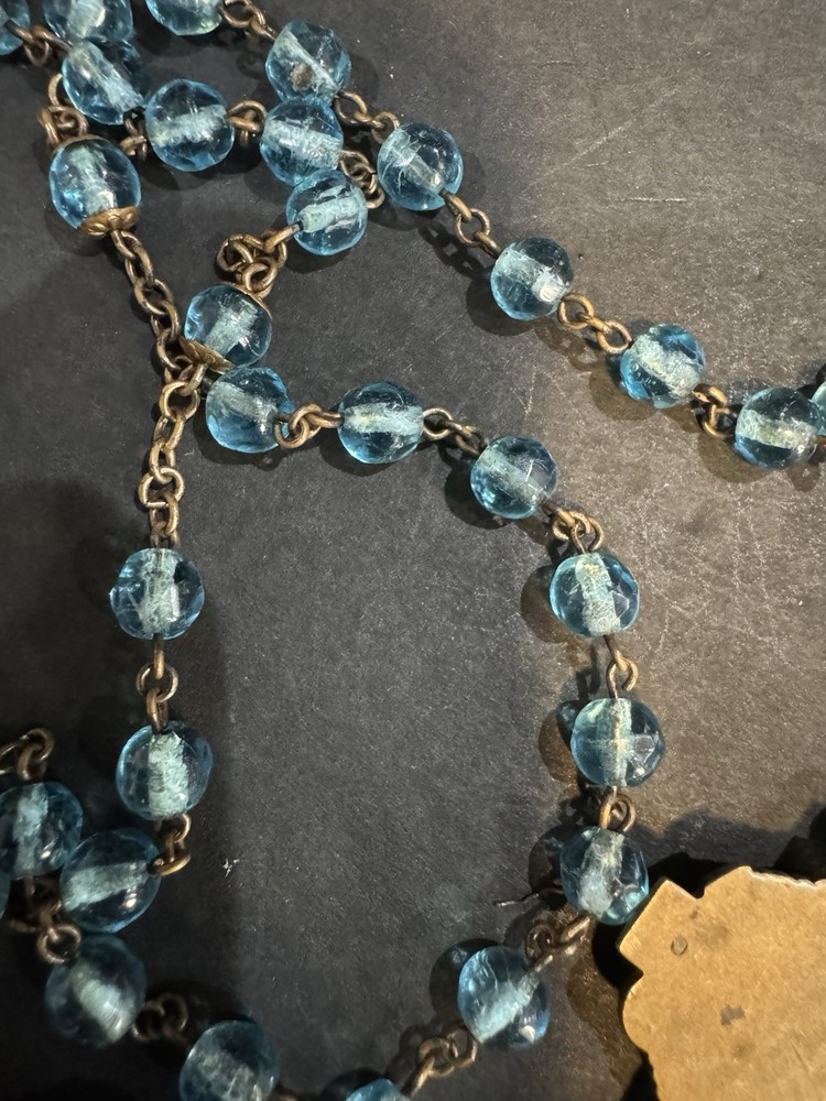 $ 10.56Vintage French Rosary with Glass Beads and Inlaid Wood Cross Crucifix