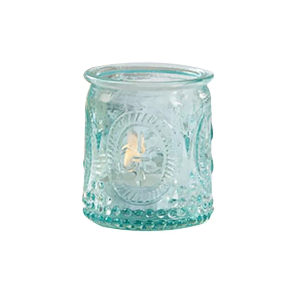 Love is in the air, so ignite it for all to see. Vintage-inspired embossed candle holders create a beautiful glow when illuminated from within. Features and facts: Reminiscent of heirloom-quality, embossed, aqua colored glass. Sold in sets of 4, tea lights not included. Measures 2.75"height x 2.15" width. BEAUTIFUL & FUNCTIONAL The blue glass Votive Candle Holder features a fleur de lis design around the outside of the glass and is sold in a set of 4 and wrapped securely in bubble wrap and shipped in a white box. This vintage glass candle holder from comes in a set of four to serve as a centerpiece and also makes a great favor container for your guests. Enhance your home decor with a classic decoration that can be filled with anything from candies to small gifts. HOME DECOR/SHELF DECOR - These vintage Blue Glass Tea Light holders are perfect for your fall events or just for around the home. The set of 4 features a fleur de lis design around the outside of each votive. These can be used on a long plate as a centerpiece or separate them out. These are the perfect neutral color that will create a warm and cozy ambiance. DECORATIVE - From room decor on shelves, in the living room, kitchen, bathroom or tables, these farmouse inspired vintage styled votive candle holders are the perfect home decor for anywhere in your house! DECORATIVE LANTERNS - The Glass Candle holders are a great way to add a little ambience to any room or shelf. Drop in a tealight or votive candle (not included) or fill with flowers, herbs or candy. Not only are they great as tealight candle holders, but you can also use them for office supplies, flowers, plants and so much more! Product measures: 2.32" w x 2.756" h x 2.32" d. Packaged product measures 5.039" w x 2.953" h x 5.039" d.