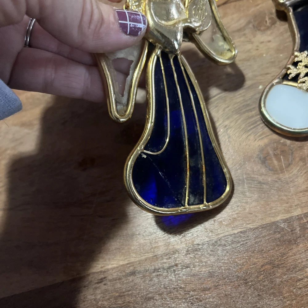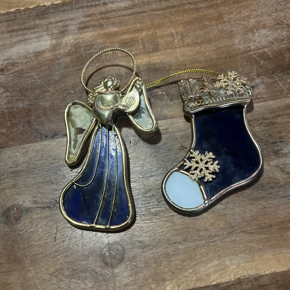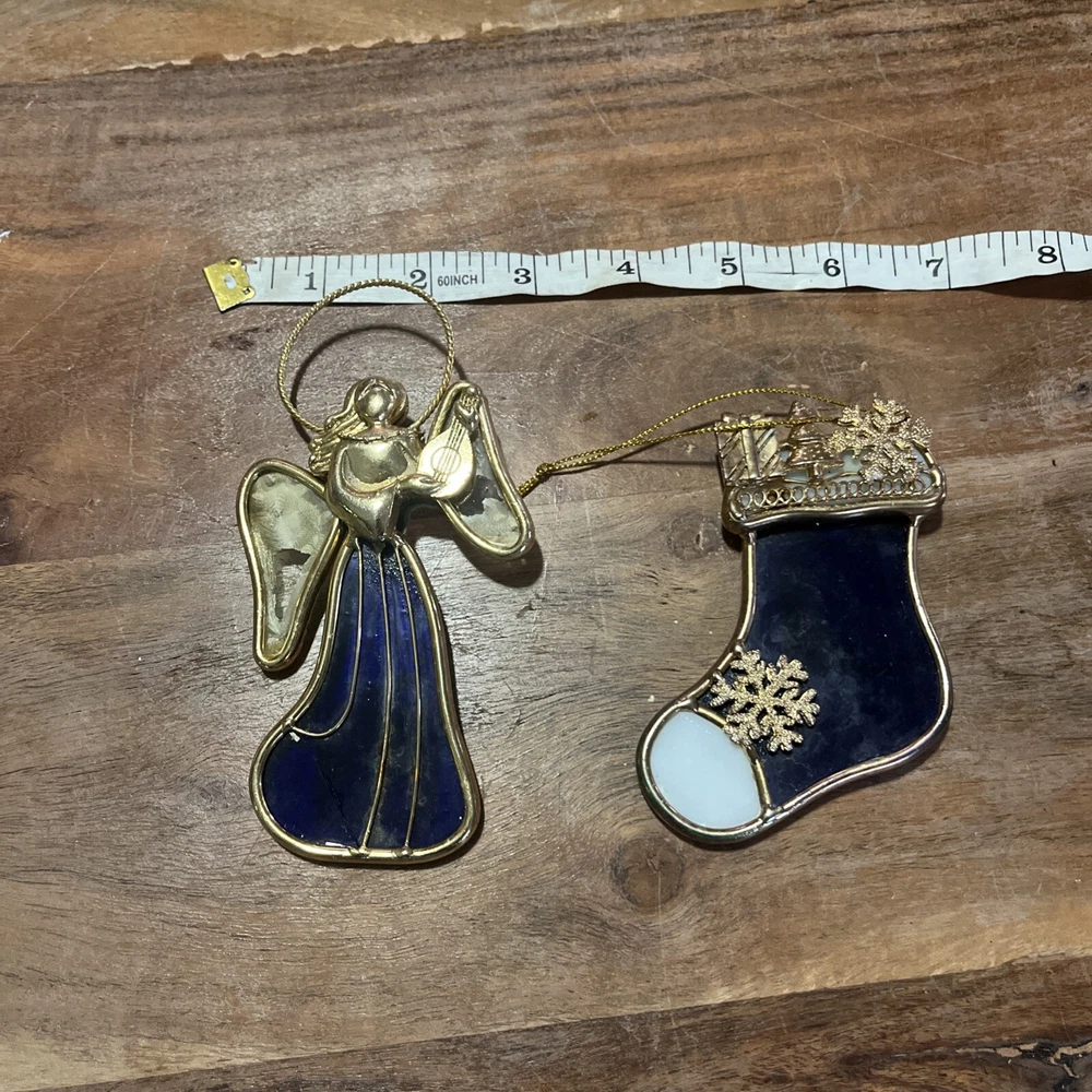Add a touch of vintage charm to your Christmas decor with this beautiful blue stained glass angel ornament. The intricate design and delicate details make it a perfect addition to any holiday collection. The angel is holding a stocking in its hand and is sure to be a conversation starter. Crafted with care, this ornament is made of glass and features a sun catcher design. It is perfect for any occasion, but especially suitable for Christmas. This set includes two items, and both are adorned with the vintage brand name. Don't miss out on adding this unique and beautiful piece to your collection.