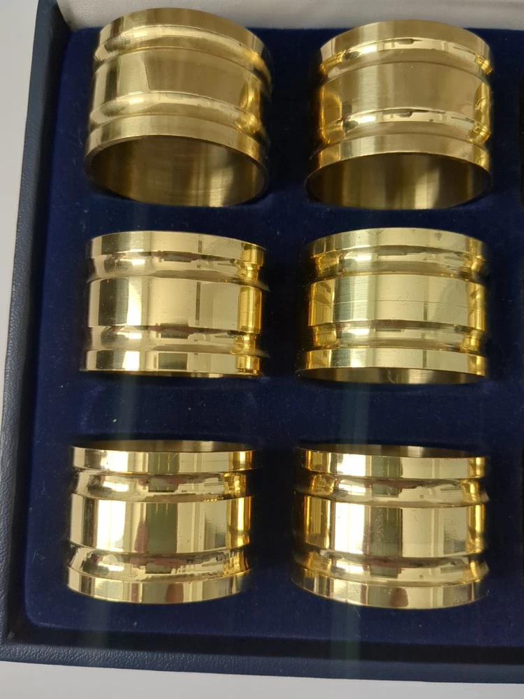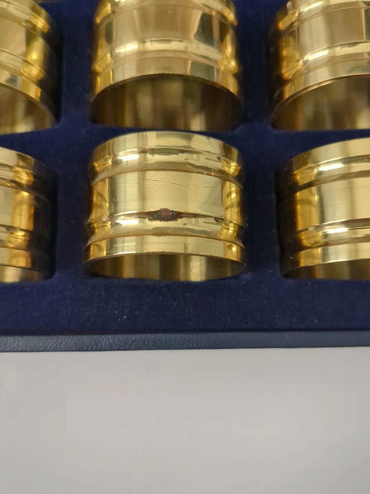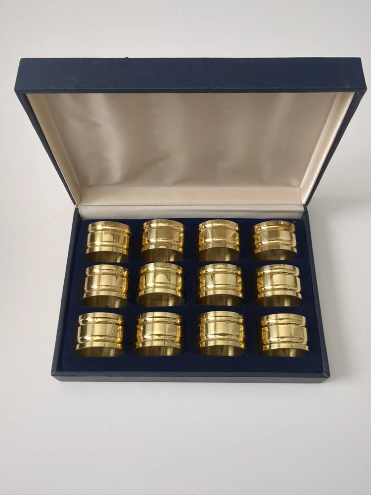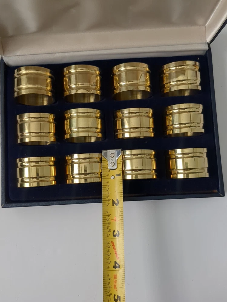 12 piece set solid brass napkin rings. 1 ring has a tarnish damaged spot -see pics