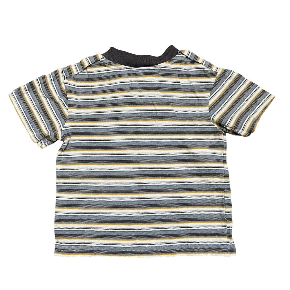 Brand: Blues Clues, officially licensed Blue's Clues apparel by Kids Headquarters. Size: Boys 2T (toddler) per neck tag. Color: Multicolor horizontal stripes in gray, white, light blue, and yellow with a dark charcoal ribbed collar. Material: 100% cotton knit body exclusive of decoration per fabric tag. Style: Vintage boys short sleeve crew neck T-shirt with regular fit and classic striped pattern. Details: Embroidered Blue's Clues shield patch at chest featuring Blue the dog, small woven paw logo tab at hem, contrast ribbed neckline, straight hem, and soft all-season cotton jersey fabric. Brand markings: Blue's Clues character neck label, Kids Headquarters New York N.Y. licensing tag with 2001 Viacom copyright, inner care and content tag with RN 46725. Country of origin: Made in China. Condition: Pre-owned shirt in clean shape with light wash wear to cotton knit and a small loose thread at one hem seam; fabric, embroidery, and seams intact with no stains, holes, or tears.
