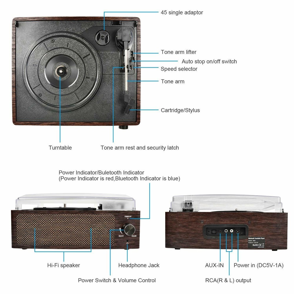 【All-in-one Record Player】Bluetooth Input & AUX Audio input & RCA line-out & Headphone jack. 2 Built in stereo speakers,with Bluetooth wireless technology,elegantly listen to the music from your smart phone.Use Aux cable input to directly play the music. Or enjoy your time with headphone. For better or louder sound, connect external speaker via RCA cable. 【Vinyl Turntable Record Player】Easy to use, simple setup and operation. Great ideal for vinyl lovers. Three-speed Turntable (33, 45, 78 RPM) plays all of your 7" 10" 12" vinyl records. 【Record Player Bluetooth with Speakers】 Built-in Bluetooth receiver & 2 stereo speakers,,you can listen to your favorite music from your Bluetooth compatible device like smartphone with ease. Just Bluetooth in connect and play! 【Portable Record Player】It creates a warm atmosphere when family gatherings. When you are alone, it can help you relax. Even if you don't use it, it can be one of the home's premium decorations. As a gift, it also allows the recipient to feel your heart. 【Retro Record Player】There is a removable cover on the top to protect vinyl and turntable plat. You can shut the cover shields and keep the dust out. And the beautiful textured exterior are a perfect fit for any environment. Great Gift of Choice & for Beginners The vinyl record play can not only play vinyls/albums but also play your favourite digital songs with extra functions like headphone listening, Aux-in and RCA-out connection, and Bluetooth input. Even if you don't use it, it can be one of the home's premium decorations. As a gift, it also allows the recipient to feel your heart. RCA Connection RCA-out connection: There is one RCA output cable included in package. It can hook up your external speaker via RCA cable to get louder sound. Bluetooth Input Connection Bluetooth Input: Wireless connection allows to stream your favourite digital songs from devices like smartphone, tablet, laptop through the turntable’s speakers. Aux Connection Aux-in connection : There is one Aux input cable included in package. Easily connect this turntable with your phone/ipad via Aux cable, it works as a powerful speaker. Solid & Warm Premium Sound Bulit-in 2 stereo speakers: It provides you with solid and warm sound experience. Decorated with high quality grid: It would better output the stereo sound. Auto-Stop Switch Auto-stop switch: If you need the record stop automatically when finshed, just switches it to "ON", no worry about scratch your record. Durable Ruby Stylus: it comes with built-in needle, easy to use, no worry about skipping. Removable Dust Cover : able to make your record keep clean and new. 45RPM adapter is included 3-Speed Vinyl Player for 3-Size 3-Speed Vinyl Player for 3-Size: It supports 33 1/3, 45, 78RPM with 7" 10" 12" sizes, And 45RPM adapter is included. Vintage vinyl record play_Great Gift of choice
