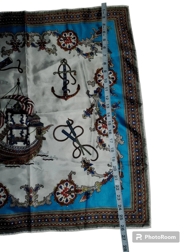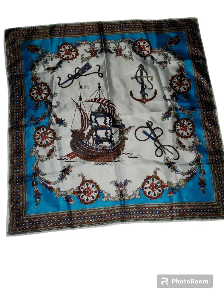 Add a touch of vintage nautical charm to your wardrobe with this 26 inch square scarf in a multi-color polyester material. Perfect for beach-goers and boating enthusiasts alike, this scarf features a nautical-themed pattern that will have you feeling like you're sailing on the high seas. Hand wash only to keep this scarf in top condition for years to come. With its versatility, this scarf can be used as a neck warmer, head cover, or even as a wall hanging to add some coastal flair to your home decor. This vintage scarf is a must-have for any fashion-forward individual who loves all things nautical.