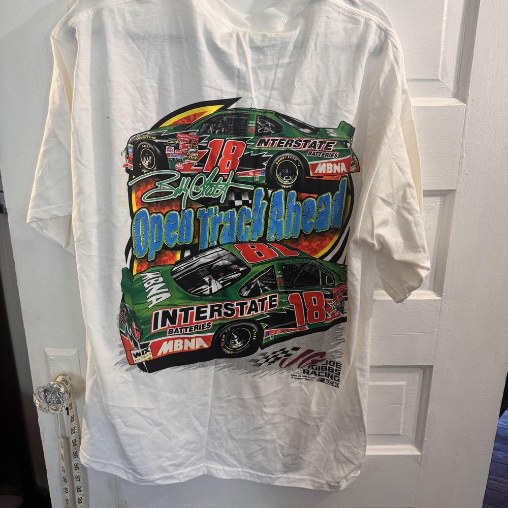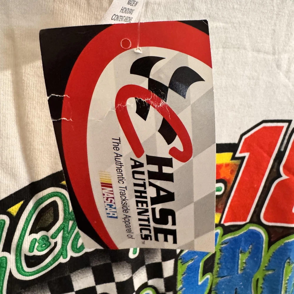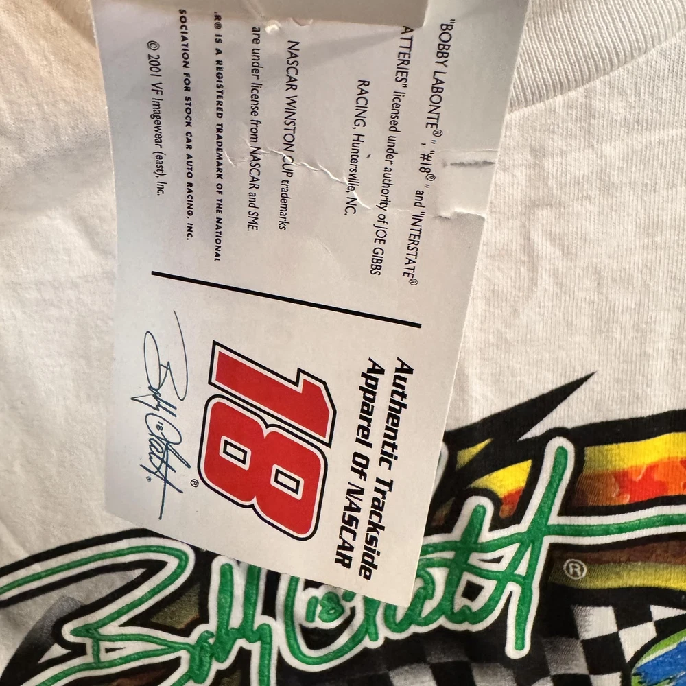 Brand: Chase Authentics for NASCAR, produced by VF Imagewear (East), Inc. Style: Vintage Bobby Labonte #18 Interstate Batteries racing shirt with large multicolor stock car and "Out in Front" graphic on the front and matching #18 Interstate Batteries "Open Track Ahead" racing graphic on the back. Color: White base with green, red, blue, yellow, black and orange graphics. Material: 100% cotton. Size on tag: Large (adult mens). Country of origin: Made in Honduras. Tag details: Inner neck tag code R952 09-01; JCPenney price tag with code R952-W-B02-NH9 and B Labonte; Chase Authentics hangtag marked as Authentic Trackside Apparel of NASCAR, ©2001 VF Imagewear (East), Inc. Details: Officially licensed NASCAR trackside apparel, crew neck, short sleeves, double-sided Bobby Labonte #18 Interstate Batteries and MBNA sponsor graphics, Joe Gibbs Racing branding, bold vintage 2000s racing design. UPC: 726657726147