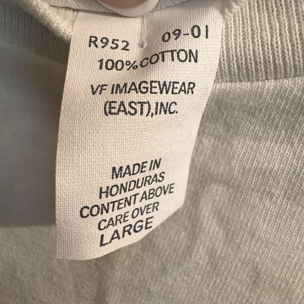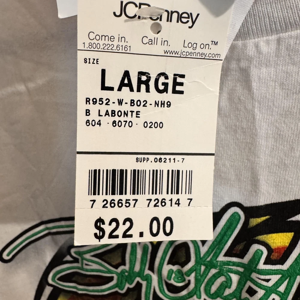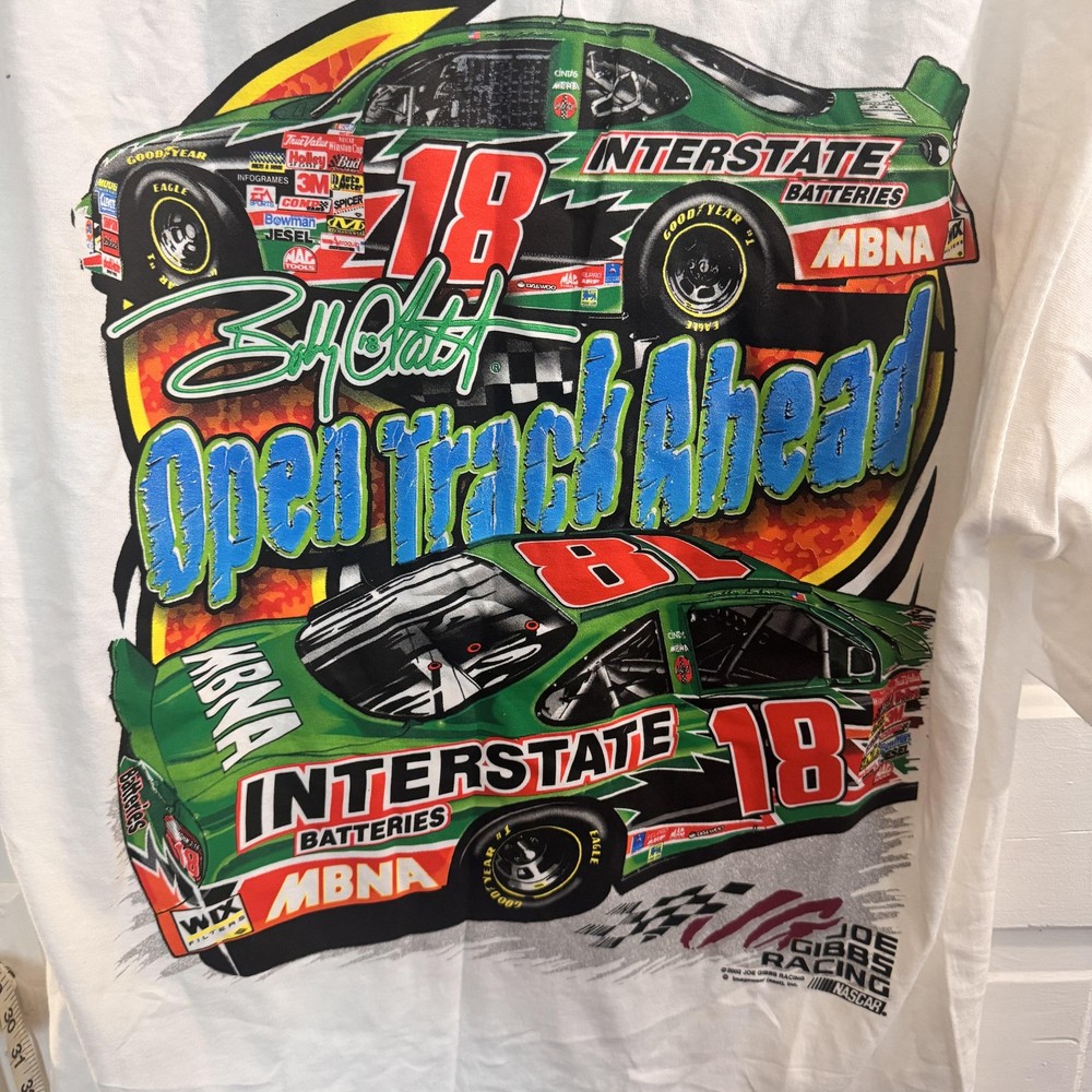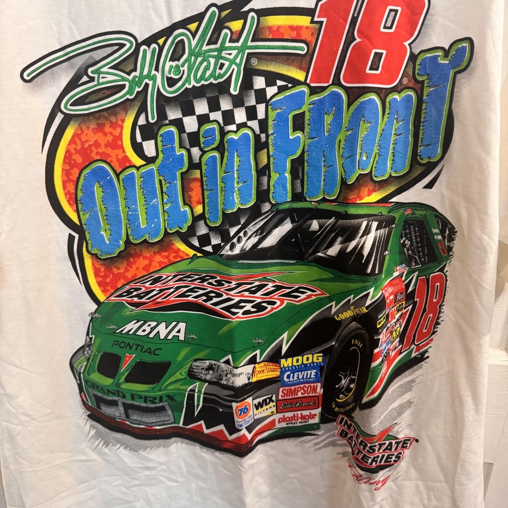 Brand: Chase Authentics for NASCAR, produced by VF Imagewear (East), Inc. Style: Vintage Bobby Labonte #18 Interstate Batteries racing shirt with large multicolor stock car and "Out in Front" graphic on the front and matching #18 Interstate Batteries "Open Track Ahead" racing graphic on the back. Color: White base with green, red, blue, yellow, black and orange graphics. Material: 100% cotton. Size on tag: Large (adult mens). Country of origin: Made in Honduras. Tag details: Inner neck tag code R952 09-01; JCPenney price tag with code R952-W-B02-NH9 and B Labonte; Chase Authentics hangtag marked as Authentic Trackside Apparel of NASCAR, ©2001 VF Imagewear (East), Inc. Details: Officially licensed NASCAR trackside apparel, crew neck, short sleeves, double-sided Bobby Labonte #18 Interstate Batteries and MBNA sponsor graphics, Joe Gibbs Racing branding, bold vintage 2000s racing design. UPC: 726657726147