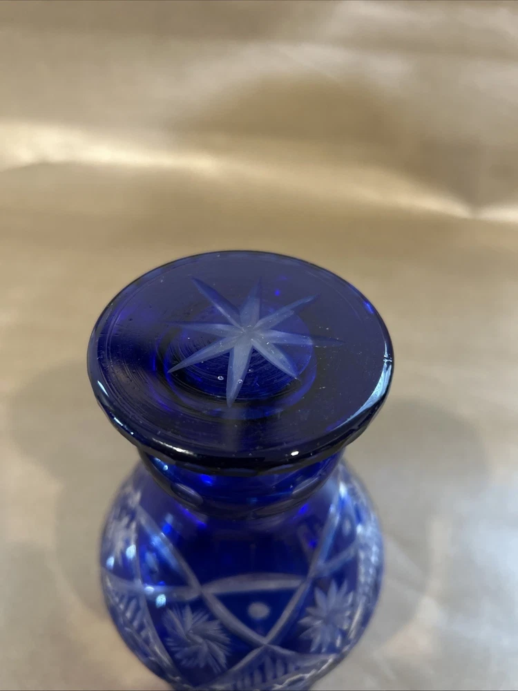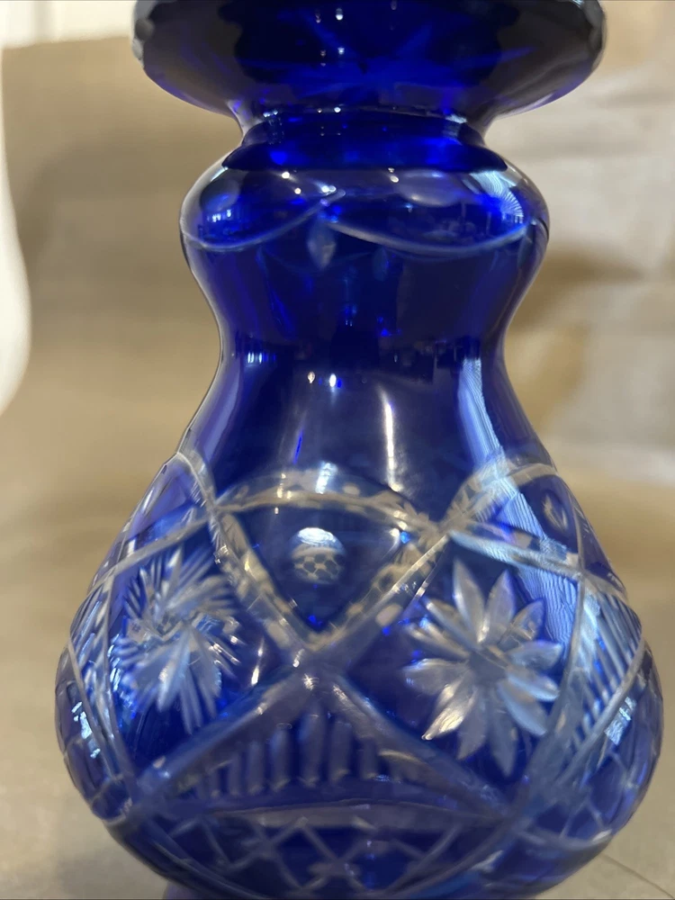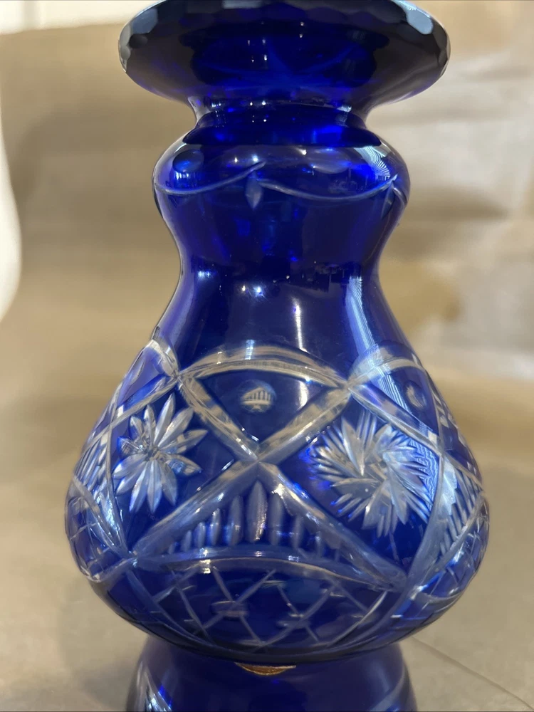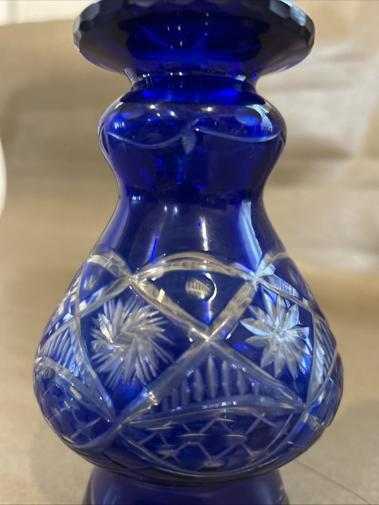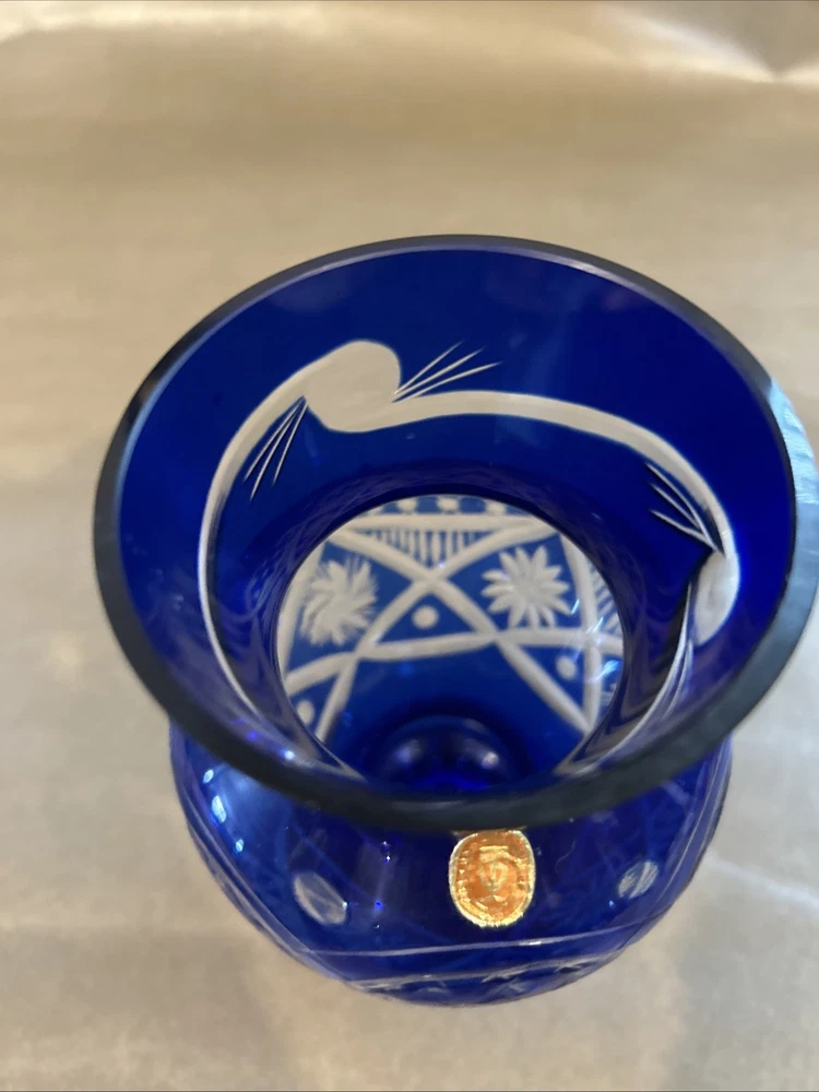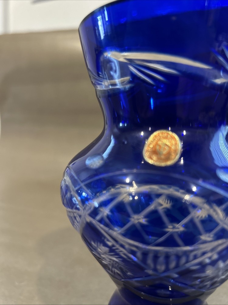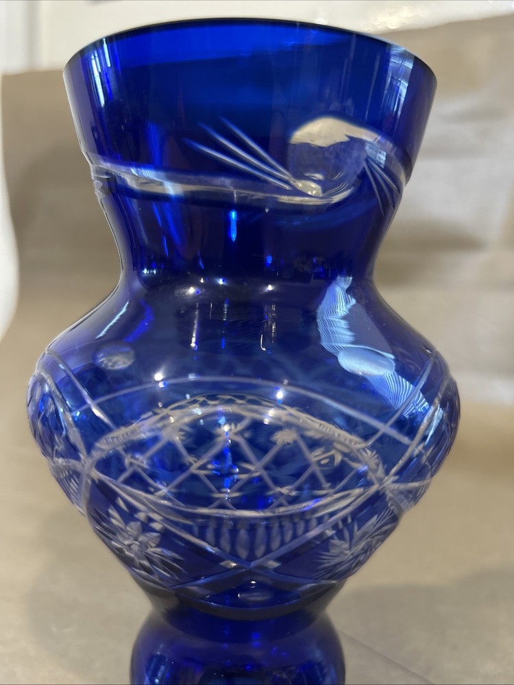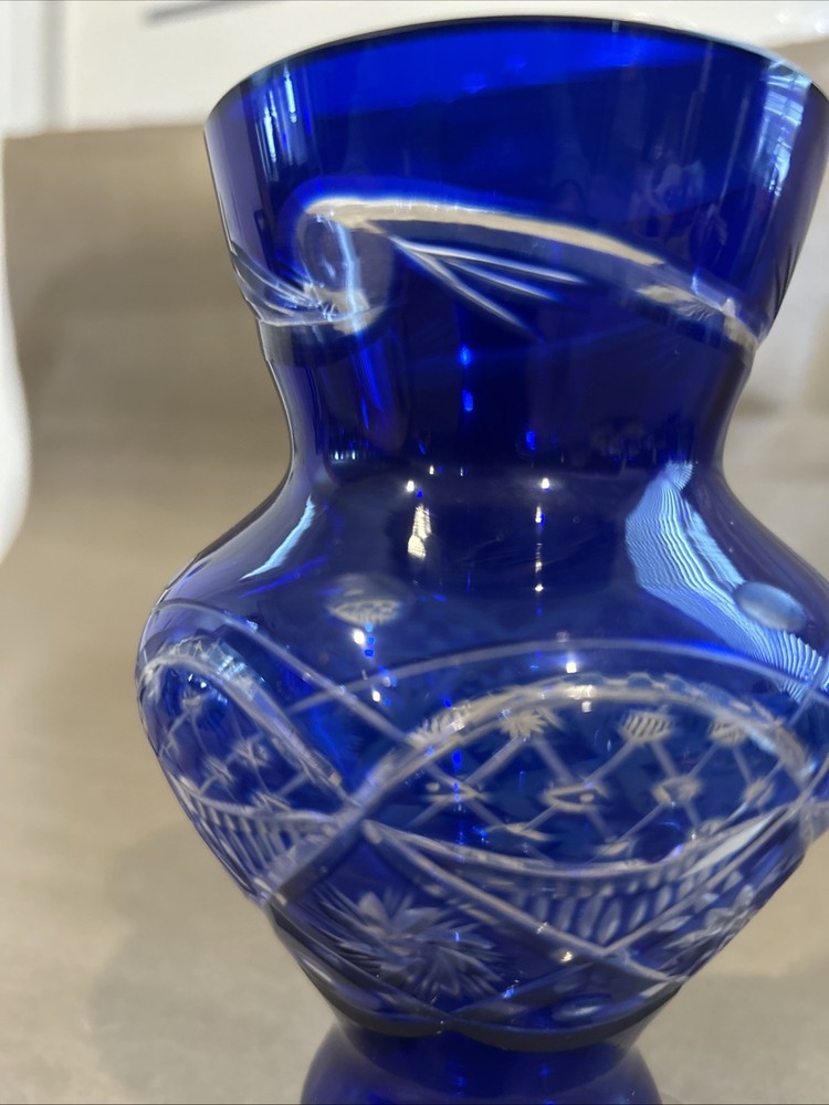 Vintage Bohemian Hand Cut Cobalt Blue Cut to Clear Crystal Glass Footed Vase 6”