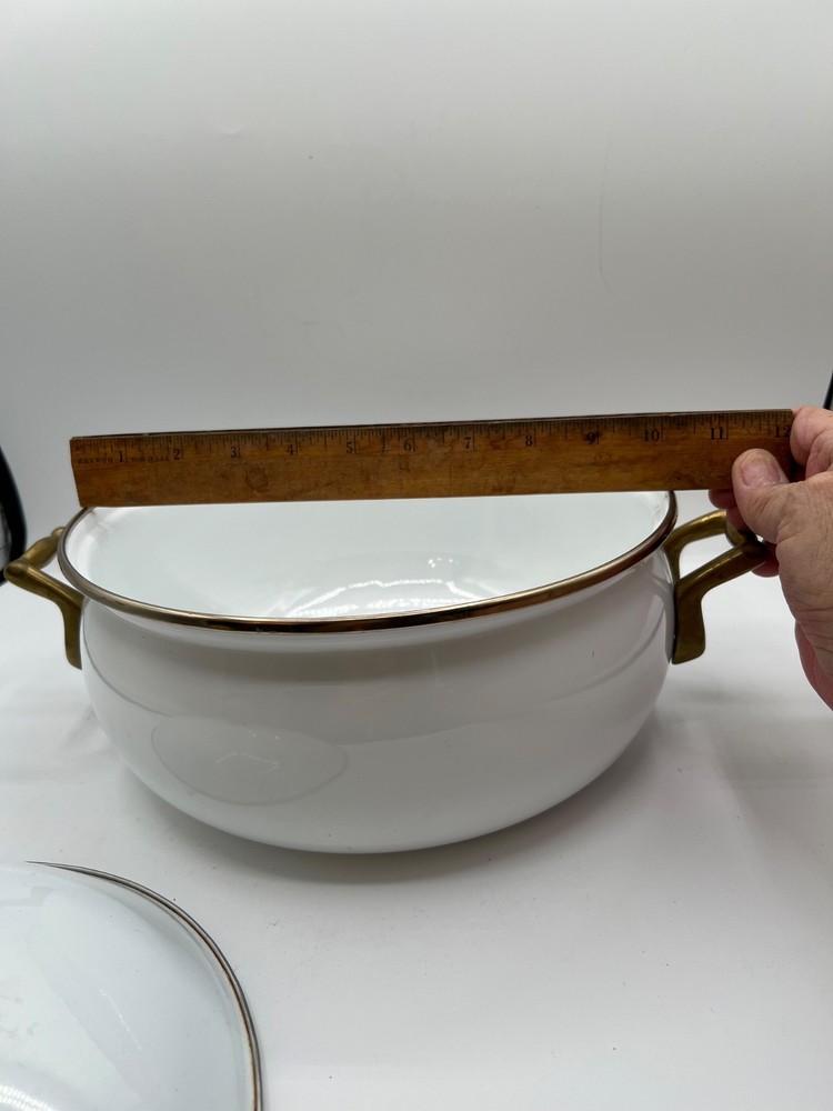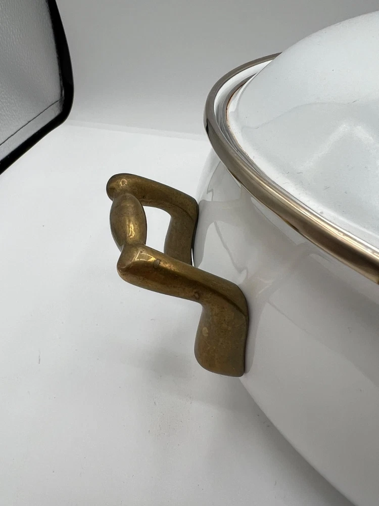 The product is a vintage Bon Chef white enamel Dutch oven with brass handles, designed for use on induction, electric, and gas stoves. This two-piece set includes a lid and has a capacity of 5 quarts. The round Dutch oven has a diameter of 8 inches, a depth of 4 1/2 inches, and weighs 4 lbs 15 ozs. Made of enamel, this collectible cookware piece is original and features a classic design that is perfect for cooking on both gas and electric ovens.