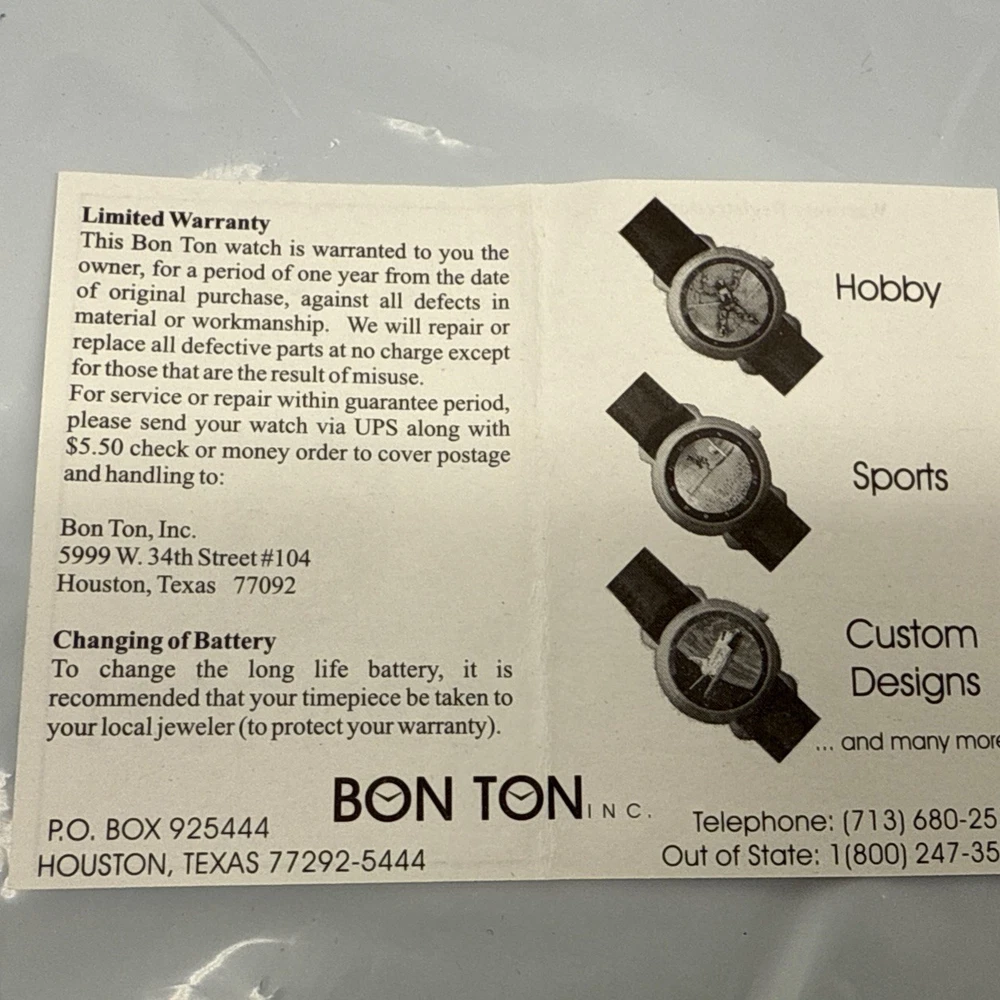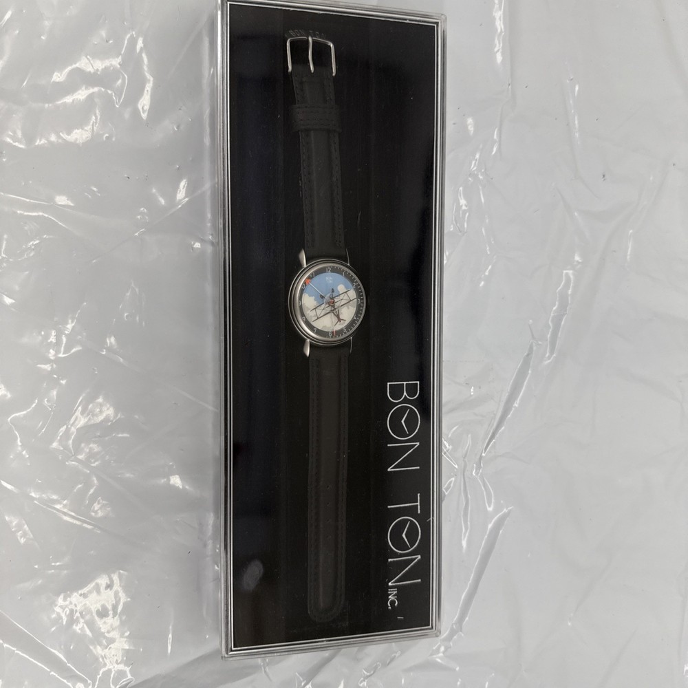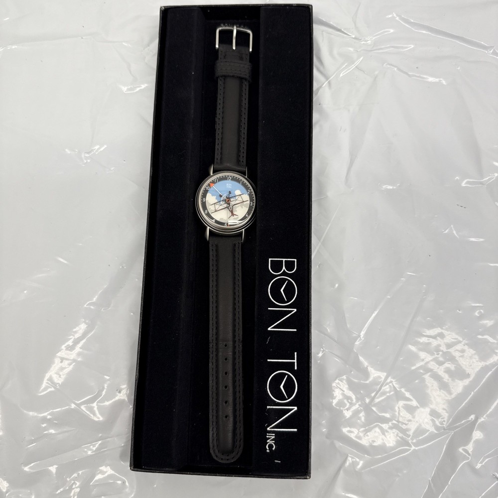 This is brand new and never worn. The Vintage Bon Ton Plane 34mm Quartz Men's Watch is a stylish and unique timepiece with a 24-hour dial and a round watch shape. This watch features a quartz movement with a battery, a 30-meter water resistance rating, and a matte gray case color. The two-piece black leather strap and comfortable lug width of 18mm make it easy to wear, while the black dial and easy-to-read features add to its functionality. Perfect for adults, this vintage watch is a must-have for watch enthusiasts looking for something with a cartoon/idol style.