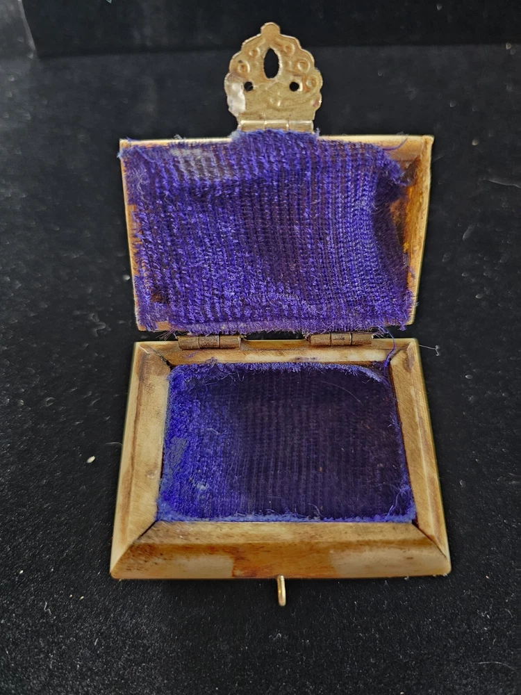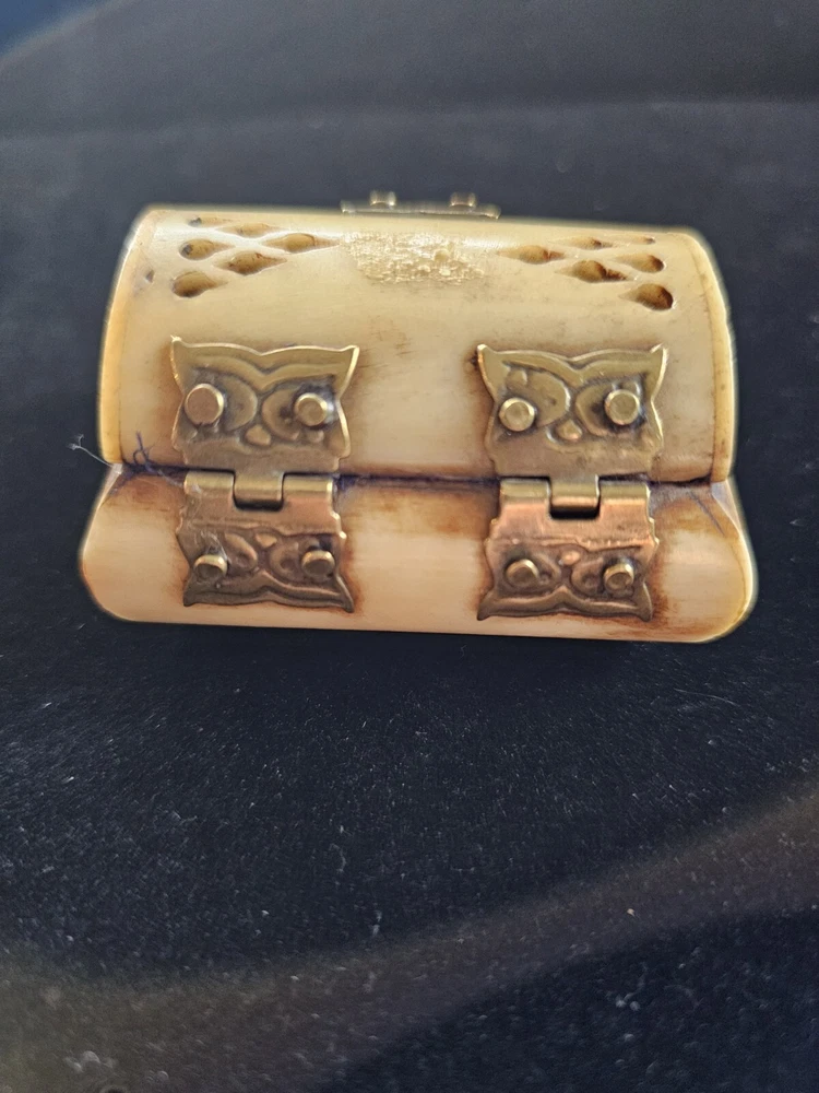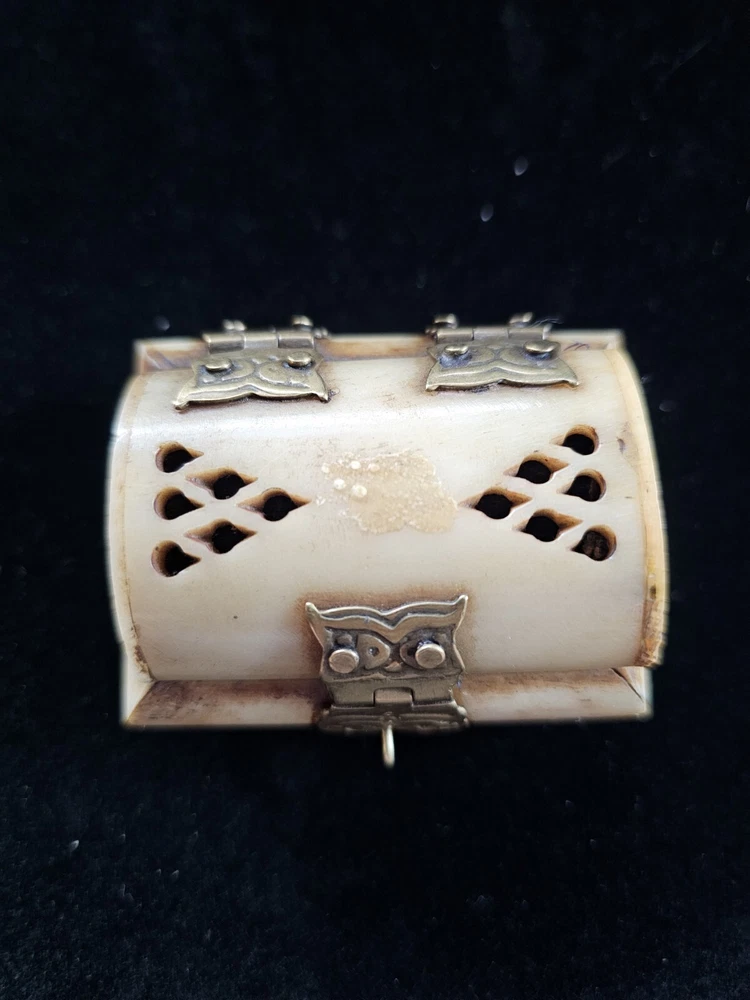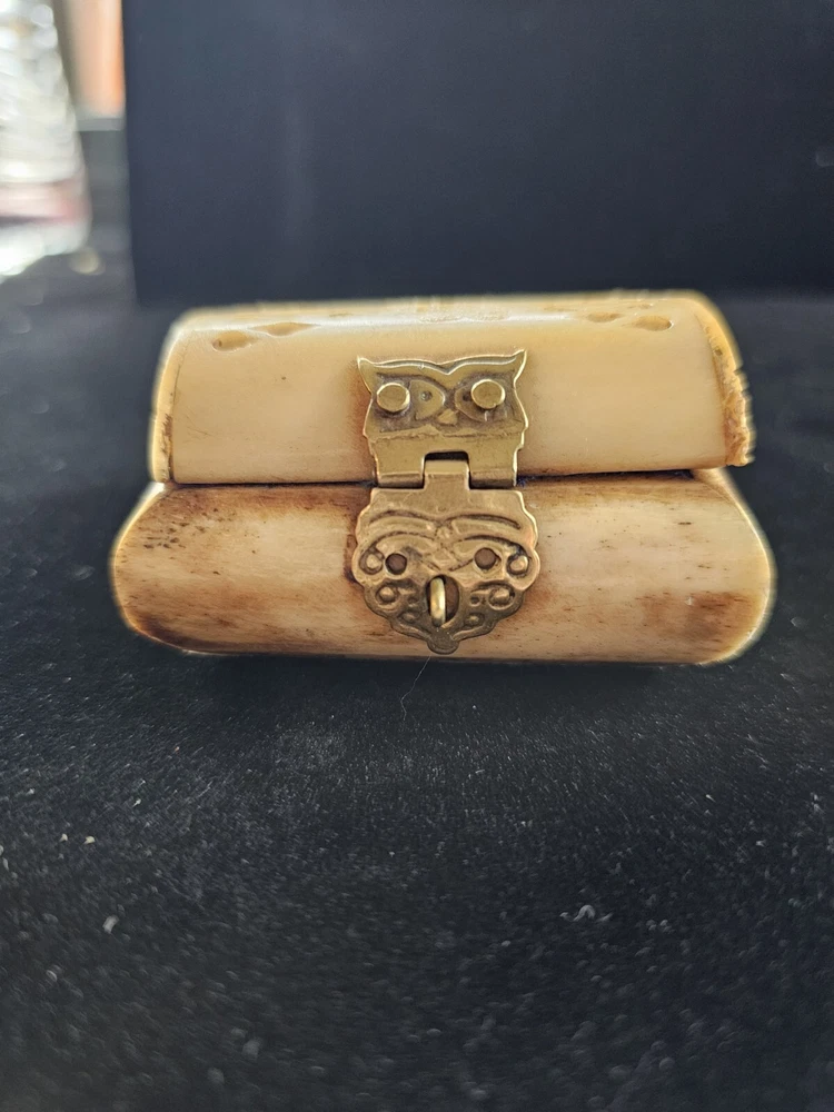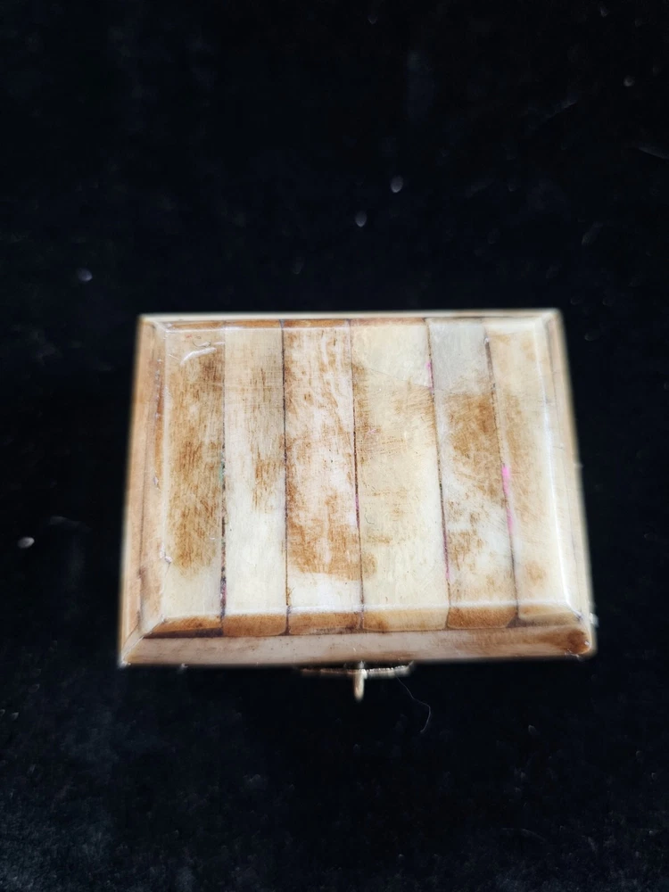 This vintage trinket box is a unique addition to any room. Handmade in India from bone material, it features an all-over pattern and a hinged lid with press fastening closure. The box is small in size, making it perfect for storing jewelry or other small items. 2.5 inches long and 1.5 inches tall The box comes in a natural finish and is suitable for all occasions. It is part of the Keepsake Boxes collection and is an original piece. The box also has carvings and comes with a lid. It weighs 3 oz and is perfect for teens and adults. This is a one-of-a-kind item that is sure to add a touch of art and novelty to any decor.