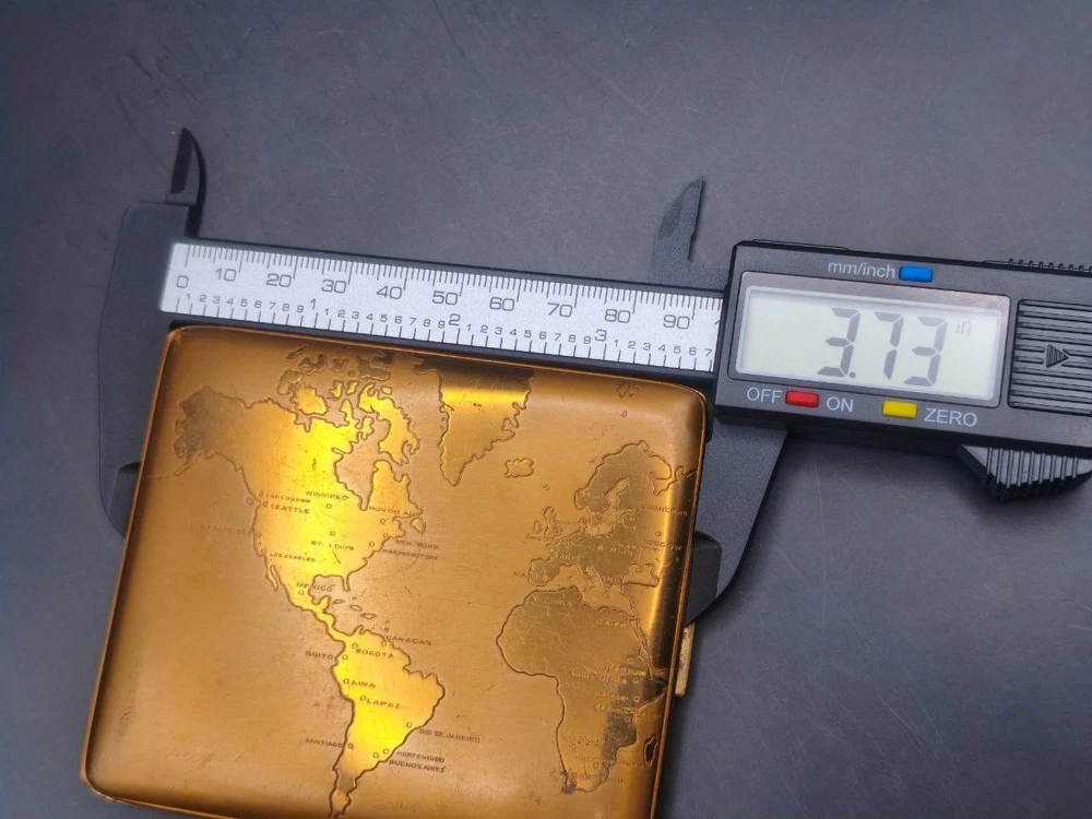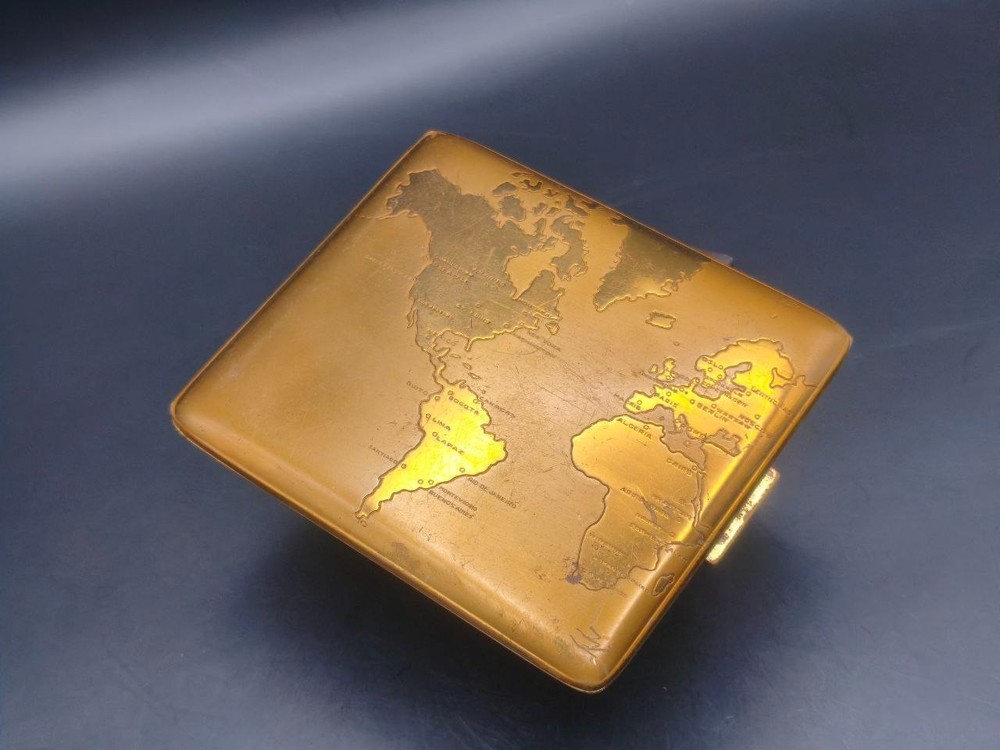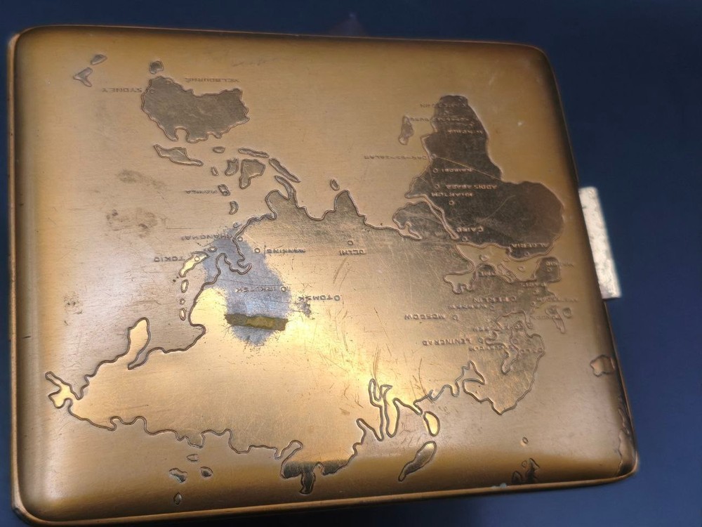A stunning and historically rich vintage brass cigarette case featuring a detailed engraved world map on both sides. Manufactured by L.S. Mayer & Co. Ltd (Birmingham, England) — a renowned British maker active during the 1930s–1940s, known for high-quality brass and gilt smoking accessories. Inside, the case bears a remarkable wartime dedication dated 25th August 1941, reading: “To Sgt. Major Eldridge in appreciation of valuable service, from 15th A.A. Battery personnel.” A true collector’s piece with authentic provenance and character. ✅ Key Features: ✅ Original L.S.M. (L.S. Mayer & Co. Ltd) hallmark with “FOREIGN” export mark ✅ Engraved world map motif on both sides ✅ Dated 25th August 1941 – authentic wartime presentation ✅ Inner fabric strap (original, yellow) intact and functional ✅ Made in Birmingham, England ✅ Clasp and hinge work perfectly – opens and closes smoothly ✅ Preserved in original, unpolished condition to maintain its patina and historical authenticity ⚙️ Condition: Good vintage condition with visible wear, scratches, and age patina consistent with an 80-year-old piece. The map engraving remains clear and well-defined. 📏 Size: 9.5 × 8.1 × 1.2 cm (3.73″ × 3.18″ × 0.47″) ⚖️ Weight: approx. 130 g (0.29 lb) A unique collector’s item combining wartime history, craftsmanship, and artistry — perfect for collectors of vintage tobacciana, military memorabilia, or early 20th-century design. ✅ Shipping to the USA — all import duties & taxes are fully covered by us. You won’t need to pay anything extra upon delivery.