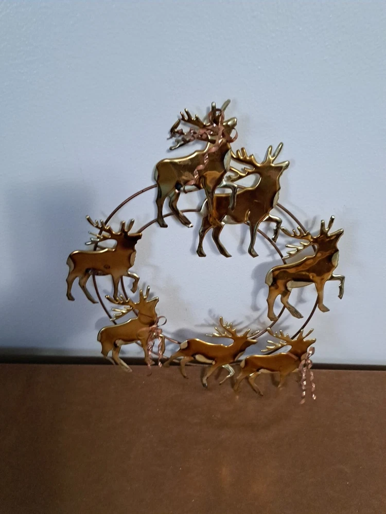Vintage Brass And Copper Reindeer Wreath. Delicate bows and metal sculpture Reindeer. Some age wear and rust, welds are slightly worn.