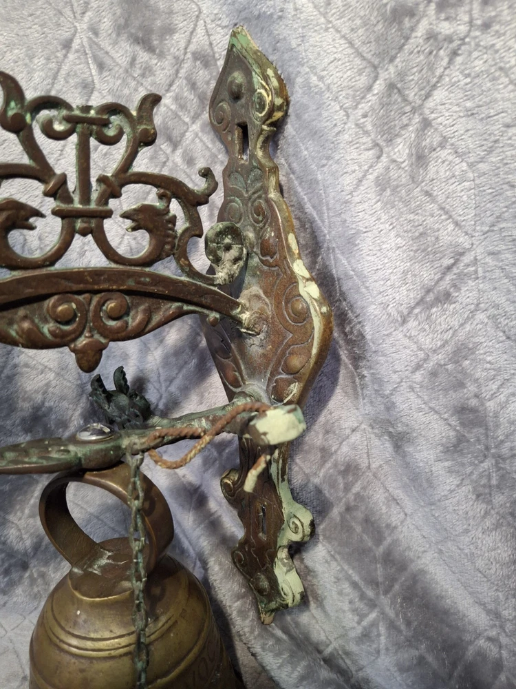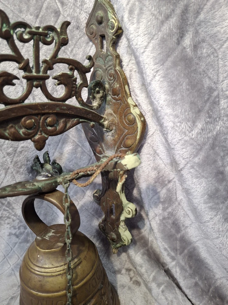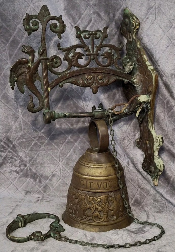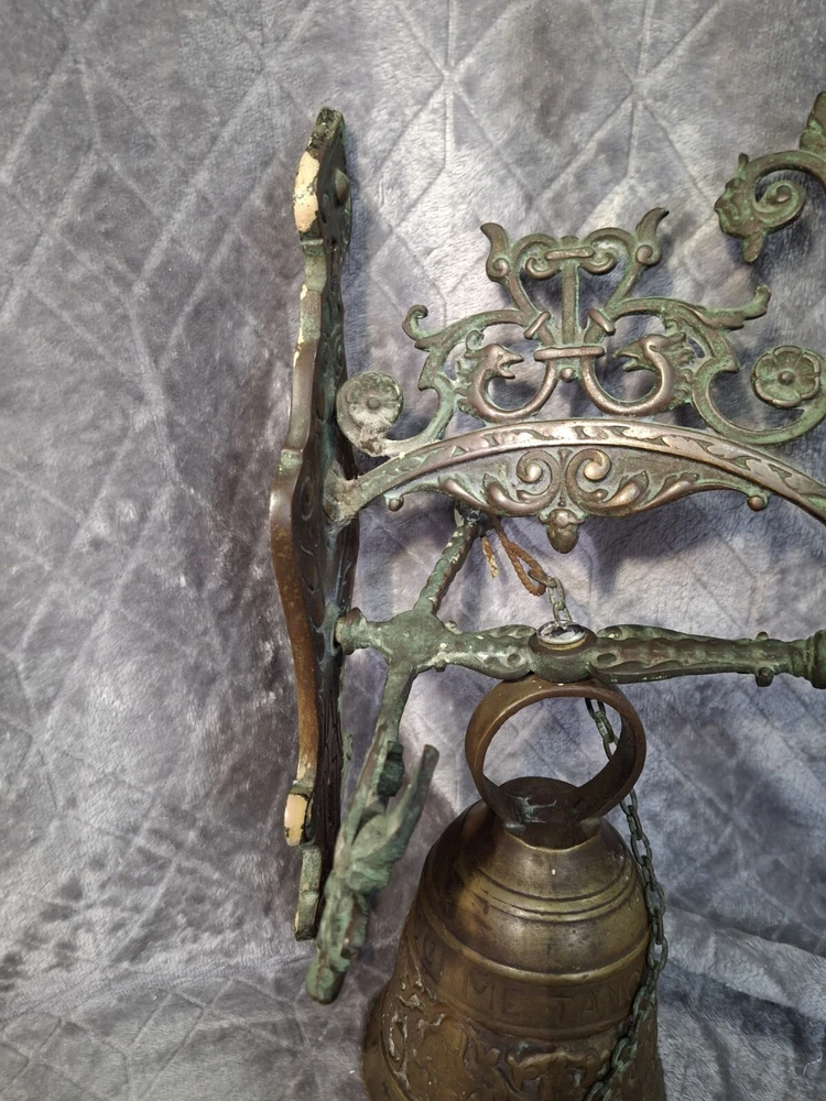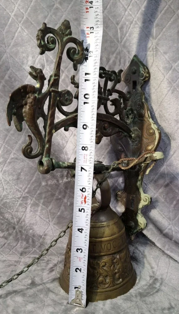Dragon Wall Mount Audit Qui Me Tangit Vocem Meam Vintage Brass Church Bell Metal Hanger Inscribed with "Audit qui me tangit vocem meam" I looked this phrase up on the internet, and this is what information Ifound - This is often found engraved on church bells and it literally means " Who touches me hears my voice ". Gorgeous vintage bell!! See photos for measurements Has very nice sound It's rather heavy - 5lbs 11.2oz Please view all photos zooming in on them as they are part of the description for you to judge condition. It does have wear, some paint and tarnish/rust/aging. Not sure if the silver screw on top that holds bell on is original see photos. The bar that has the smaller winged creature on one side and the bell ringer hanging from the other side might be a little bent - not sure so wanted to disclose