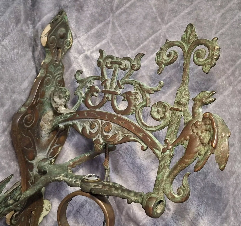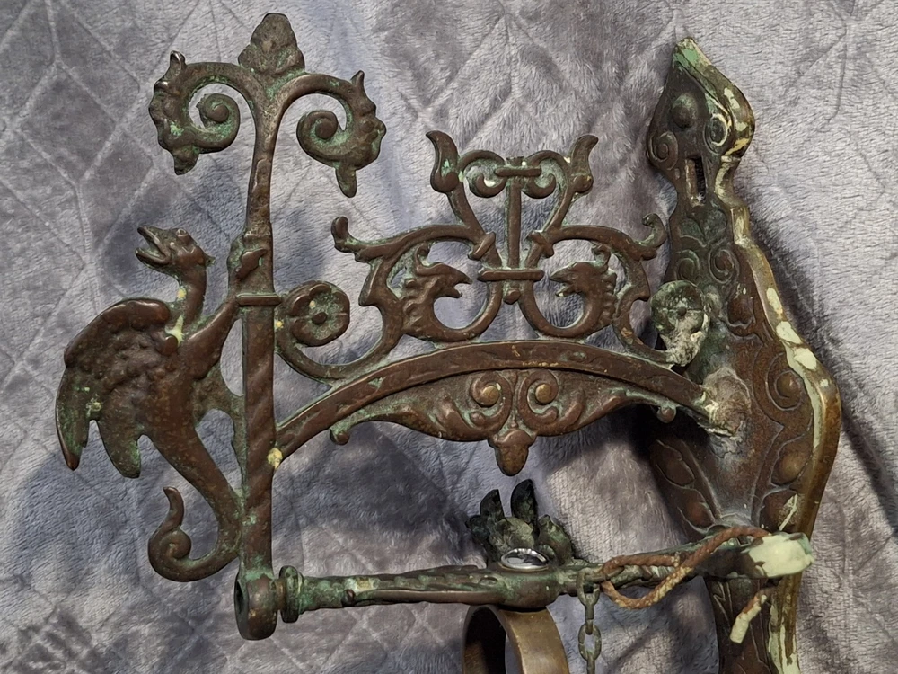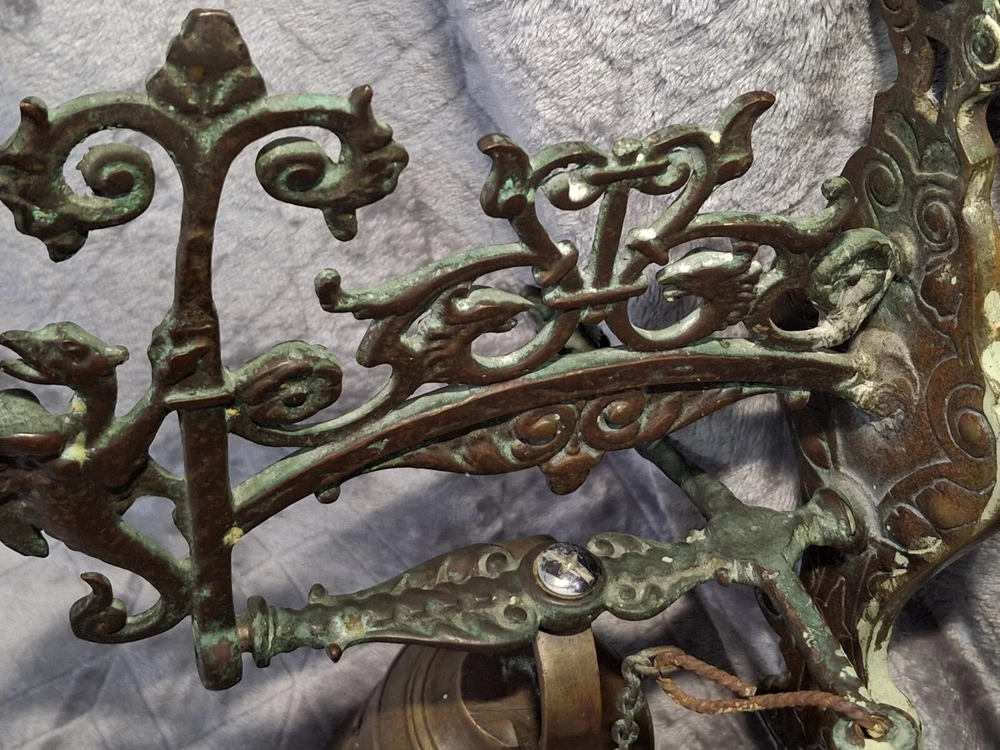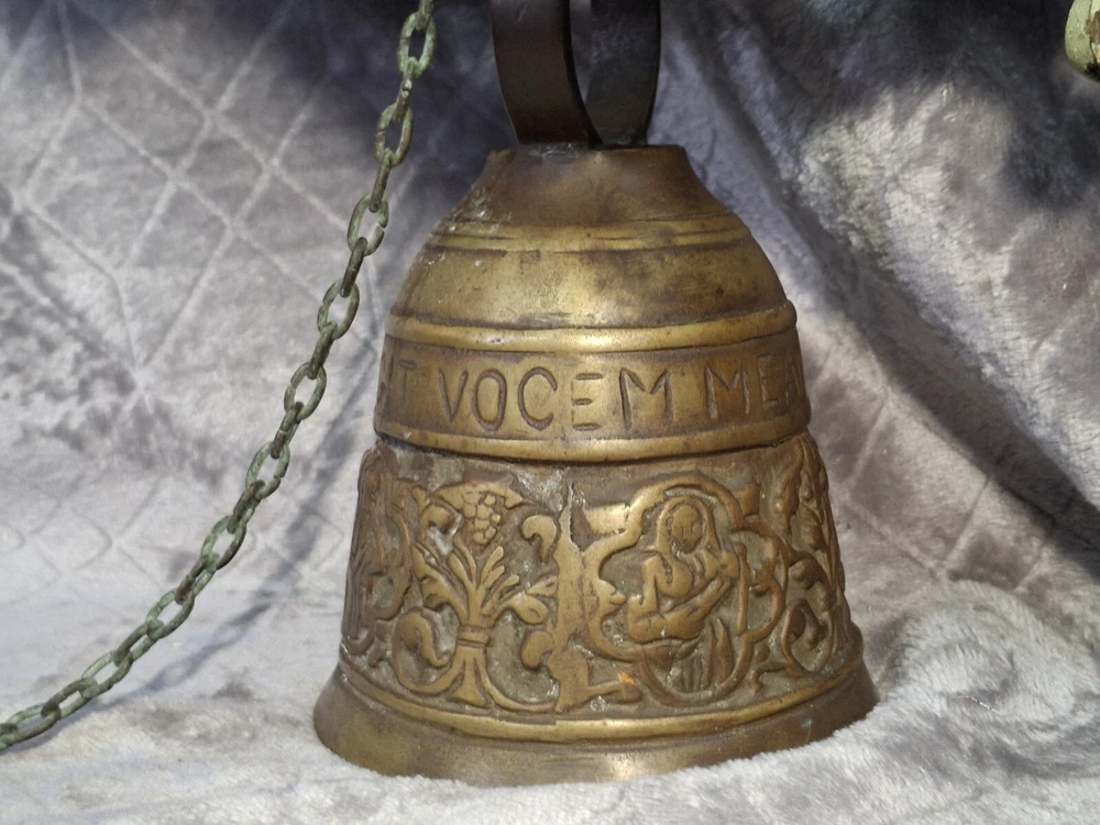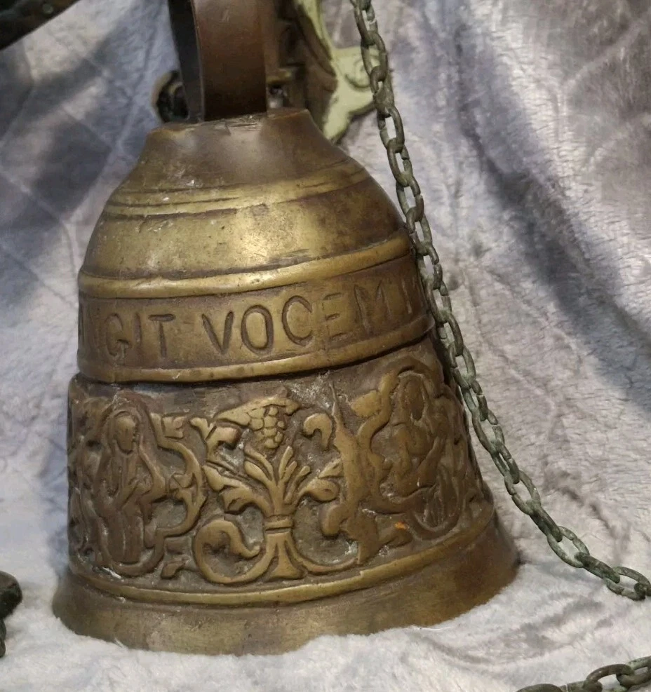 Dragon Wall Mount Audit Qui Me Tangit Vocem Meam Vintage Brass Church Bell Metal Hanger Inscribed with "Audit qui me tangit vocem meam" I looked this phrase up on the internet, and this is what information Ifound - This is often found engraved on church bells and it literally means " Who touches me hears my voice ". Gorgeous vintage bell!! See photos for measurements Has very nice sound It's rather heavy - 5lbs 11.2oz Please view all photos zooming in on them as they are part of the description for you to judge condition. It does have wear, some paint and tarnish/rust/aging. Not sure if the silver screw on top that holds bell on is original see photos. The bar that has the smaller winged creature on one side and the bell ringer hanging from the other side might be a little bent - not sure so wanted to disclose