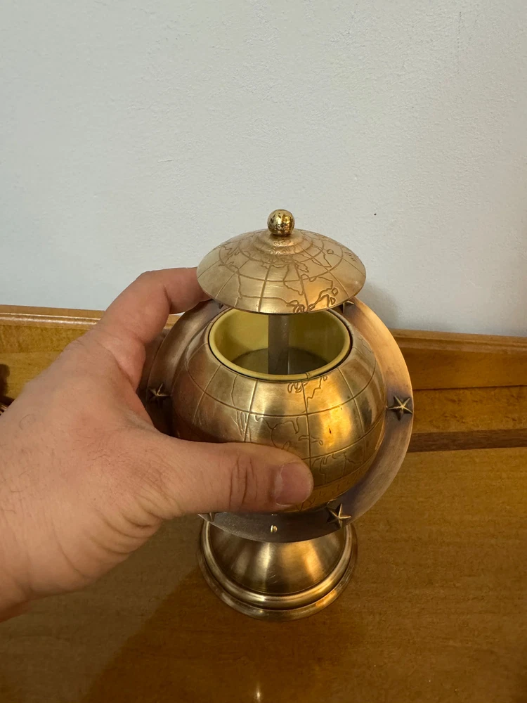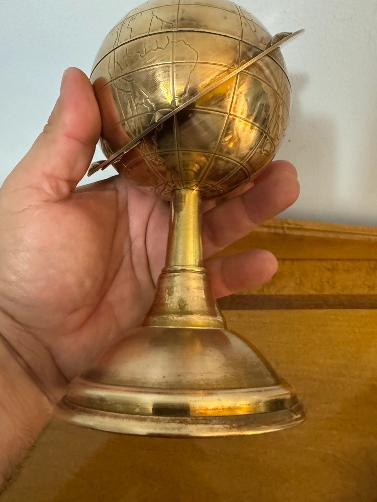 Uncover the unique appeal of this exceptional vintage brass globe cigarette dispenser holder. This stunning piece is a perfect addition to elevate any collection, showcasing a distinctive MCM style! CONDITION: It is pre-owned but in good condition. It has some scratches and a bit of age patina, but it is still beautiful and functional. See the attached photos. Color: Brass Materials: Brass, aluminium Measurements: 8.25 in. H x 5 in. W x 4.25 in D, approximately "All our items are sold as is." We are committed to providing you with the best customer experience and affordable prices. Thank you for supporting our small business and for contributing to a better, cleaner world.