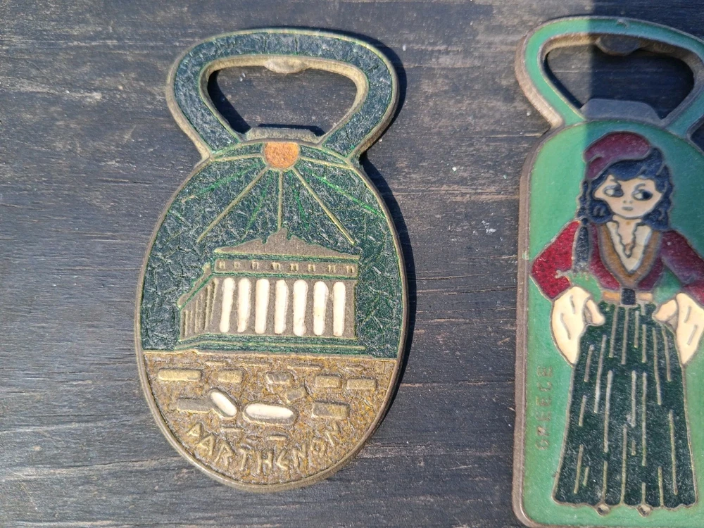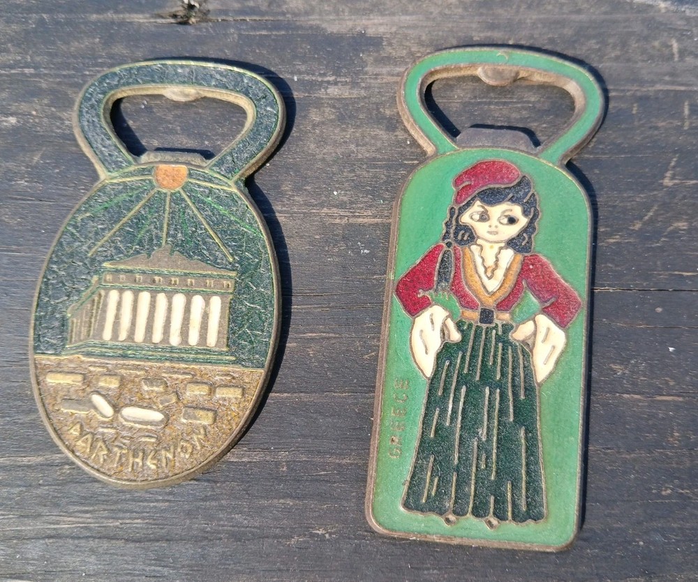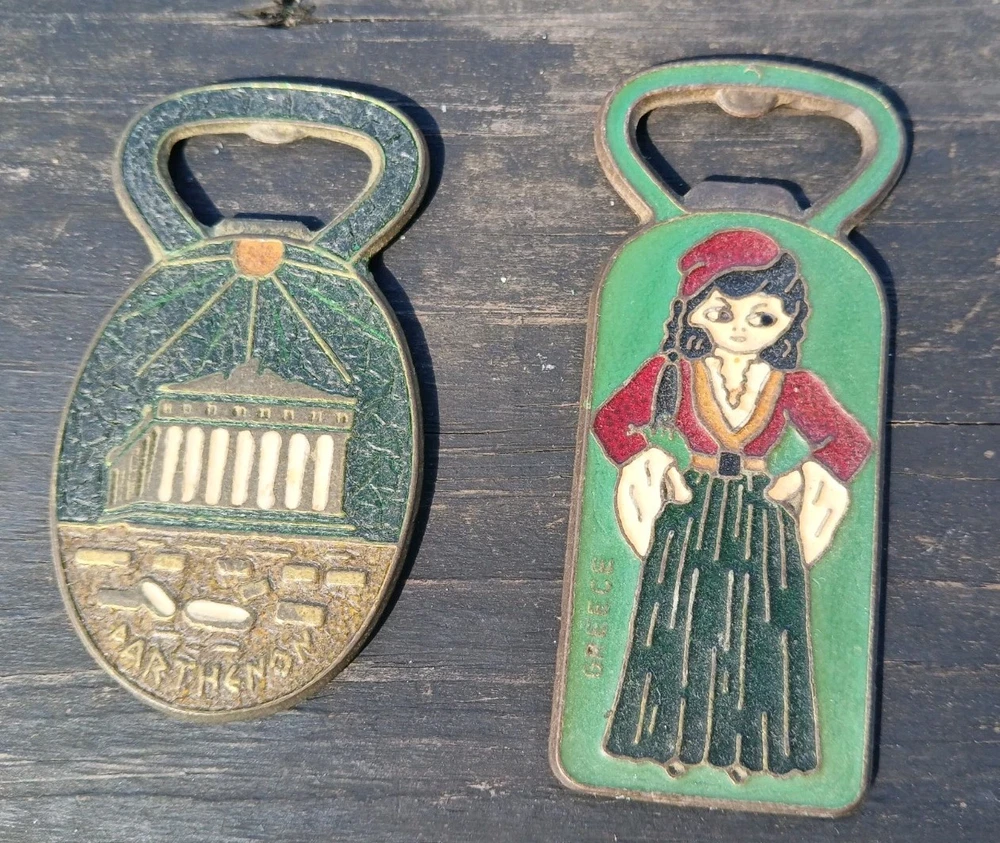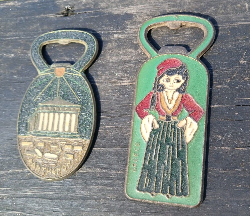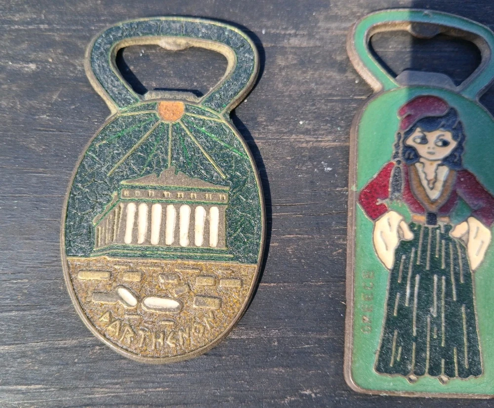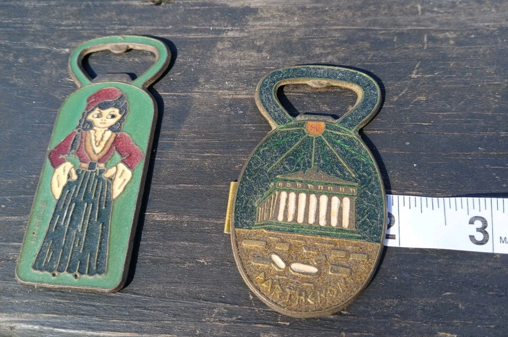 This is a vintage set of two Greek bottle openers, made of enamel on brass. They are from Athens Greece and features dancing Greek women and Parthenon.