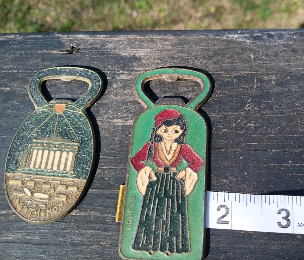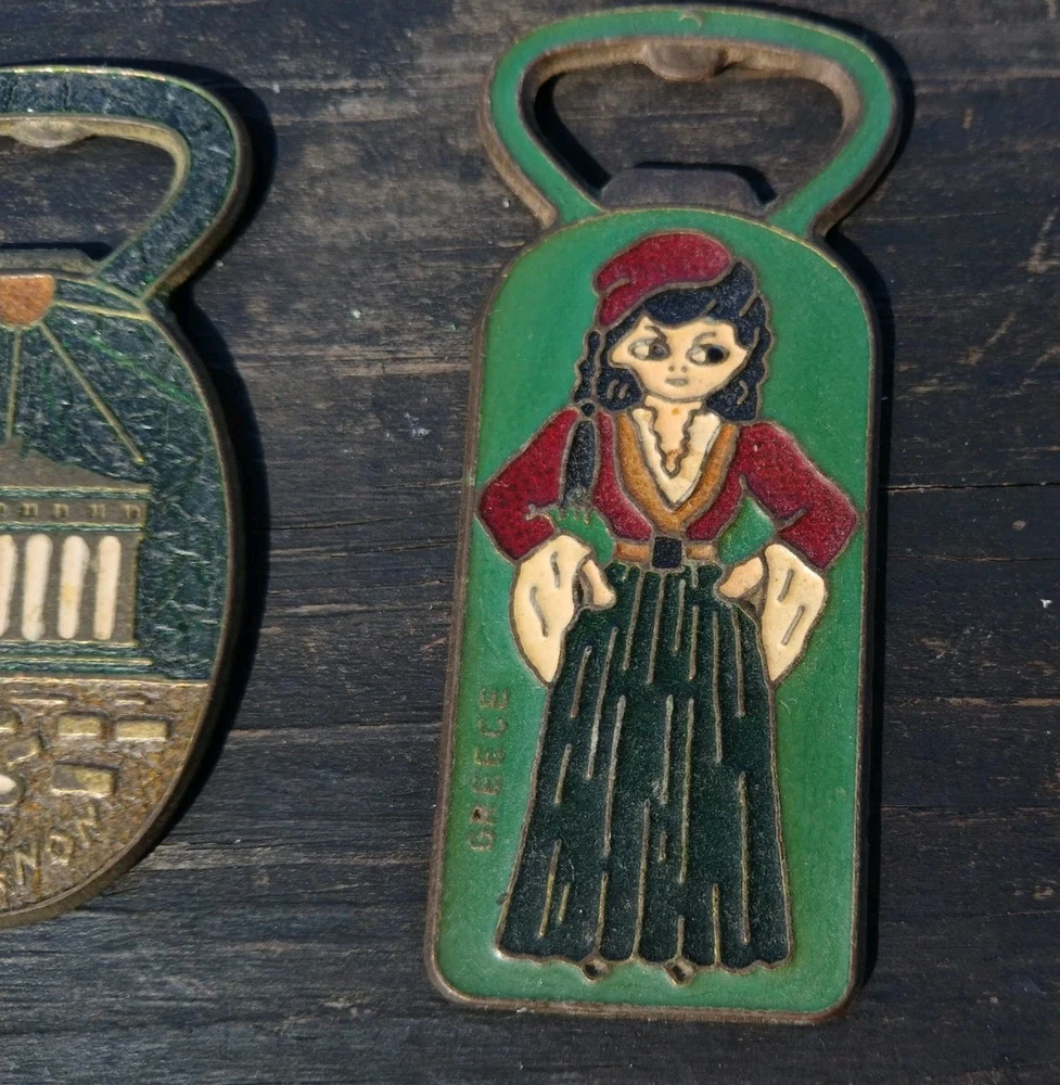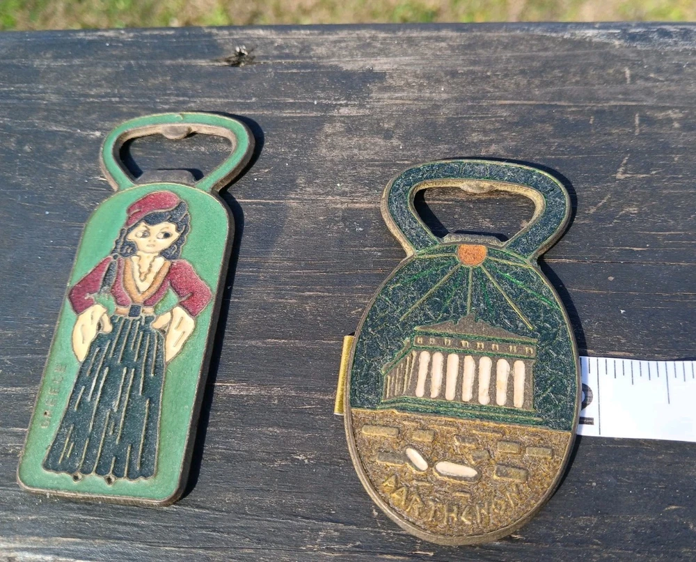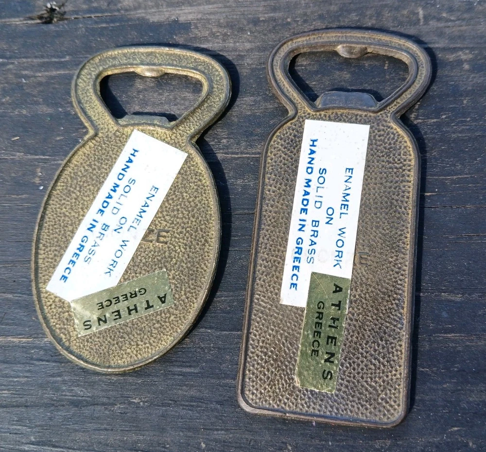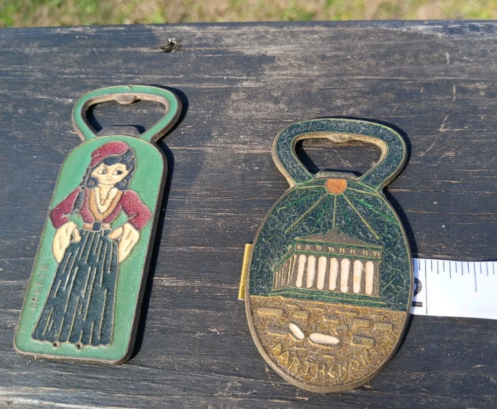 This is a vintage set of two Greek bottle openers, made of enamel on brass. They are from Athens Greece and features dancing Greek women and Parthenon.