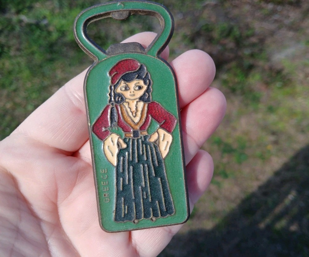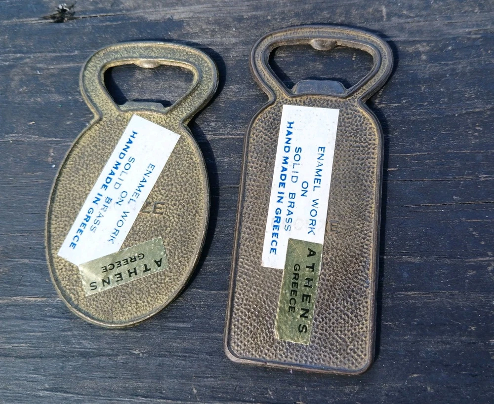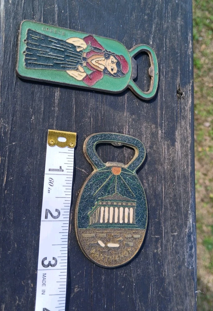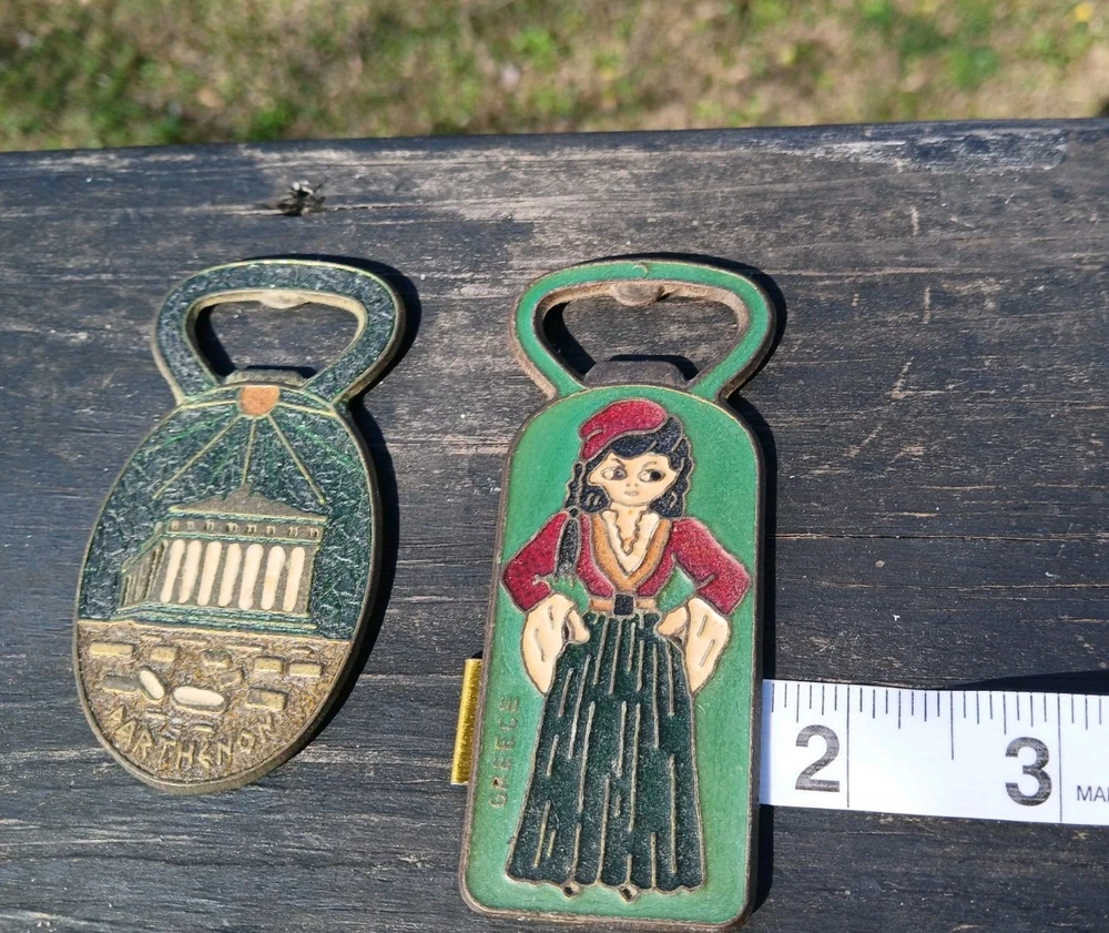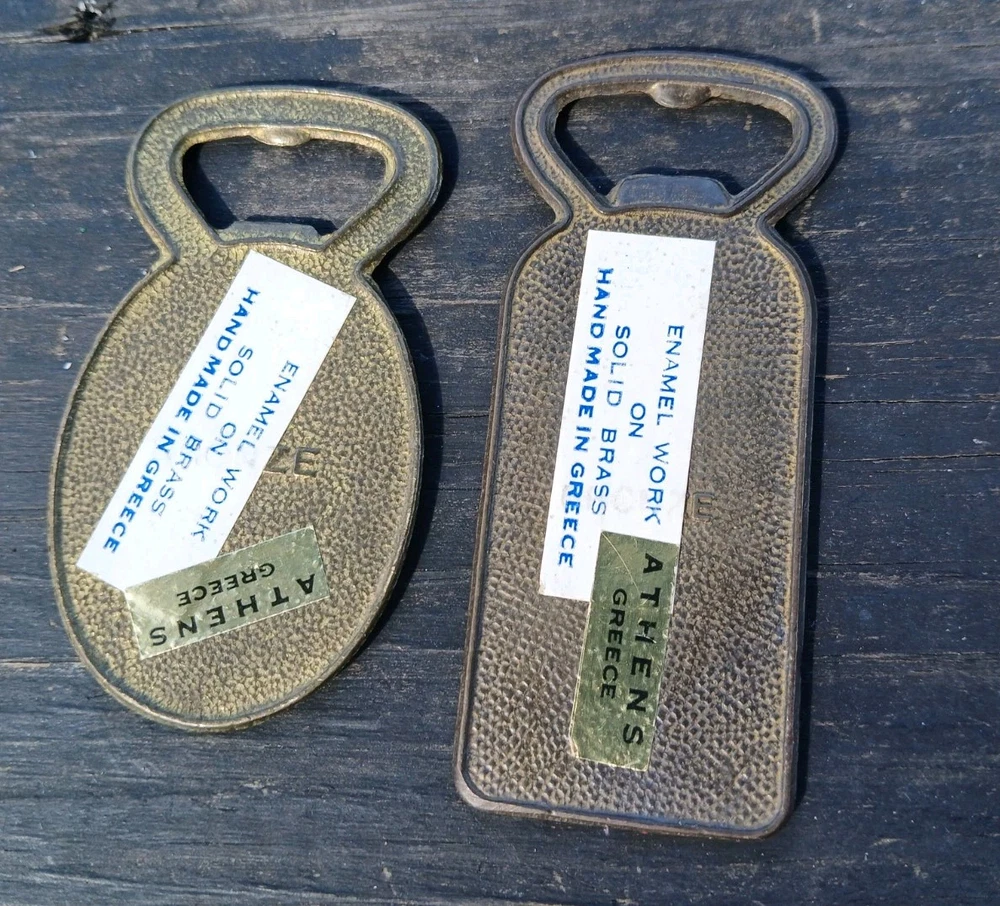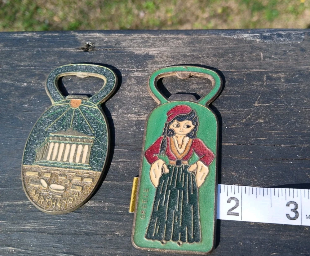This is a vintage set of two Greek bottle openers, made of enamel on brass. They are from Athens Greece and features dancing Greek women and Parthenon.