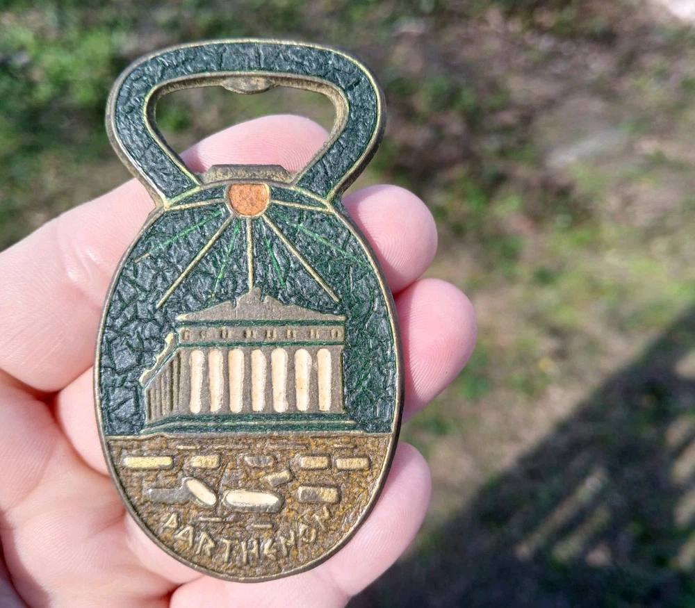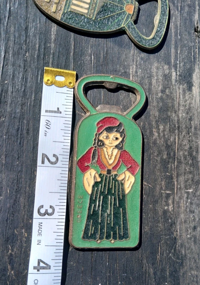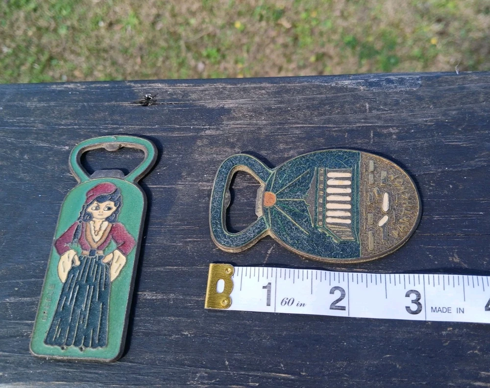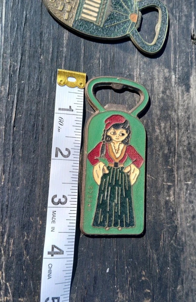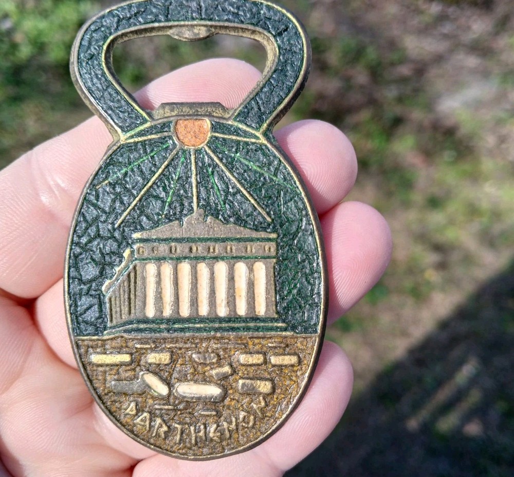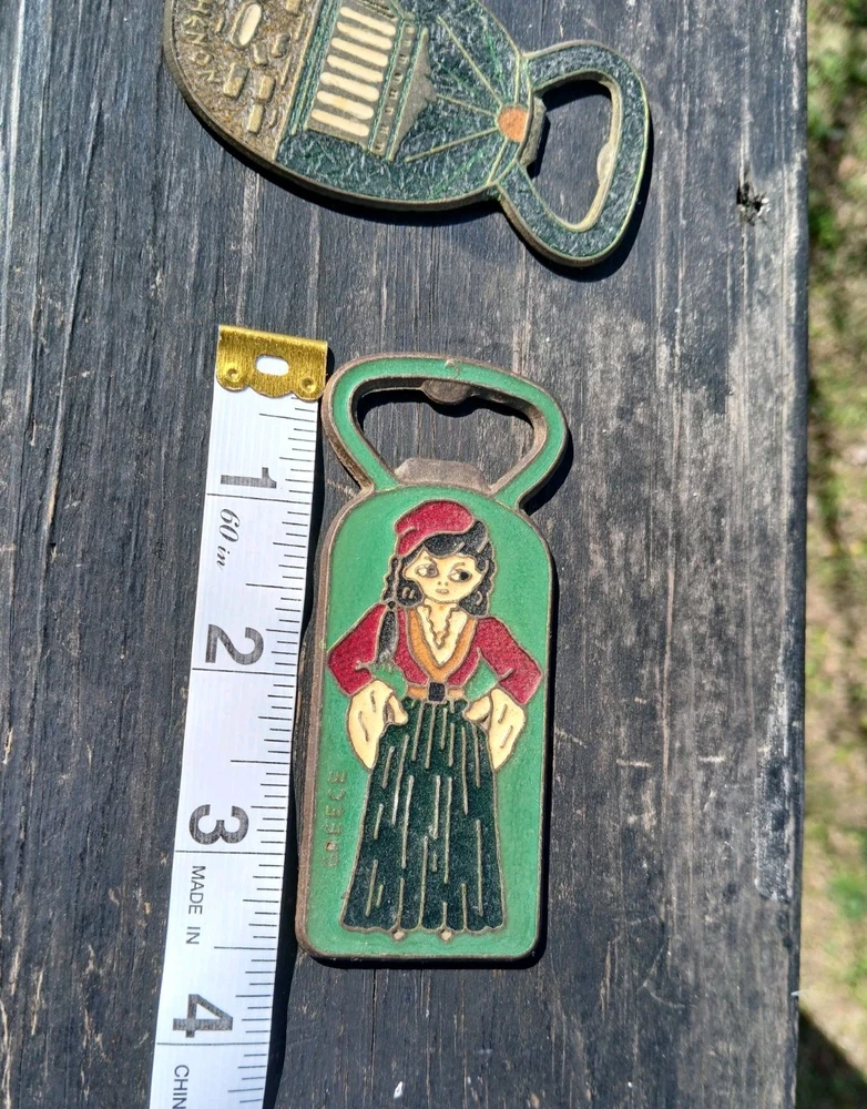 This is a vintage set of two Greek bottle openers, made of enamel on brass. They are from Athens Greece and features dancing Greek women and Parthenon.