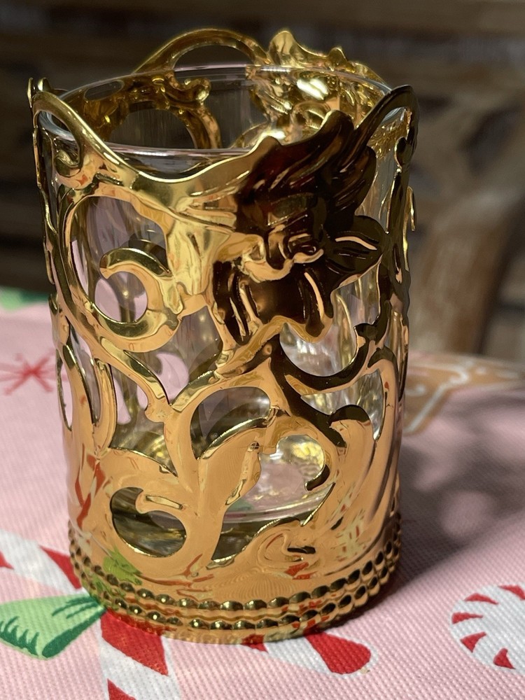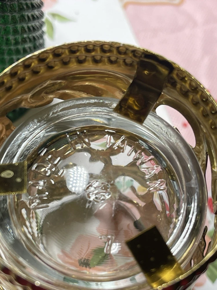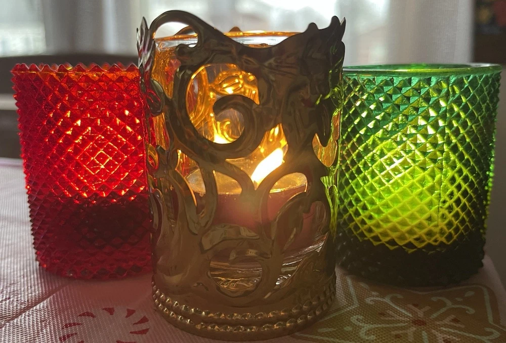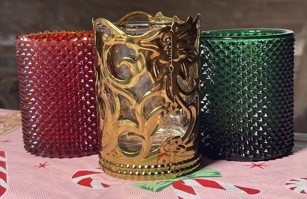 Vintage Brass Green and Red Glass Votive Candle Holders 3” Christmas