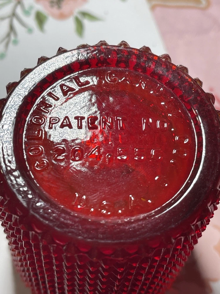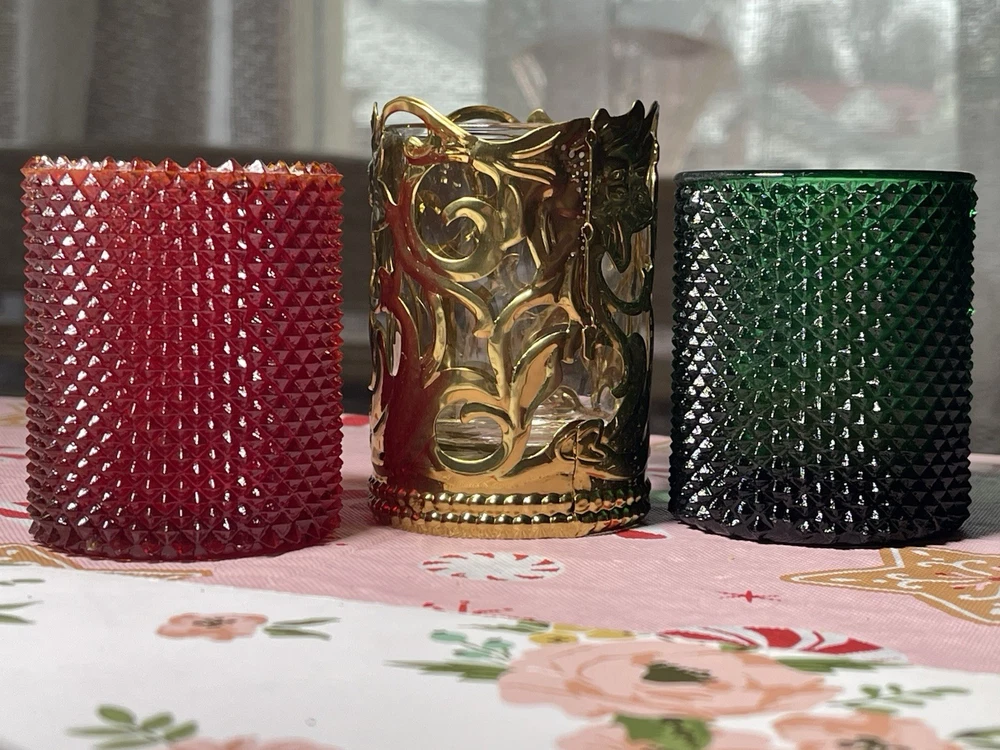 The product is a set of three round vintage brass and glass candle holders. Measuring 2.75-3 inches in height, these classic candle holders are perfect for decorating during the Christmas season. With a glossy finish and a vintage style, these candle holders add a touch of nostalgia to any home decor. Made in Taiwan during the late 20th century, they are original pieces that bring a unique and festive charm to the holiday celebration. The red and green glass ones are the same exact pattern and size. The green one says made in Taiwan on the bottom. The red one says Colonial Candle Company, USA. The brass one says made in Taiwan on the bottom of the clear glass. The brass piece is unmarked. 3 Gorgeous little vintage pieces! Thank you!