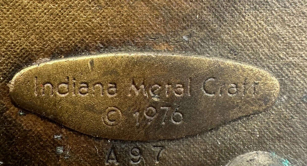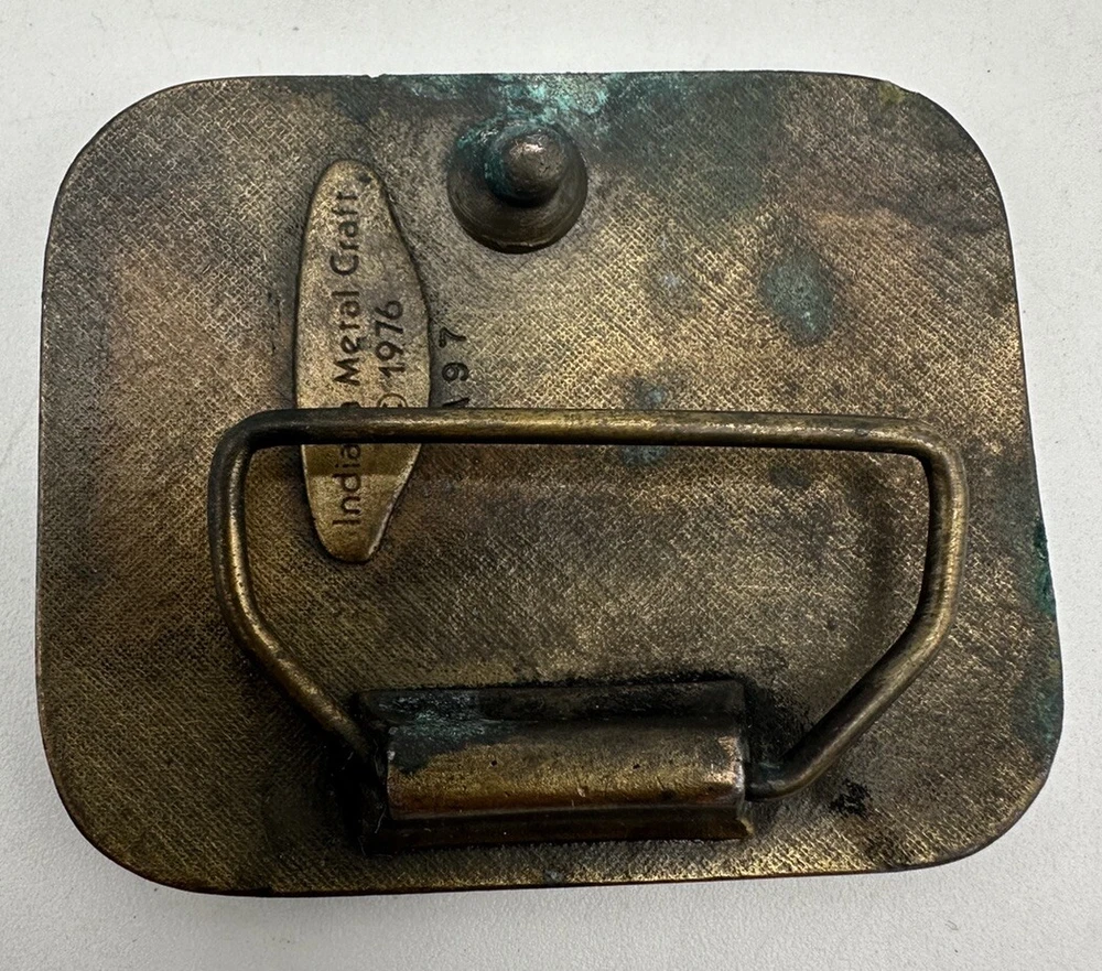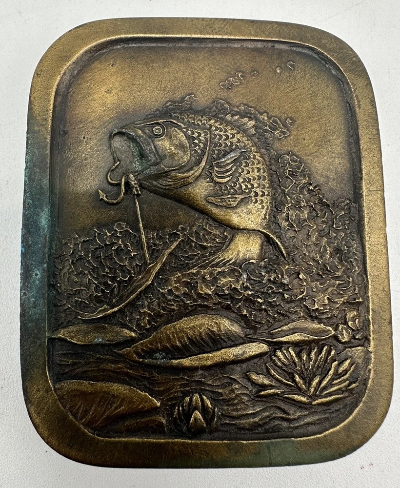 This vintage brass belt buckle from Indiana Metal Craft features a bass fish pattern with accents of bronze color. The buckle is 2 1/4" wide and fits a 1.75" belt. It was produced in 1976 and is a great addition to any collection. The buckle is perfect for men who love fishing and want to add a unique touch to their accessory collection. The hardware material is brass and the style is a single tongue buckle. This item is perfect for those who appreciate vintage accessories and want to make a statement.