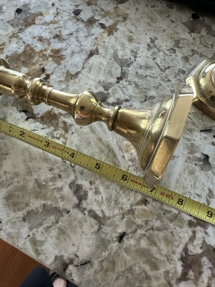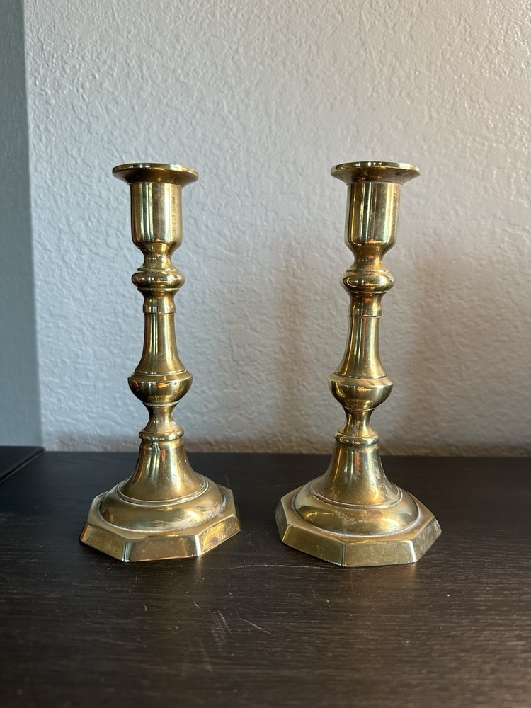 🕯️ Timeless pair of solid brass candlestick holders 📏 7.25” tall × 3” octagonal base × 1” candle cup 🏡 Perfect for colonial, farmhouse, traditional, or vintage-style decor 🌟 Beautiful aged brass with light patina – full of character! 💪 Heavy and sturdy — true vintage quality 🎁 Makes a lovely gift or elegant accent for mantel, dining table, or shelf 🔎 Unsigned, mid-century or earlier reproduction of Georgian style Blessings! ⸻ 💡 Keywords vintage brass candlesticks colonial candle holders solid brass decor antique-style candlesticks farmhouse brass taper holders 7 inch brass pair octagon base candle holders mid century traditional decor classic brass home accents collectible brass pair