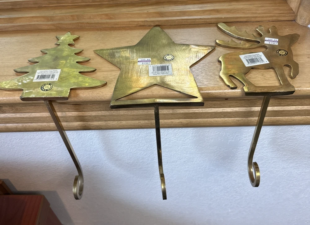 These Vintage Brass Christmas Tree, Star & Reindeer Stocking Holders are a classic addition to your holiday decor. Featuring a solid gold finish with a 3 different shapes, these medium-sized stocking hangers are made of brass and metal. The long hanging hook allows for easy display of your stockings, adding a touch of holiday cheer to your home. Crafted in India, this heavy and durable stocking holder is designed for adults and kids to enjoy for years to come. Typically ships within 24 hours of payment and is securely packaged to ensure a safe delivery to you. Thank you for looking!