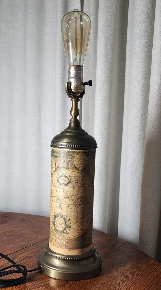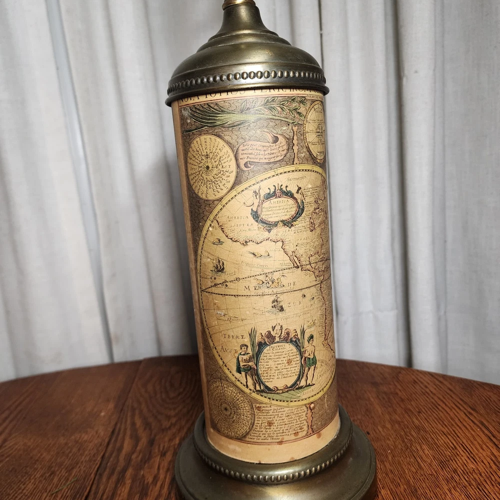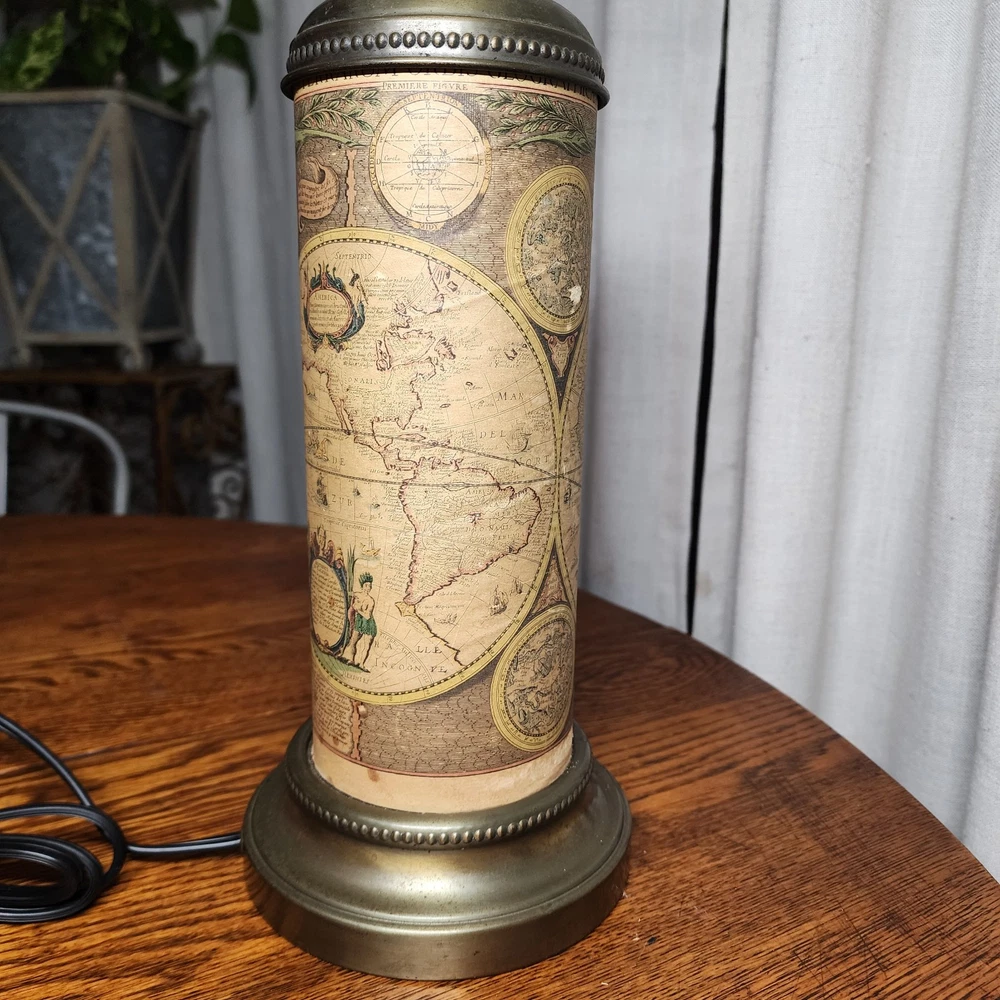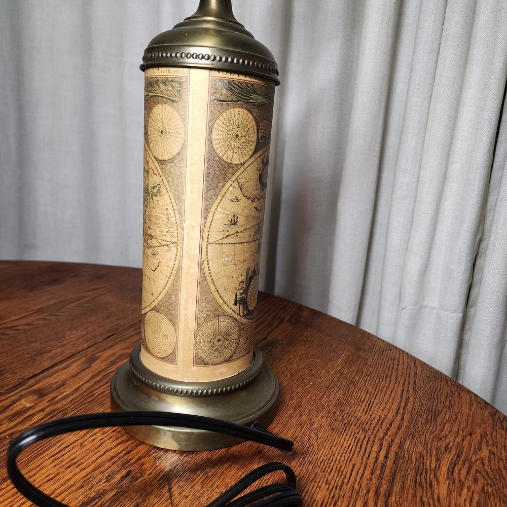 Material: Brass Vintage: Yes Pattern: World Map Control Style: Knob Control Department: Unisex Baby & Toddler, Boys, Girls, Unisex Kids, Teens, Unisex Adults Cord Color: Brown Light Color: Clear, White, Yellow Design: old world Original/Reproduction: Original Type: Table Lamp Time Period Manufactured: 1950-1959 Color: Gold Brand: Unbranded Size: Medium Style: Empire & Biedermeier Power Source: Corded Item Width: 6 in Item Height: 18 in