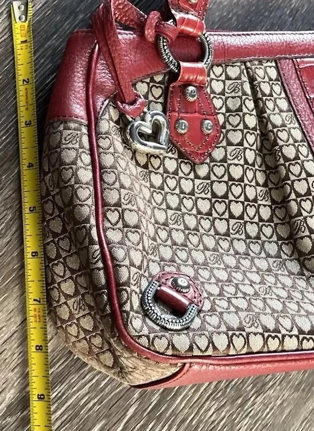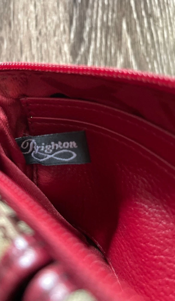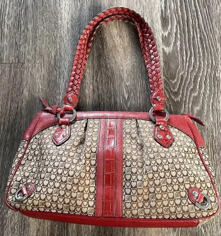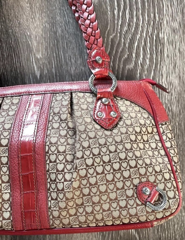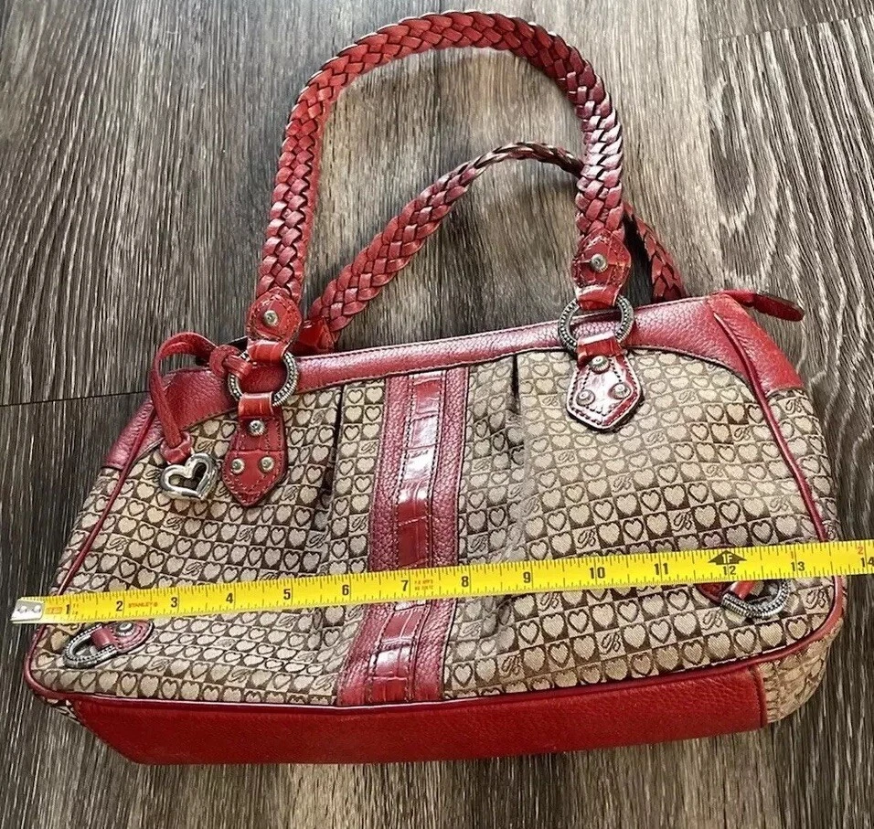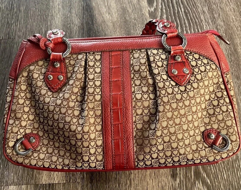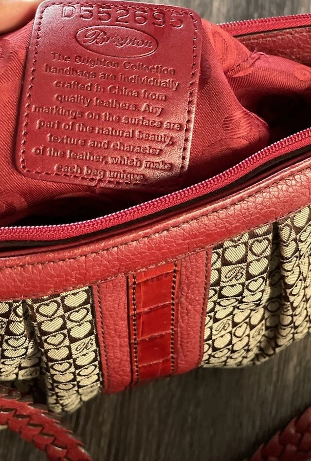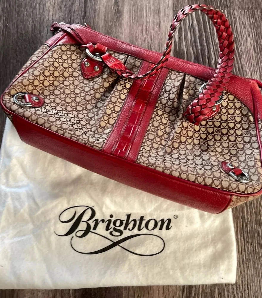 This vintage Brighton top handle bag is a stylish and versatile choice for various occasions such as travel, weddings, parties, and more. The bag features a unique red and brown exterior with accents like buckle and button details, making it a standout piece. It also includes a matching wallet and detachable crossbody strap for added convenience. The fleece fabric lining, inner pockets, and key clip offer practical functionality while maintaining a classic and elegant look. Perfect for those who appreciate designer quality with a touch of western and country-inspired charm.