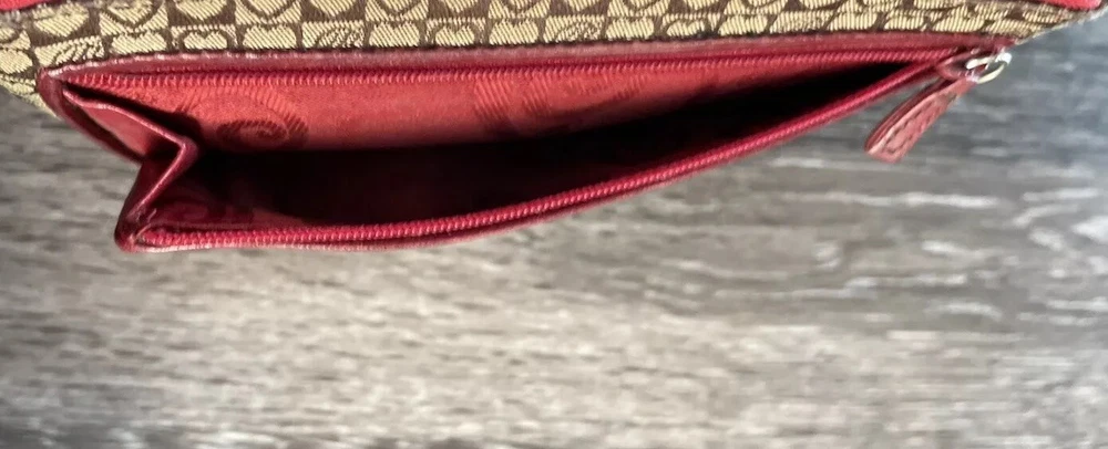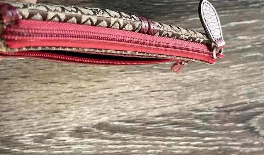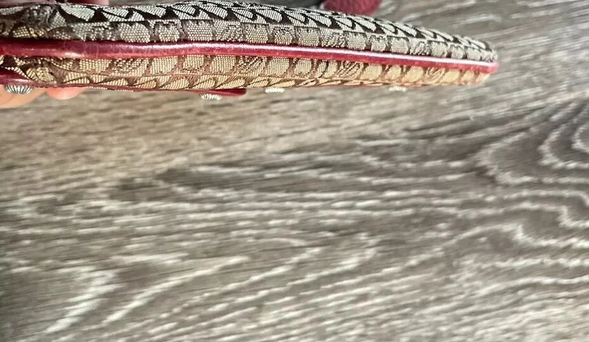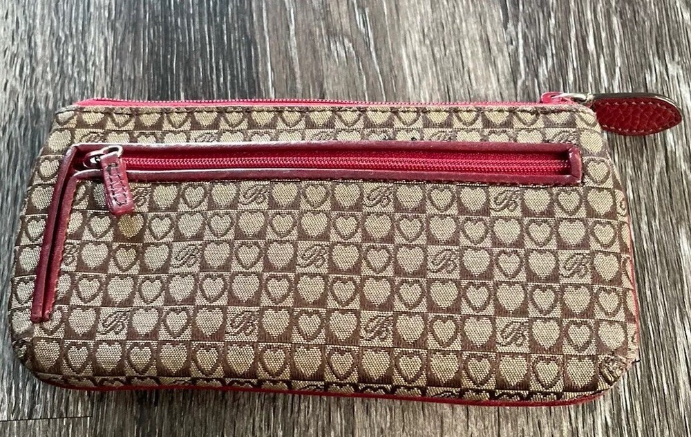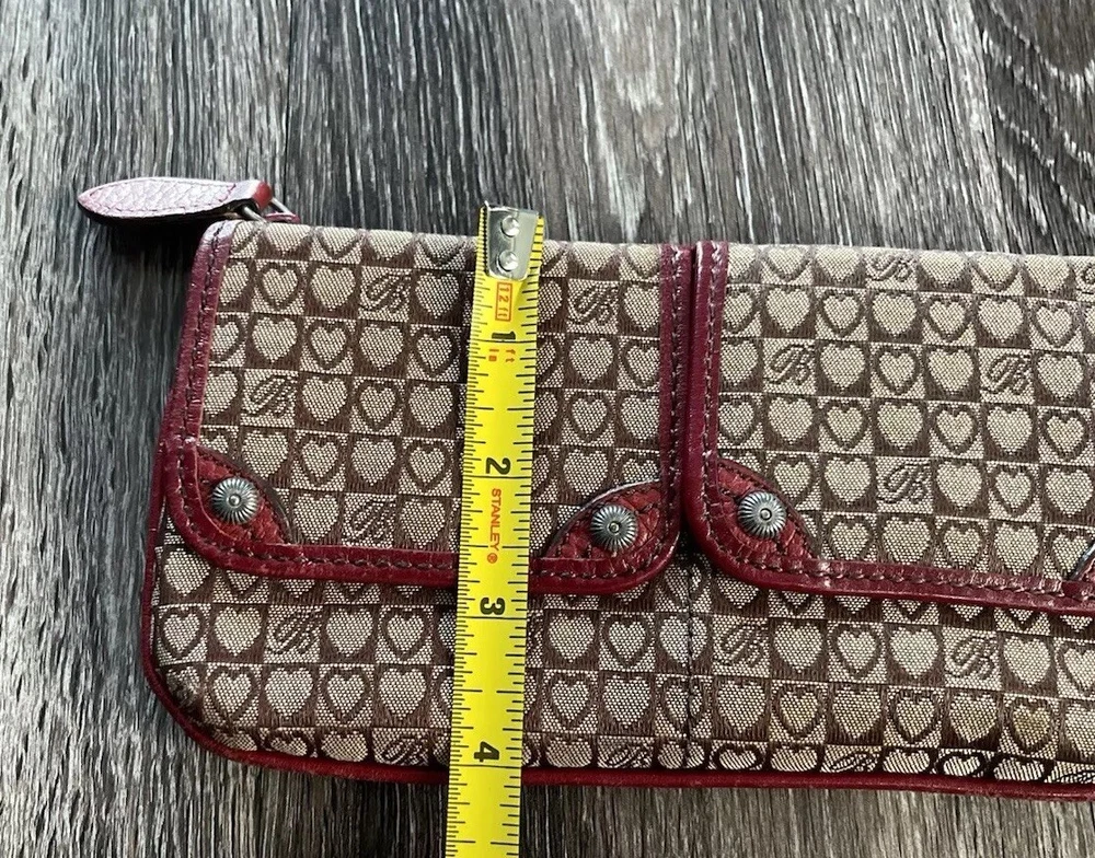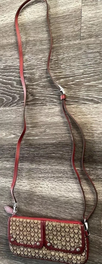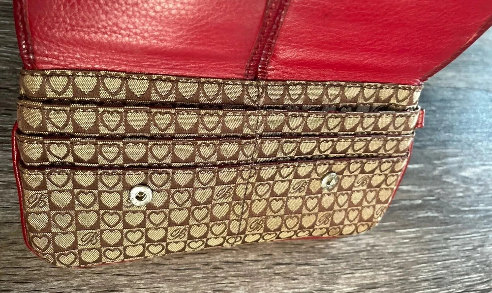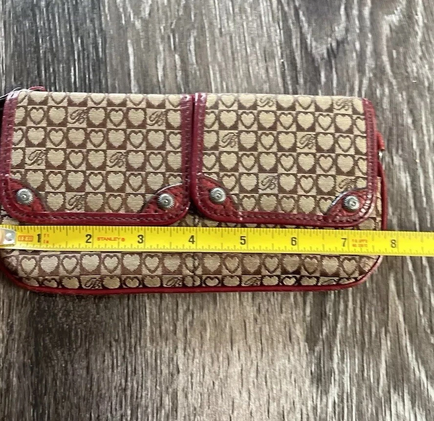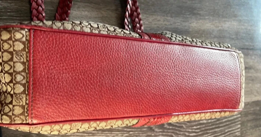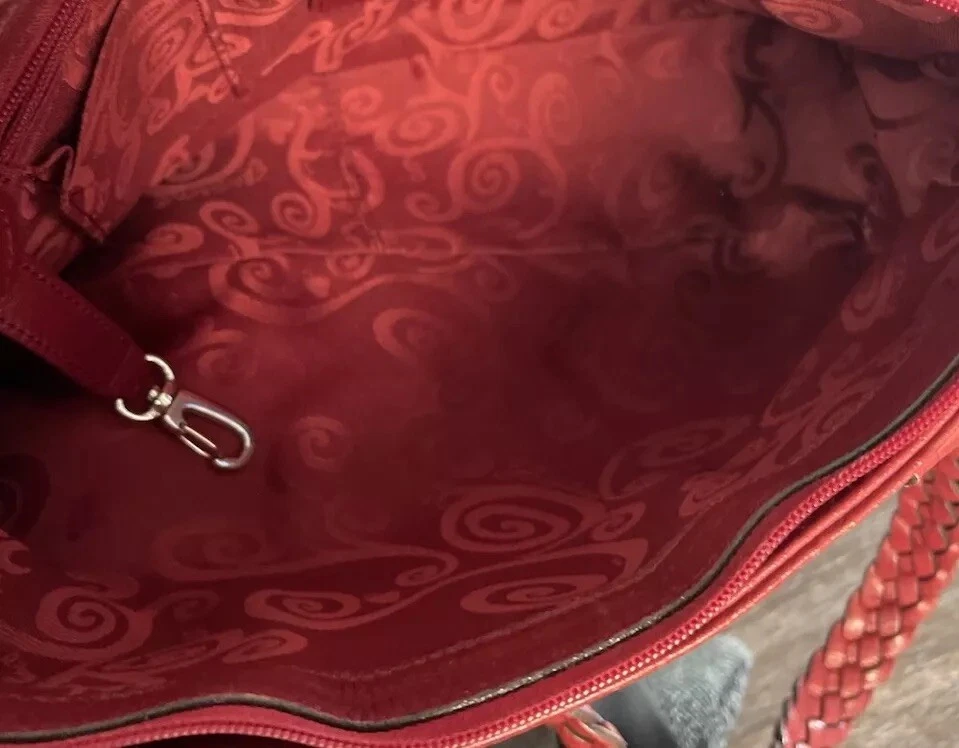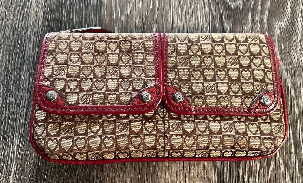 This vintage Brighton top handle bag is a stylish and versatile choice for various occasions such as travel, weddings, parties, and more. The bag features a unique red and brown exterior with accents like buckle and button details, making it a standout piece. It also includes a matching wallet and detachable crossbody strap for added convenience. The fleece fabric lining, inner pockets, and key clip offer practical functionality while maintaining a classic and elegant look. Perfect for those who appreciate designer quality with a touch of western and country-inspired charm.