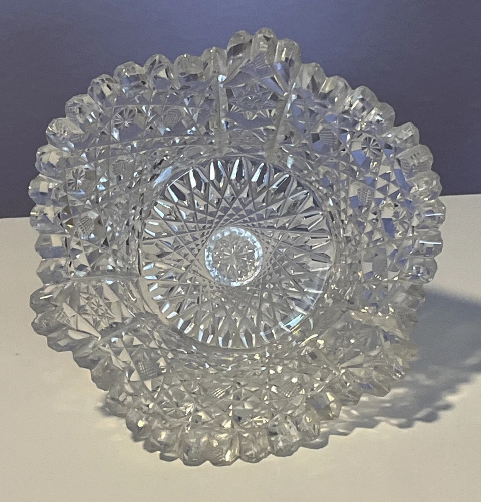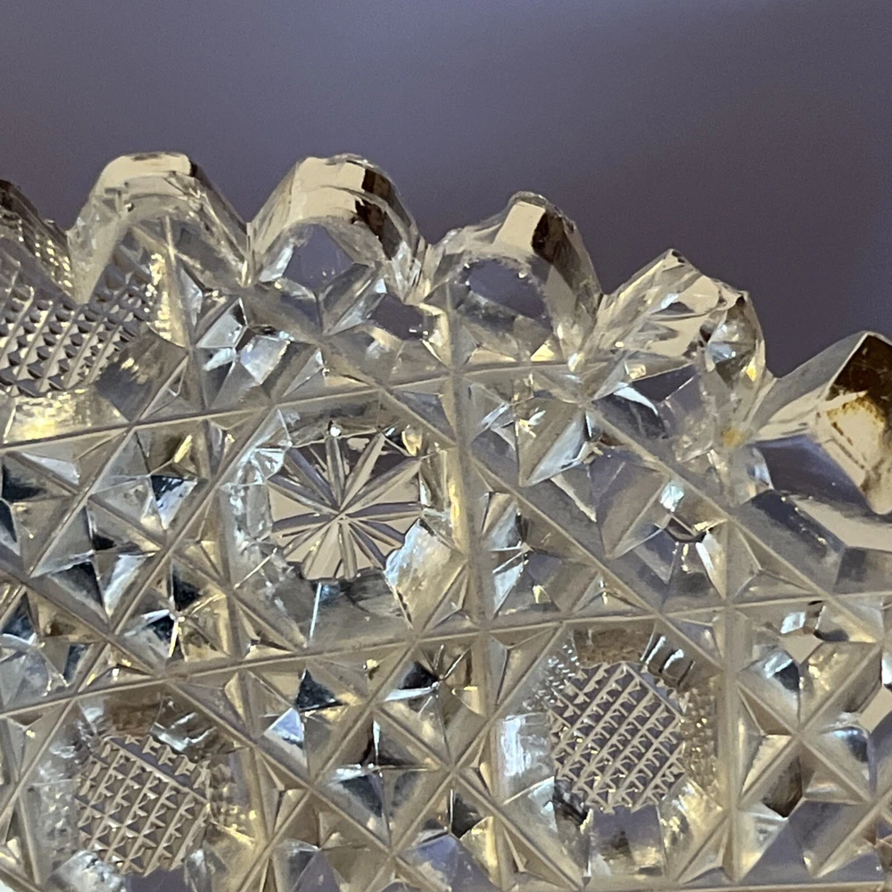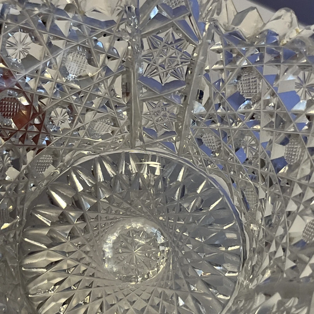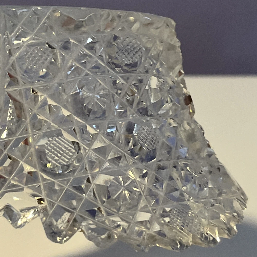 Vintage Brilliant Cut Daisy Buttons Bowl or Punch Bowl Stand - 6" diameter on open "top" portion of bow, 2.5" tall, 3.5" diameter on bottom or flat portion. This once glorious piece still have much life for display and use. It is cracked as seen in pictures so priced accordingly. The pattern picks up the light and you can feel the hand cut crystal when you pick up the piece. It's a unique pattern combo with what appears to be Daisy and Buttons interchanged with Hobstar as you go around the bowl, and it has a unique scallop at the top where it differs for these various sections. Please review all pictures carefully as they are part of the description. Questions are welcome.