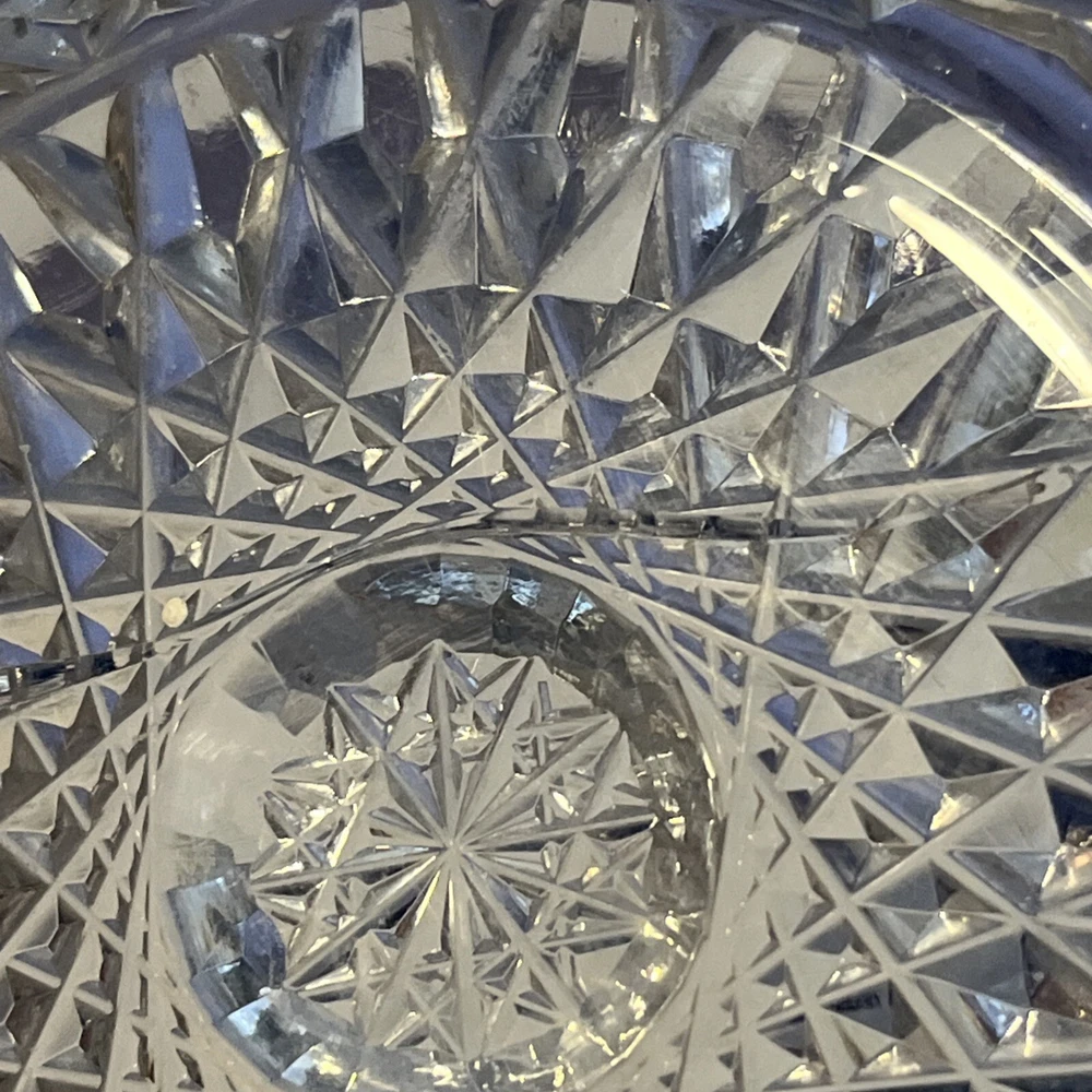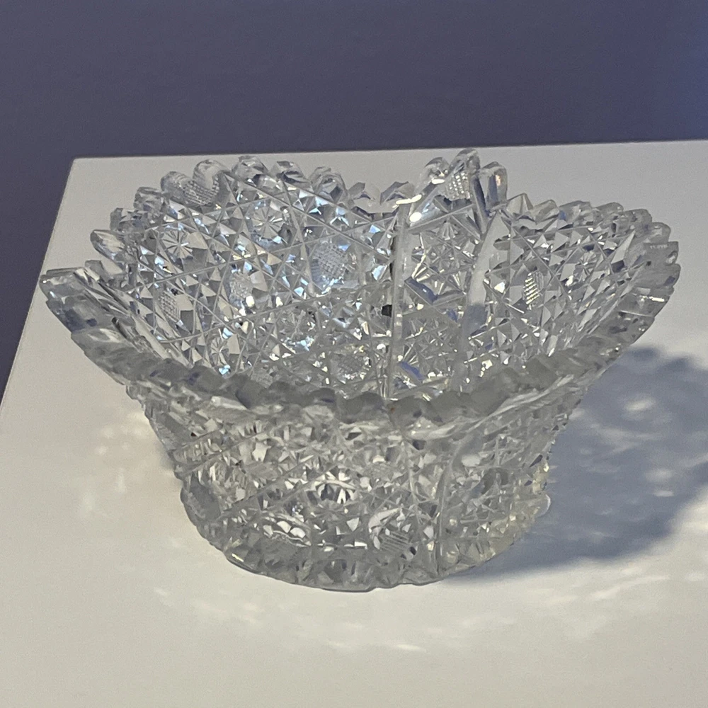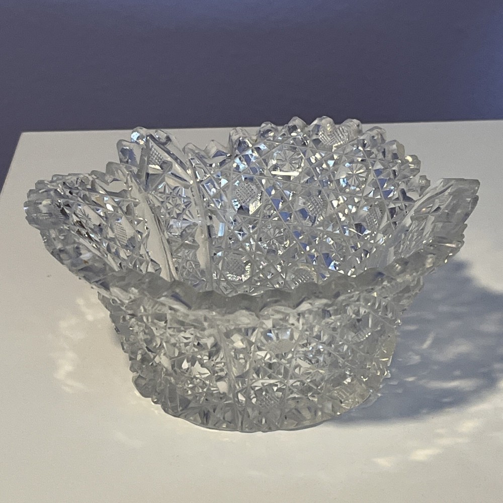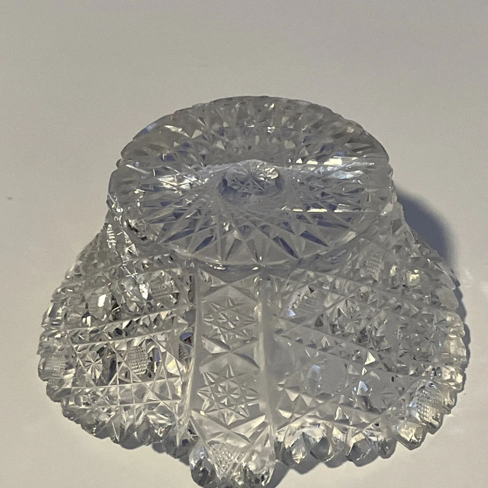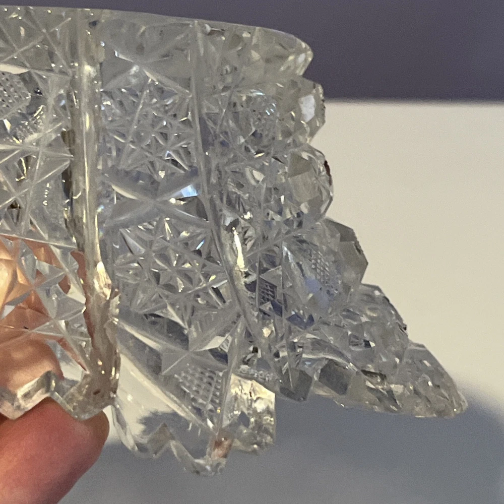 Vintage Brilliant Cut Daisy Buttons Bowl or Punch Bowl Stand - 6" diameter on open "top" portion of bow, 2.5" tall, 3.5" diameter on bottom or flat portion. This once glorious piece still have much life for display and use. It is cracked as seen in pictures so priced accordingly. The pattern picks up the light and you can feel the hand cut crystal when you pick up the piece. It's a unique pattern combo with what appears to be Daisy and Buttons interchanged with Hobstar as you go around the bowl, and it has a unique scallop at the top where it differs for these various sections. Please review all pictures carefully as they are part of the description. Questions are welcome.
