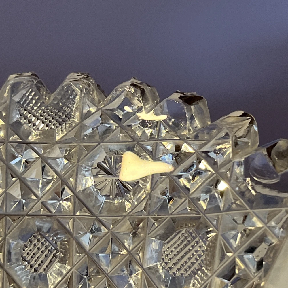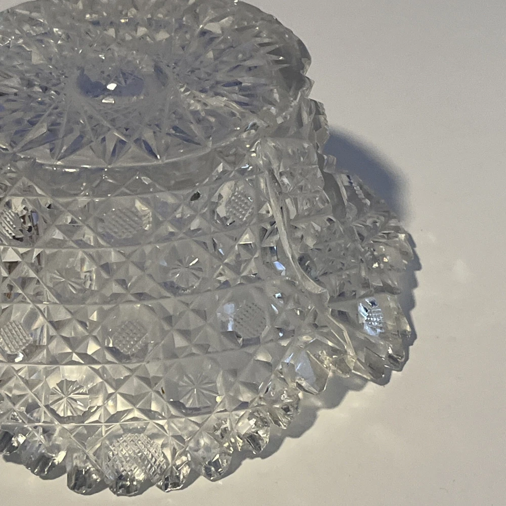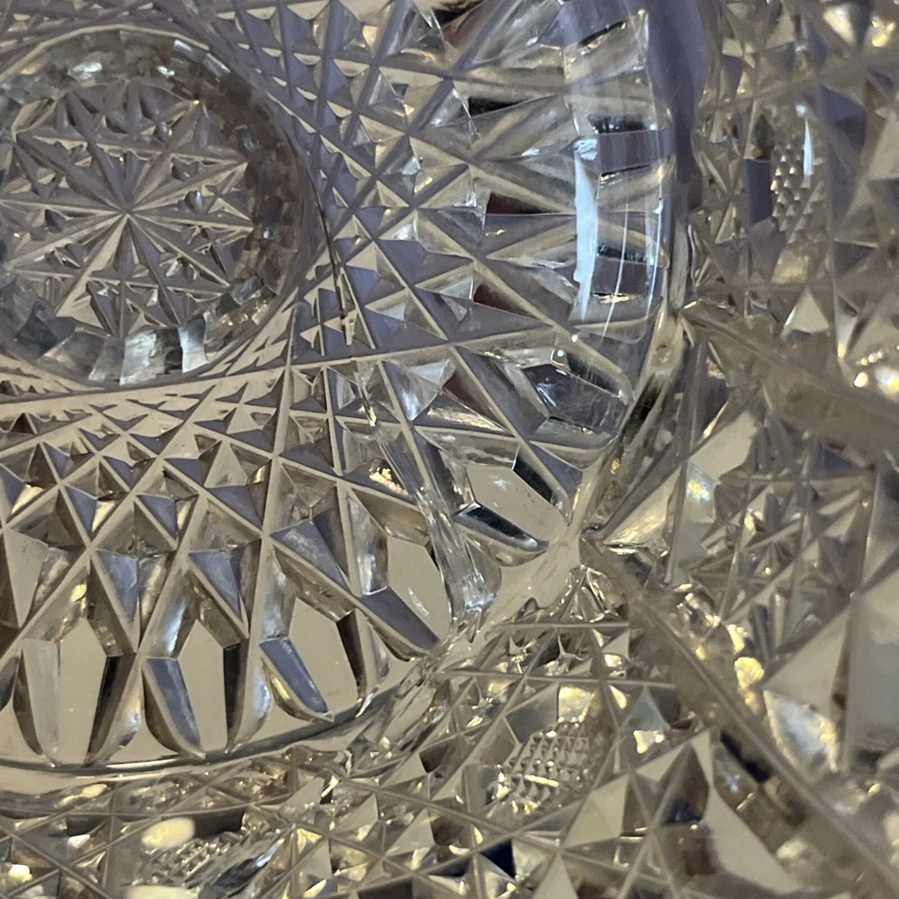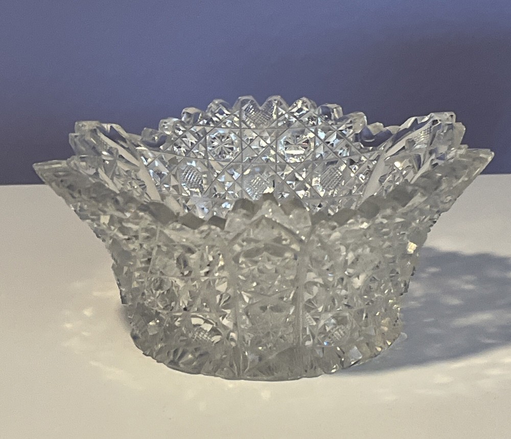 Vintage Brilliant Cut Daisy Buttons Bowl or Punch Bowl Stand - 6" diameter on open "top" portion of bow, 2.5" tall, 3.5" diameter on bottom or flat portion. This once glorious piece still have much life for display and use. It is cracked as seen in pictures so priced accordingly. The pattern picks up the light and you can feel the hand cut crystal when you pick up the piece. It's a unique pattern combo with what appears to be Daisy and Buttons interchanged with Hobstar as you go around the bowl, and it has a unique scallop at the top where it differs for these various sections. Please review all pictures carefully as they are part of the description. Questions are welcome.