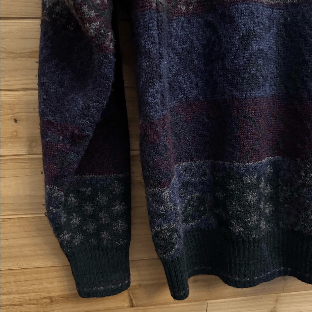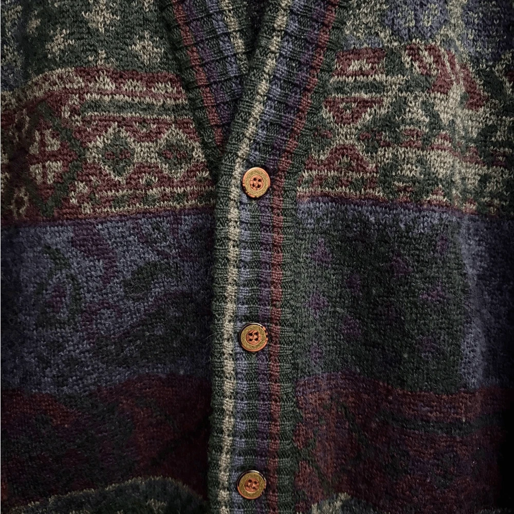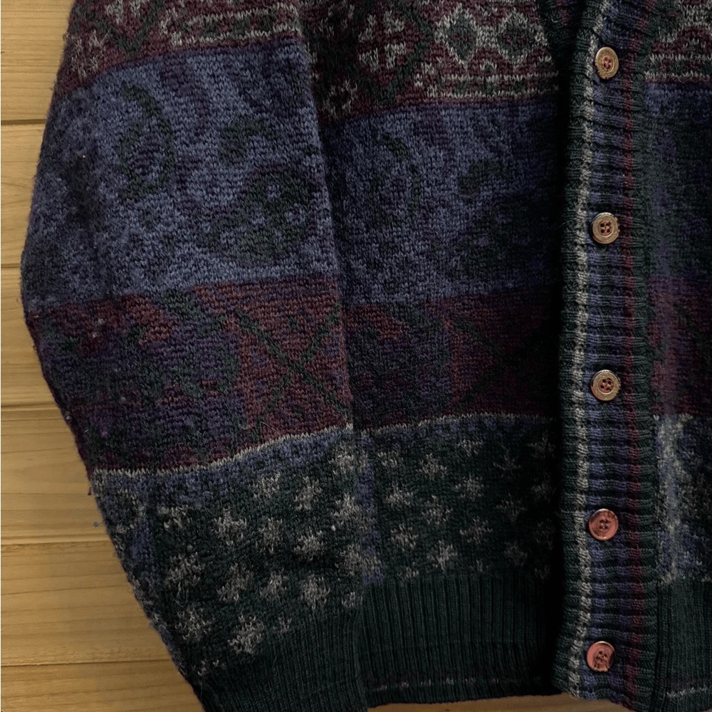 Dark Blue Purple Greens Jewel Toned Patchwork Striped Patterned Virgin Wool Gender Neutral Eclectic Grandpa Button Front Cardigan Sweater M aterials: 100% Pure Virgin Wool Measurements In Inches: Pit To Pit: 21 Length: 28