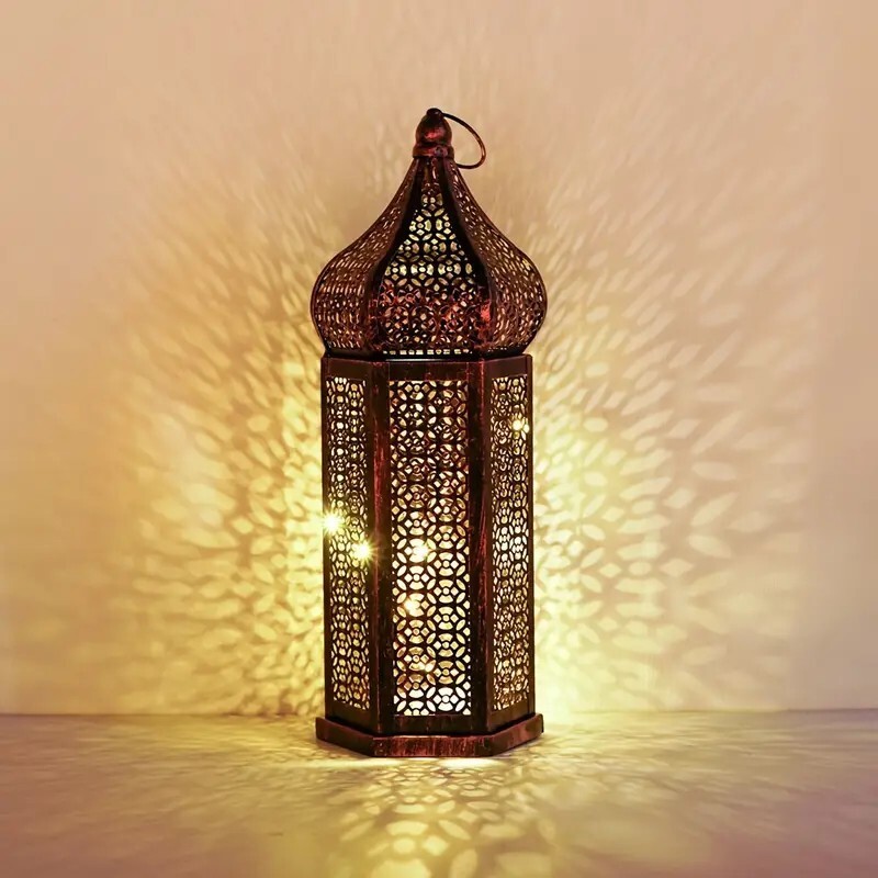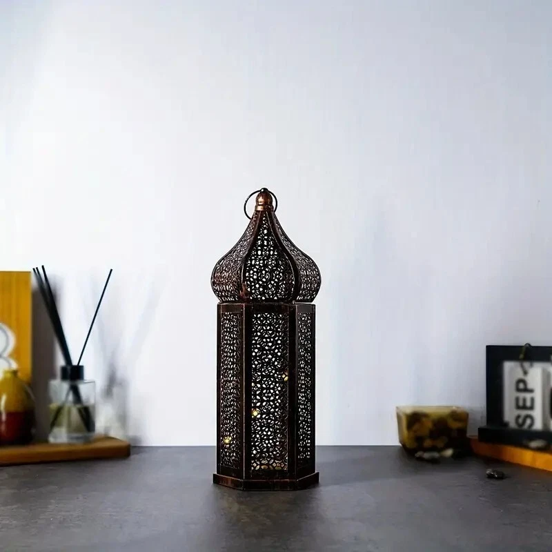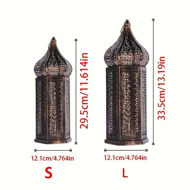 Vintage Moroccan LED Lantern is a beautifully crafted decorative lamp designed to add a touch of rustic charm to any space. This lantern is made from high-quality metal and features an intricate filigree design that casts a warm, inviting glow when lit. The detailed craftsmanship creates a stunning pattern of light and shadows on the surrounding surfaces, enhancing the ambiance of your home, office, or tabletop. The lantern has a hexagonal base and a domed top with a loop for hanging. The dimensions of the large lantern are approximately 13.91 inches (33.5cm) in height, 4.764 inches (12.1 cm) in width, and 4.764 inches (12.1 cm) in depth (Batteries Not Included).