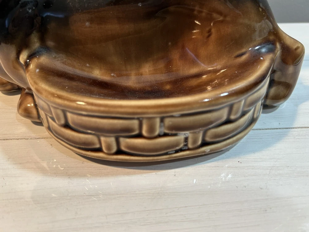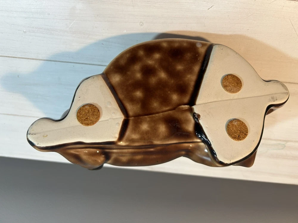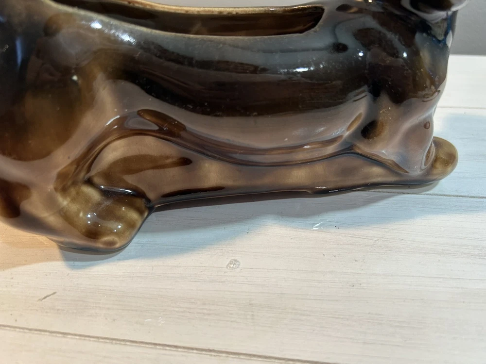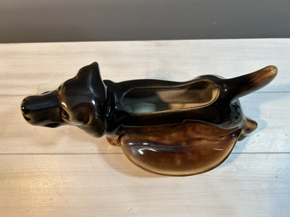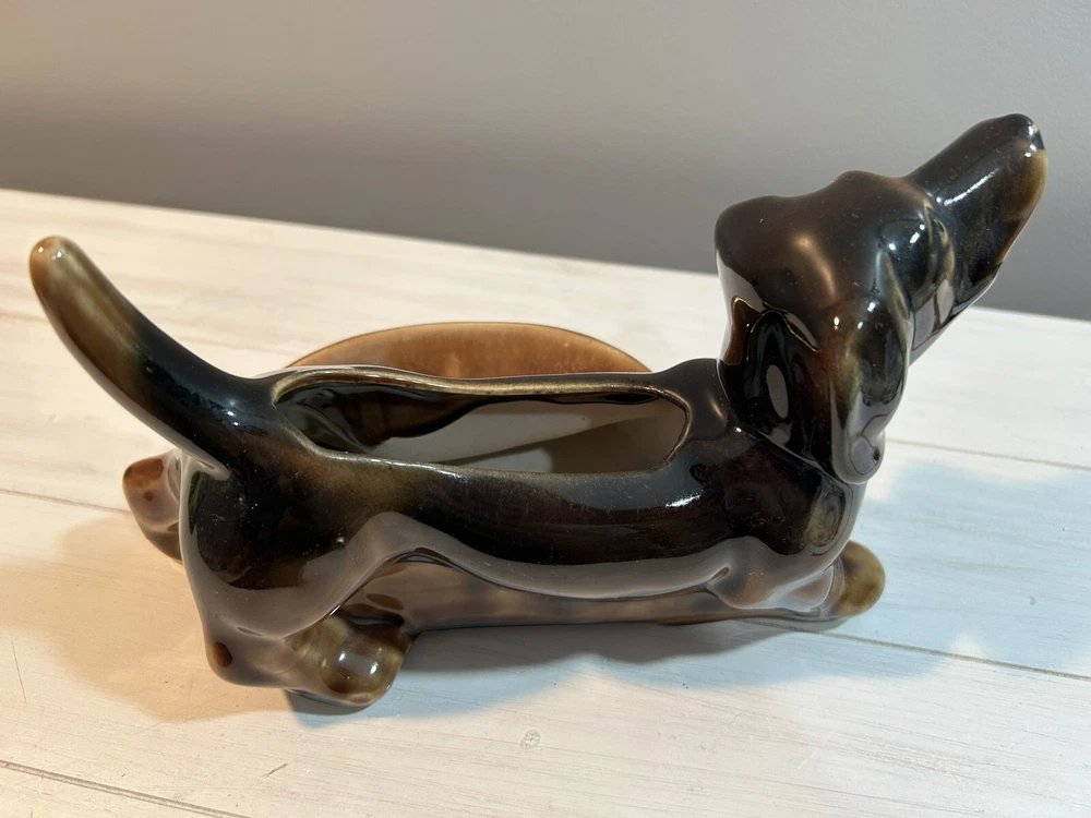 This vintage brown Dachshund Weiner Dog ceramic planter trinket dish MCM figurine is a charming collectible featuring a Dachshund figurine in a planter design. It is made of porcelain and showcases a Mid-Century Modern aesthetic. The Dachshund breed is depicted in a lifelike manner, making it an appealing piece for dog lovers and collectors alike. Its dual functionality as both a decorative figurine and a planter or trinket dish adds versatility to its usage. Measures 9 inches long, 6 tall, planter portion is 3 inches deep. Excellent condition no flaws