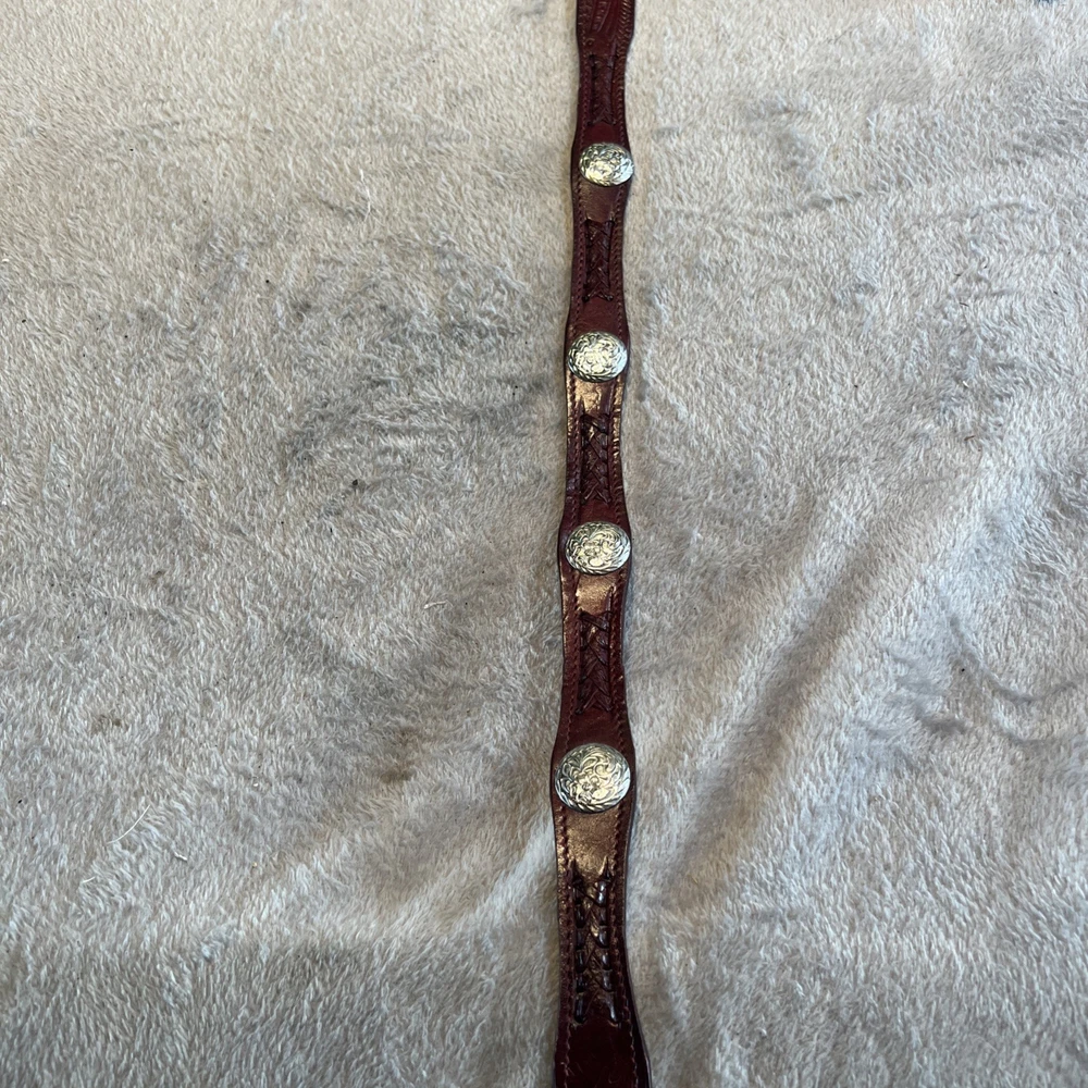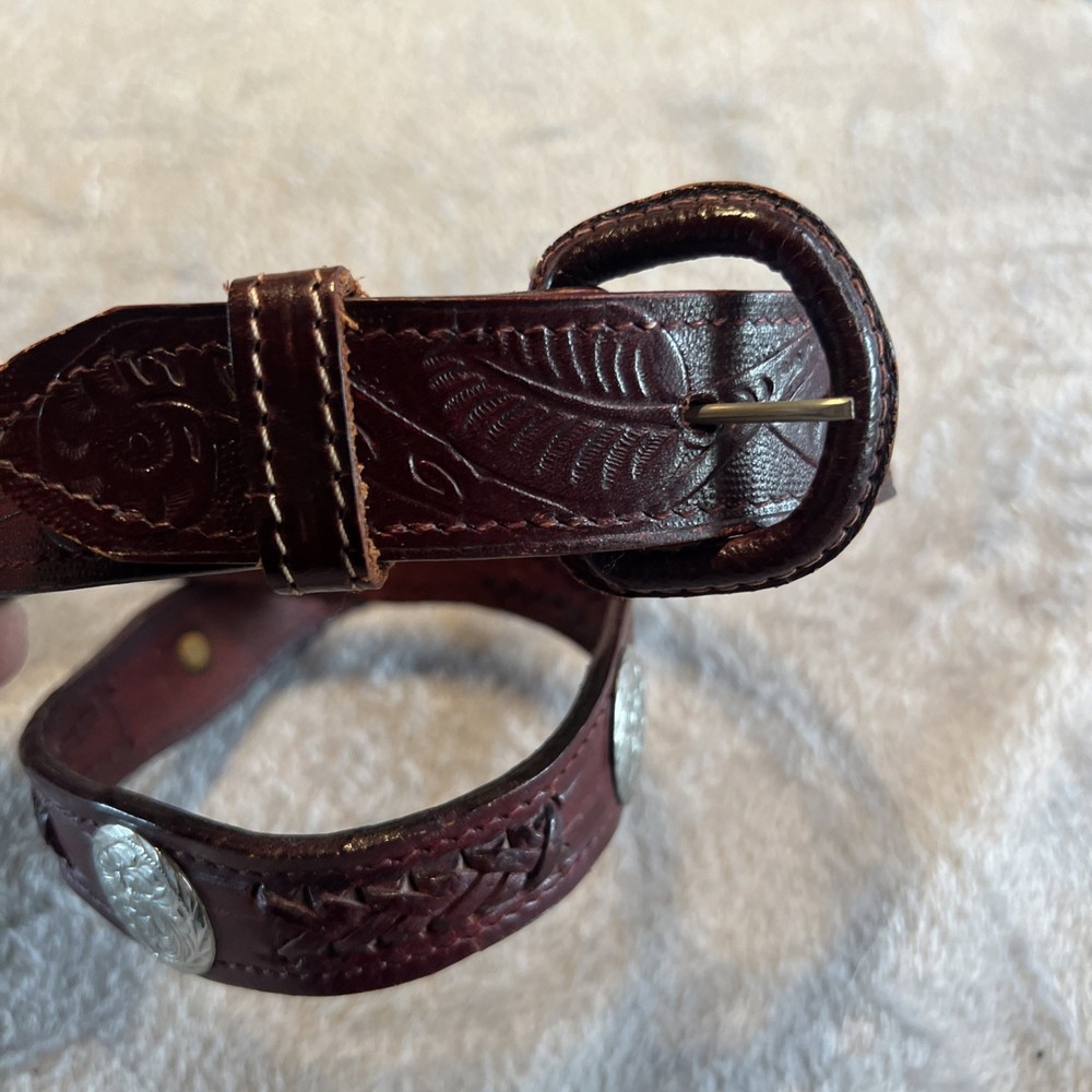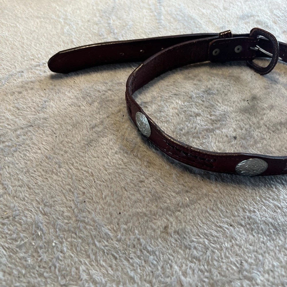 This vintage brown western style belt with conchos in size 30 is made of leather with studded accents, giving it a unique and stylish look. The 1-inch belt width and western-themed hardware make it a classic piece for both men and women. Perfect for adding a touch of cowboy flair to any outfit, this belt is a timeless accessory for those who appreciate vintage American style.
